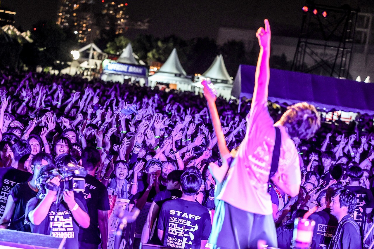 ここまでのアーティストの爆発力を目の当たりにし、《無力な僕らにできるのは歌うことしかないの》というフレーズが耳に残るKALMAの「SORA」を聴いて、ロックバンドの果たすべき役割がクリアに見えてきた。「ライブハウスの人間がやってる、血の通ったフェスに呼ばれるのがいちばん嬉しいです」とボーカルの畑山悠月は言う。忘れらんねえよも、頭空っぽで楽しめる初期衝動ソングを連打。「ばかばっか」では、ボーカルの柴田隆浩がフィールド後方にいる室のところへクラウドサーフで進み、「『ムロフェス』の出演者すべてが、これから100年バンドを続けていけますように!」と、受け取ったビールをオーディエンスの上で鮮やかに飲み干す。単純明快で清々しいパフォーマンスが、暑い海ステージをますます熱くする。