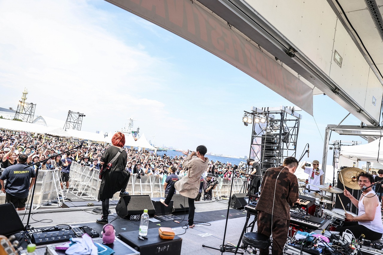 昼過ぎの芝生ステージを彩ったそんな2組に続き、海ステージでは石川県金沢市発のプッシュプルポットが、「愛していけるように」で《僕、歌で君を守るから》とまっすぐな言葉を放っている。太陽の真下で轟くエモーショナルな演奏とコーラスも熱量が半端ない。もみくちゃの観客ゾーンに飛び込んだボーカルの山口大貴。あまりの暑さに最後はフラつきながらも「生半可なライブをしたくてここに立ってるわけじゃない」と気概を見せ、《明日 生きてる保証はないから》の歌詞どおり、ラストの「バカやろう」までをフルスロットルで駆け抜けるさまに胸がすく。彼らの物販に行って、令和6年能登半島地震の募金をした。やはりバンドシーンの実情をこうして一挙に、しかも野外で堪能できる機会というのはそうそうない。