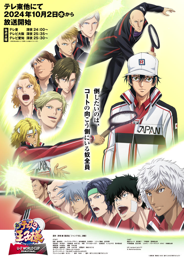 TVアニメ『新テニスの王子様 U-17 WORLD CUP SEMIFINAL』(アンダーセブンティーン ワールドカップ セミファイナル)が、2024年10月2日(水)からテレ東にて毎週水曜深夜24:00から、テレビ大阪にて毎週水曜深夜25:35から、テレビ愛知にて毎週水曜深夜25:30から放送されることが発表され、PVとキービジュアルが解禁された。