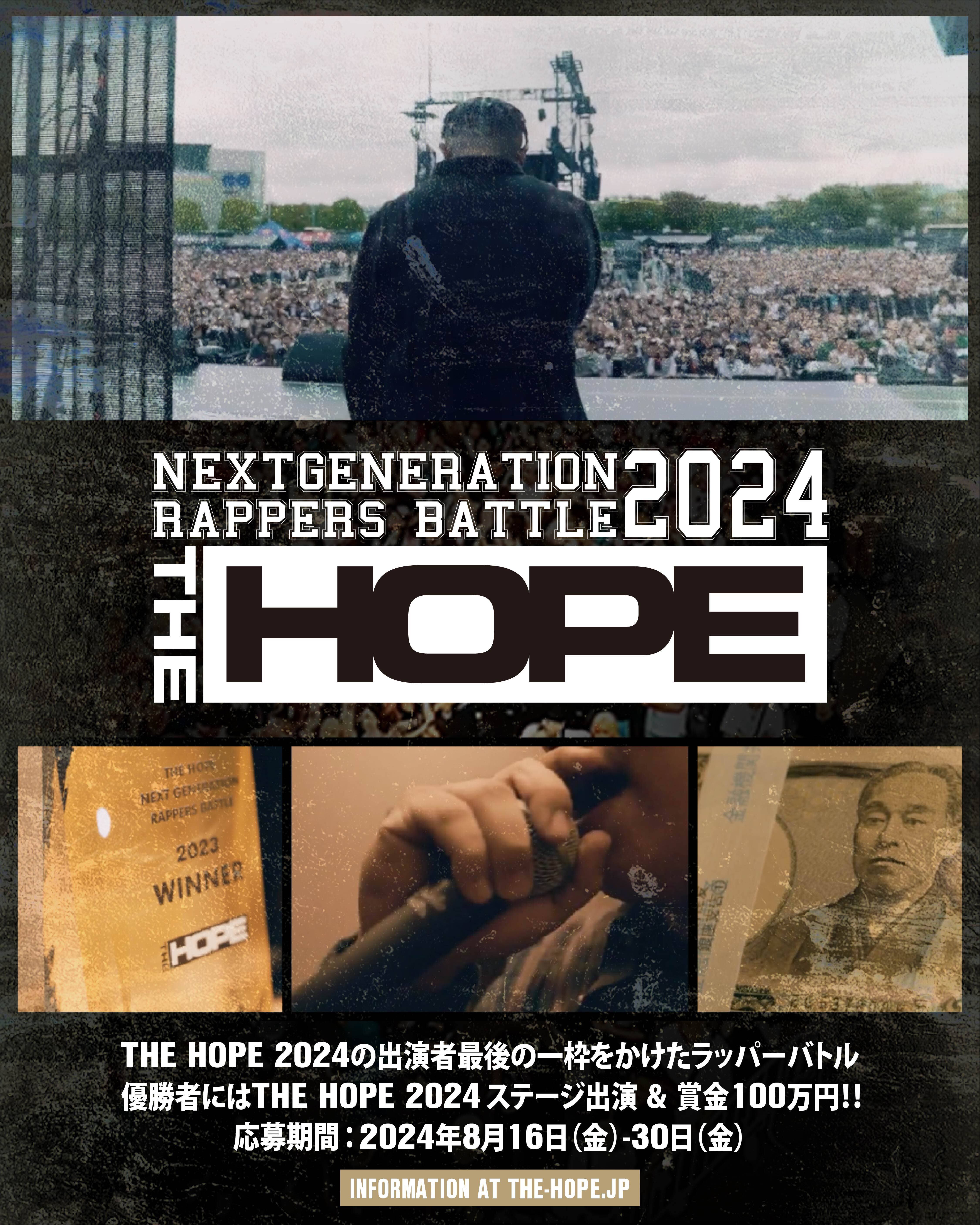 総勢58組のLIVEアーティストと、29組のDJがラインナップされた本フェスで、超豪華アーティストと共演のチャンスとして『THE HOPE』への最後の出演枠をかけたオーデションNEXT GENERATION RAPPERS BATTLE 2024 THE HOPEの開催が決定した。優勝者には出演枠と優勝賞金100万円が授与されるとのこと、腕に覚えがあれば是非チェックしてみてはいかがだろうか。