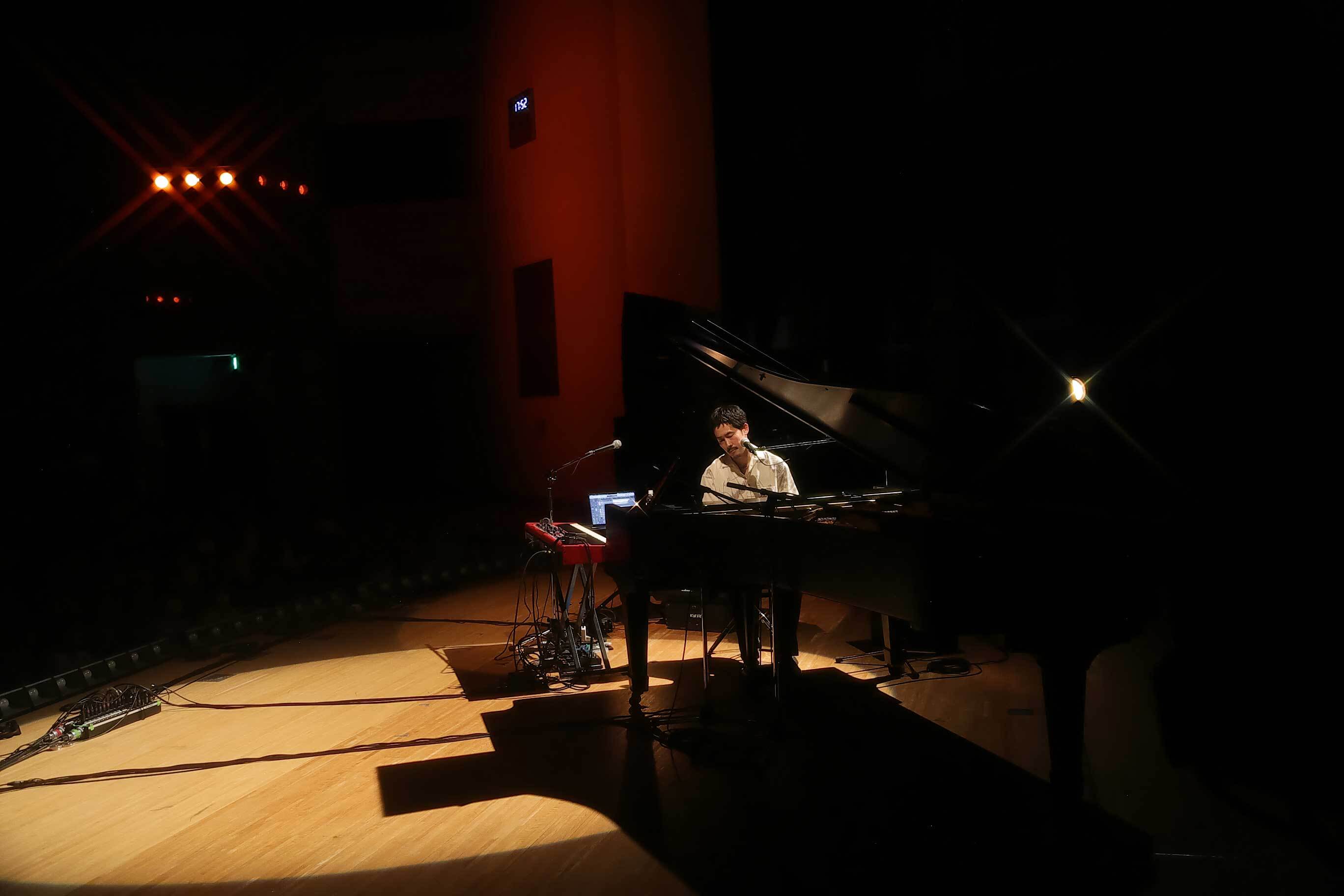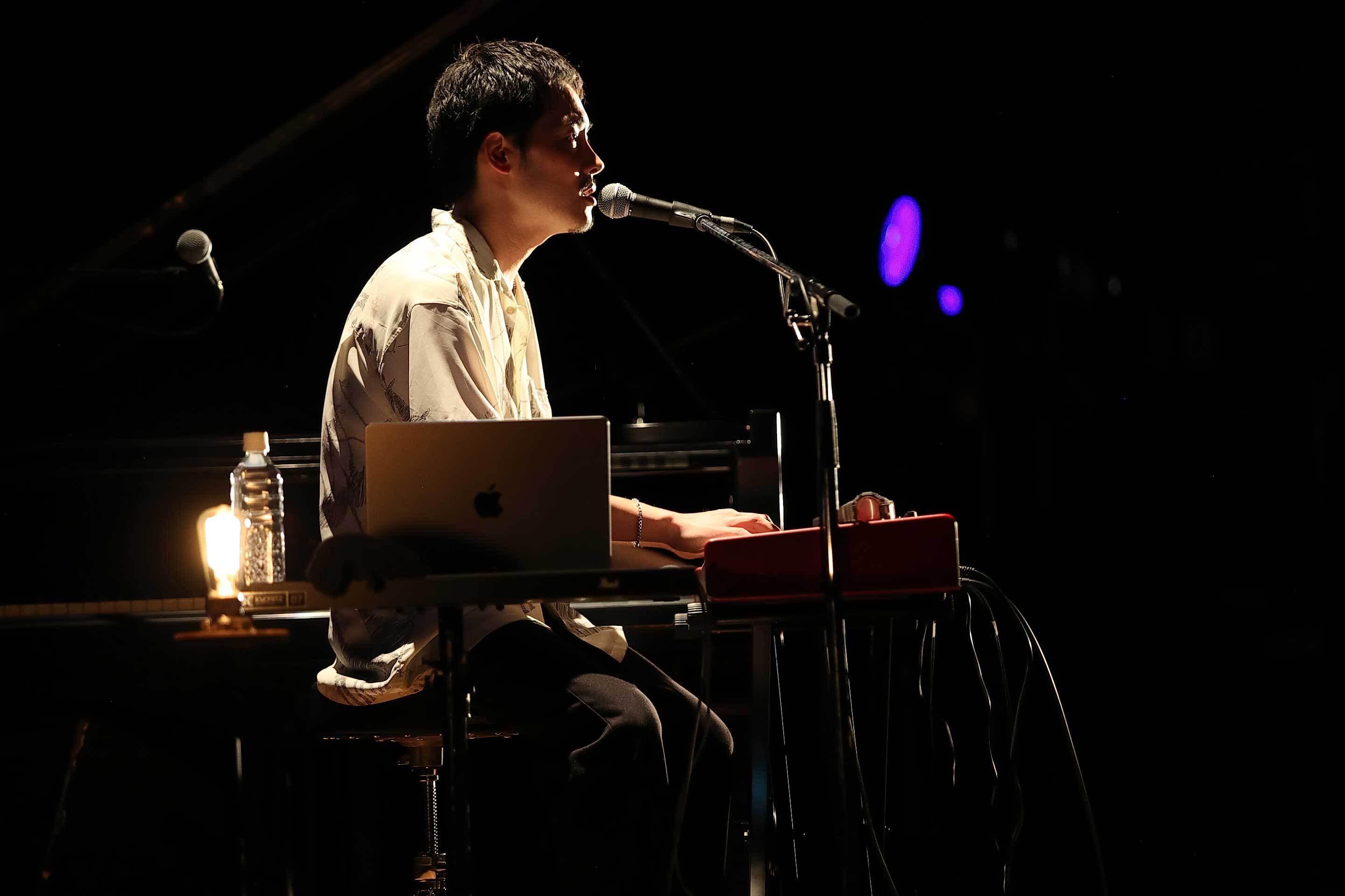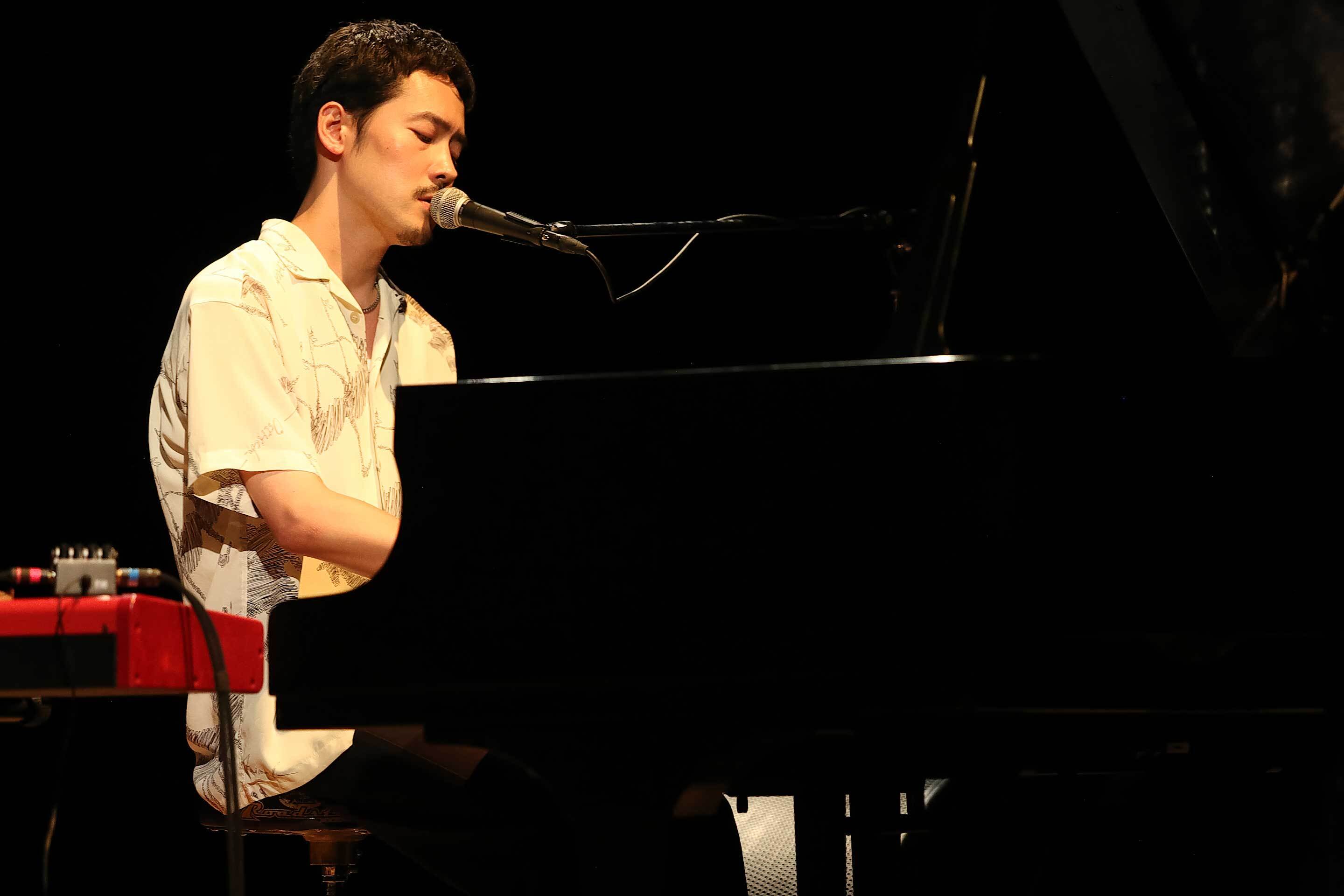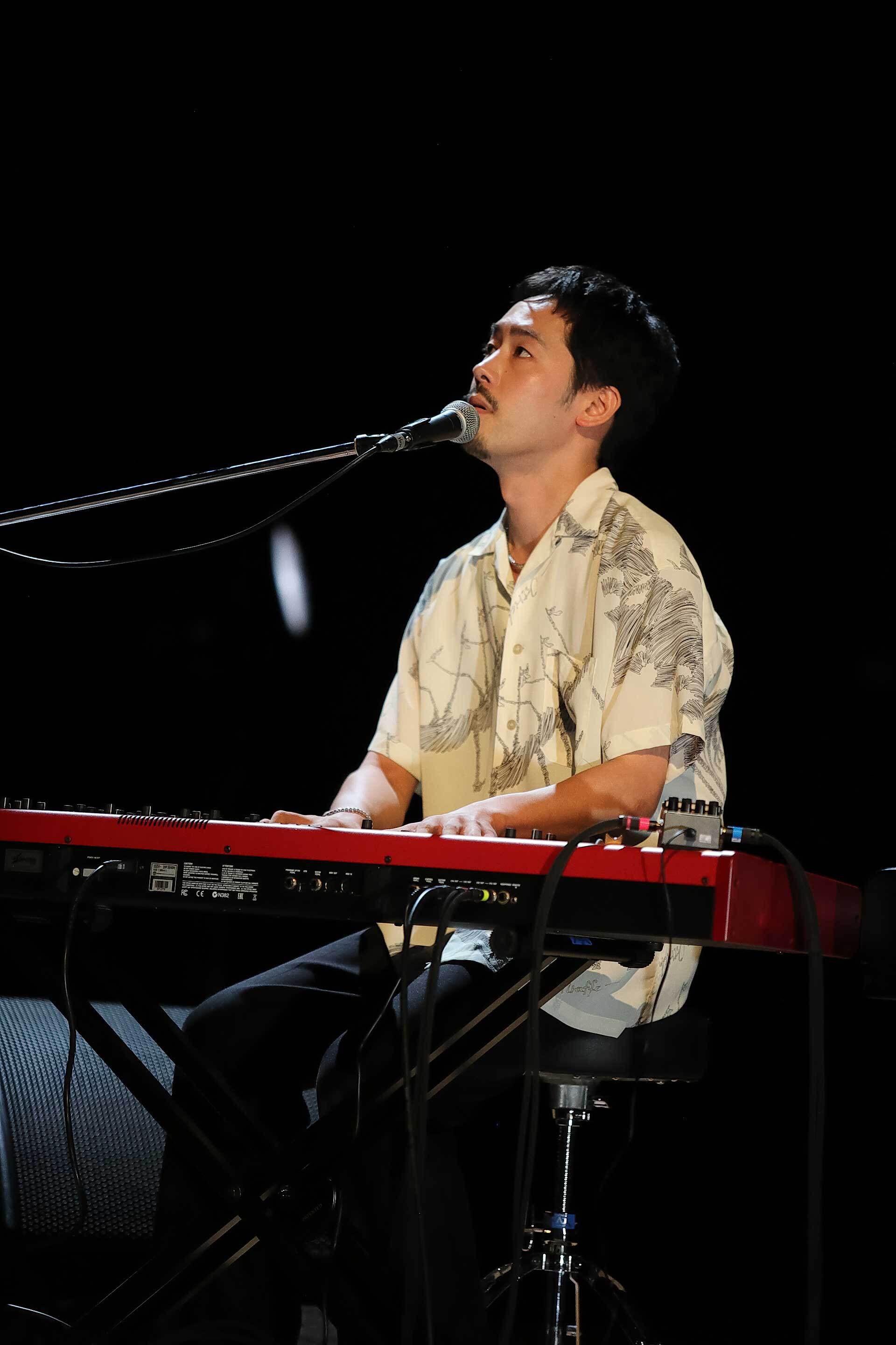 グランドピアノの後ろにあるパソコンにタッチして、同期の音と共に「MOON」へ。曲終わり、「ウッドベースの音が聴こえたと思うんですけど、僕の父親に弾いてもらっていて、パソコン上で父親を呼んでみたという」という粋な紹介を。下手側の観客に背中を向けていることや、グランドピアノを弾いていると発表会感があると笑いながら、弾き語っていくが、何とハナレグミ「家族の風景」が歌われる。突然の出来事にその場にいる全員が驚きながらも喜ぶ素敵すぎる光景に……。父親の話をしていただけにぴったりな選曲だが、そのまま「GIVE」が歌われるが、この曲は母親のために作ったという曲であることも打ち明けられる。この2曲は、にくすぎる流れであった。