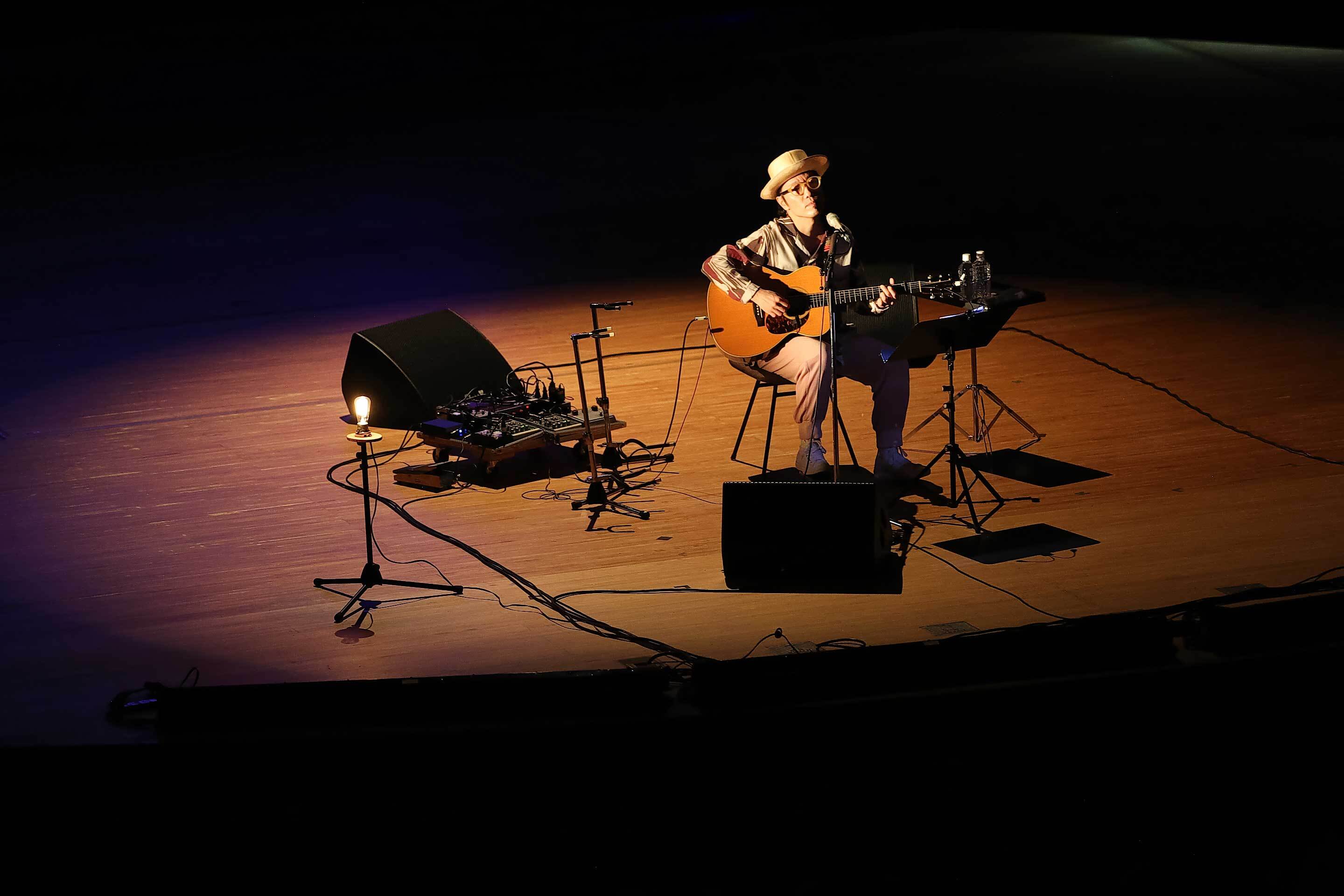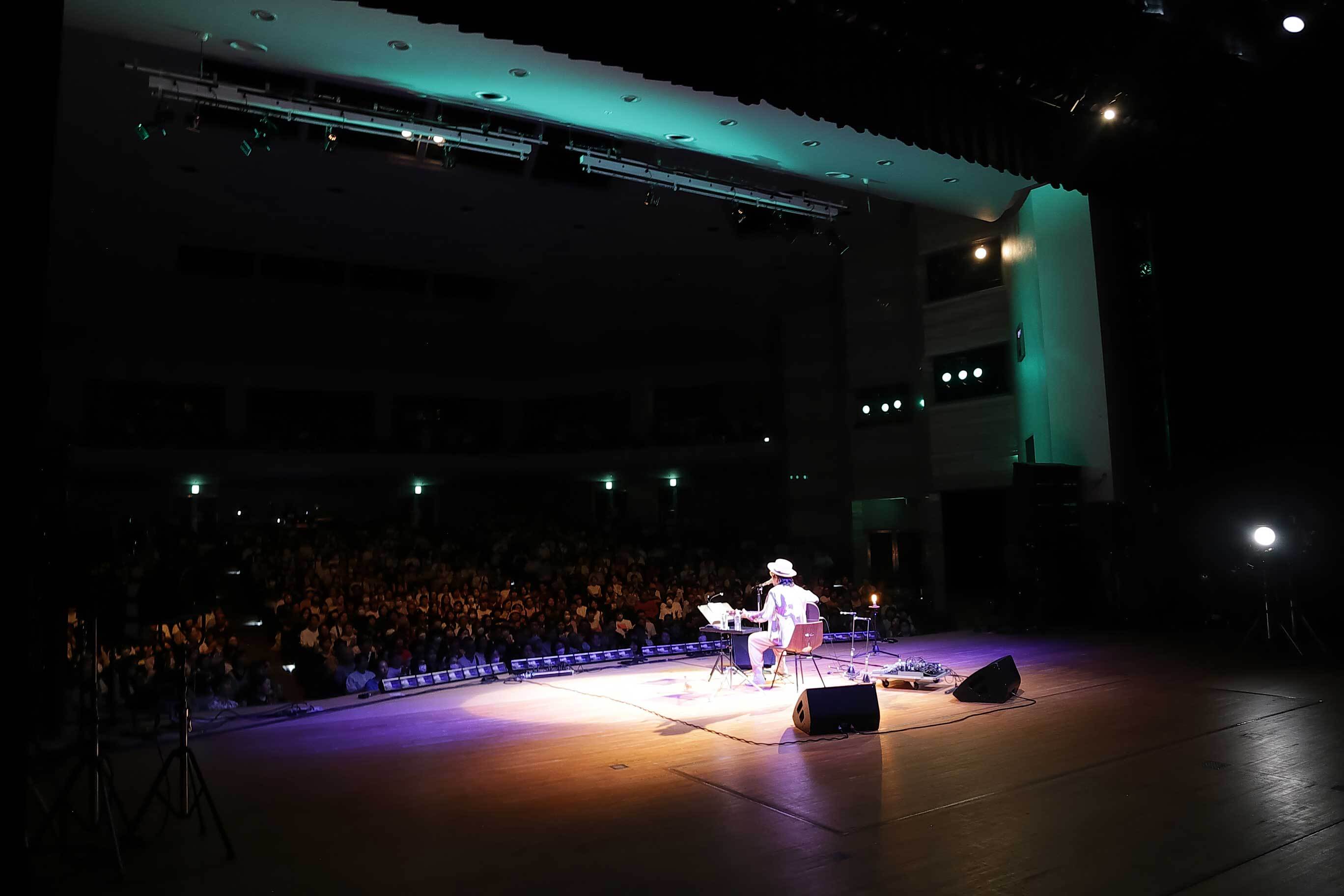 アコギを替えて爪弾くと、より音がホールに響く。涙、瓦礫、マンホール、悲しみ、前を向く若者といった言葉が散りばめられた詩を朗読していく。<THE WORLD IS HERE>、<帰る場所は未来しかない>という言葉が胸を打つ。そして、「音タイム」へと繋がっていく。歌われると大きな拍手が巻き起こり、歌い終わると、また大きな拍手と歓声が起きる。それは、まるでオペラやオーケストラコンサートの光景みたいで感激してしまう。そこからの「明日天気になれ」の流れは心地よすぎて、観客も手を上げたり、手を叩いたり、口ずさんだりと歌と一体になって楽しんでいる。曲終わり、歓声と指笛などがホールに大きく鳴り響き圧巻であった。