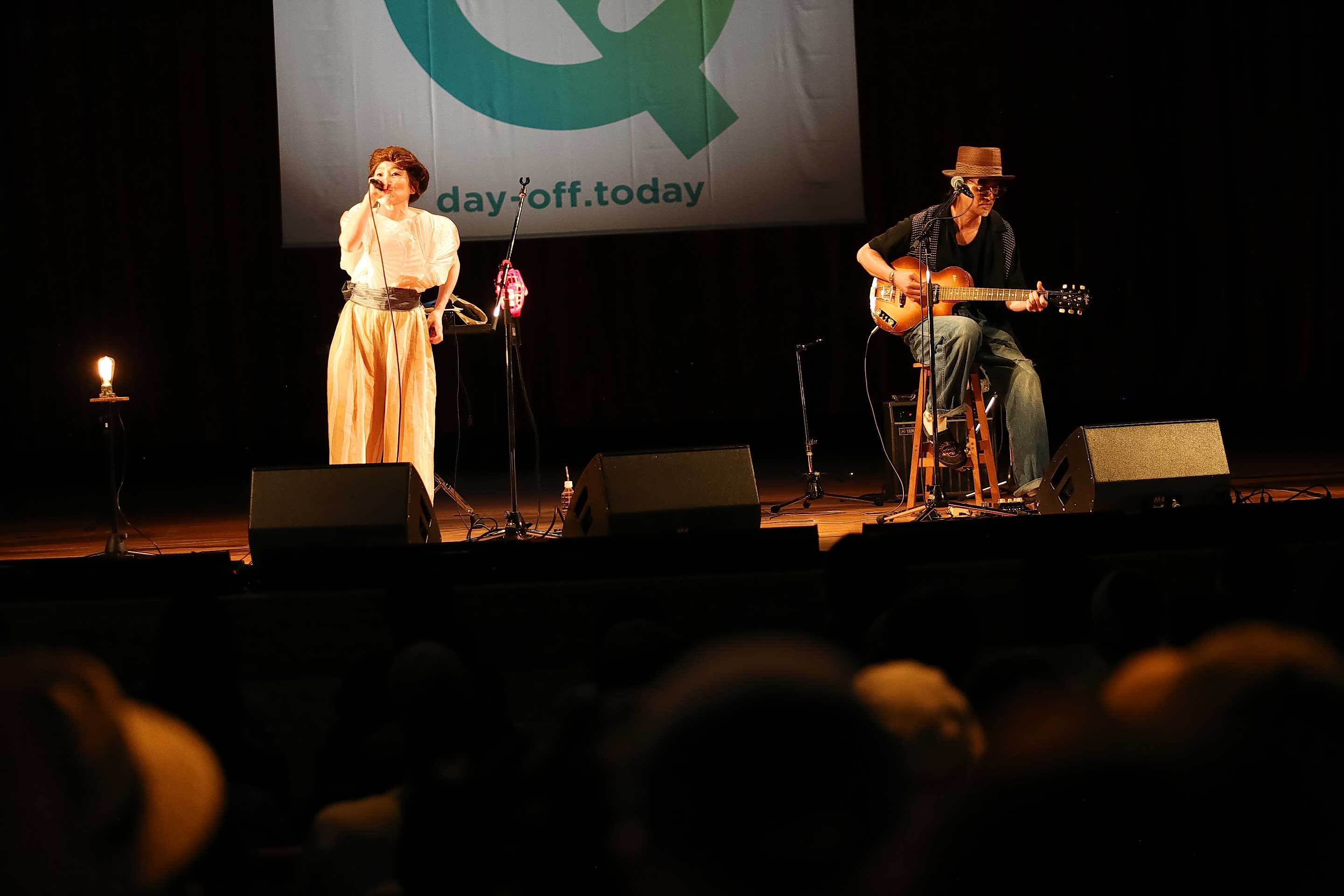 三番手の大トリはEGO-WRAPPIN’。中納良恵と森雅樹が舞台に登場する。すぐに森は「いい近さですね。楽しめていますか? もう金沢、梅雨が上がったみたいで今日が夏の一日目!」と話せば、中納も「出席取ります~!」とハナレグミに便乗して煽る。金沢でのふたりアコースティックライブは初めてながらも、駆け出しの頃から金沢のラジオで可愛がってもらい、個性的なDJが多かったが、一番アルバムを聴き込んでくれて愛を感じたなど振り返っていく。