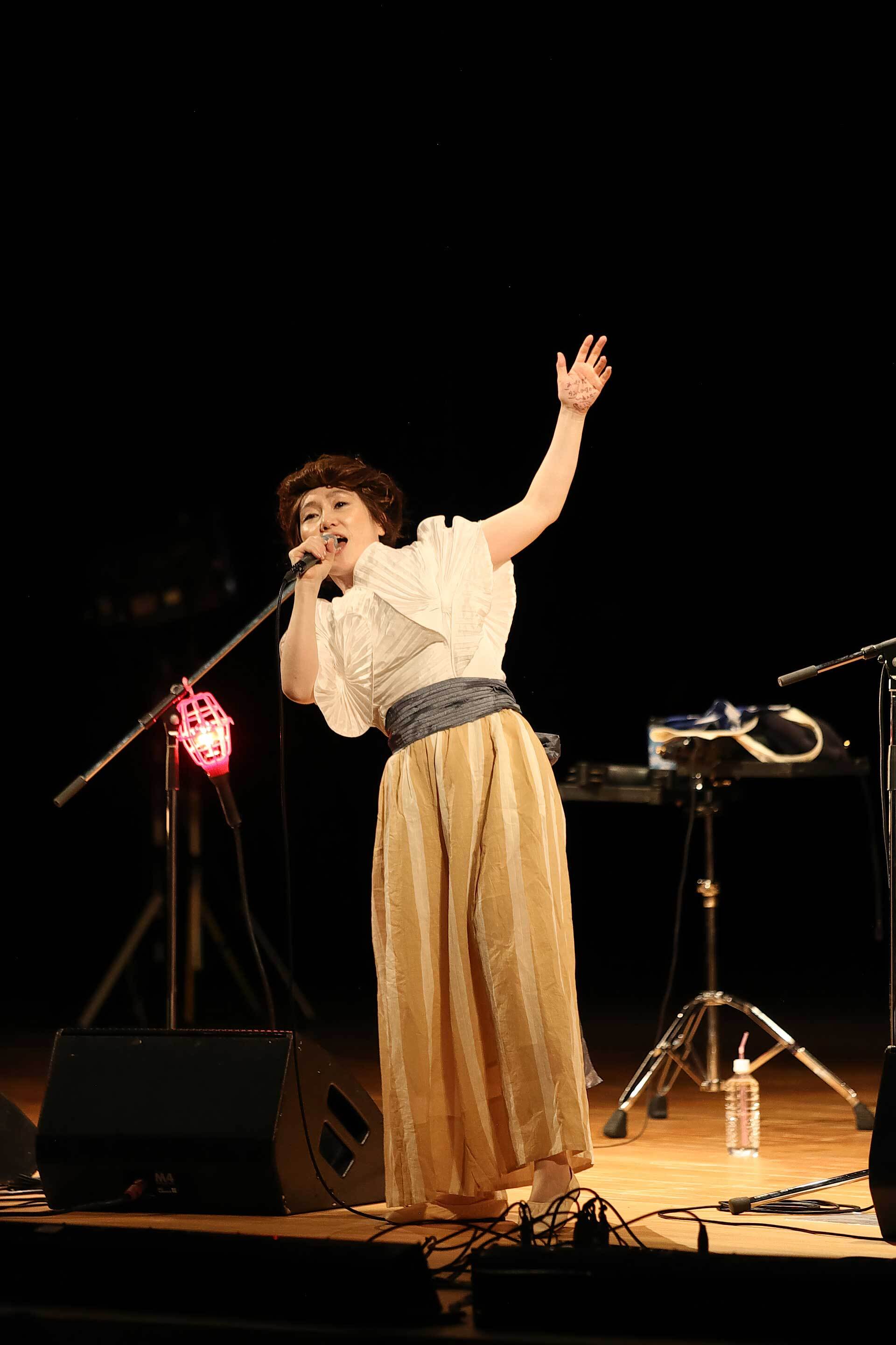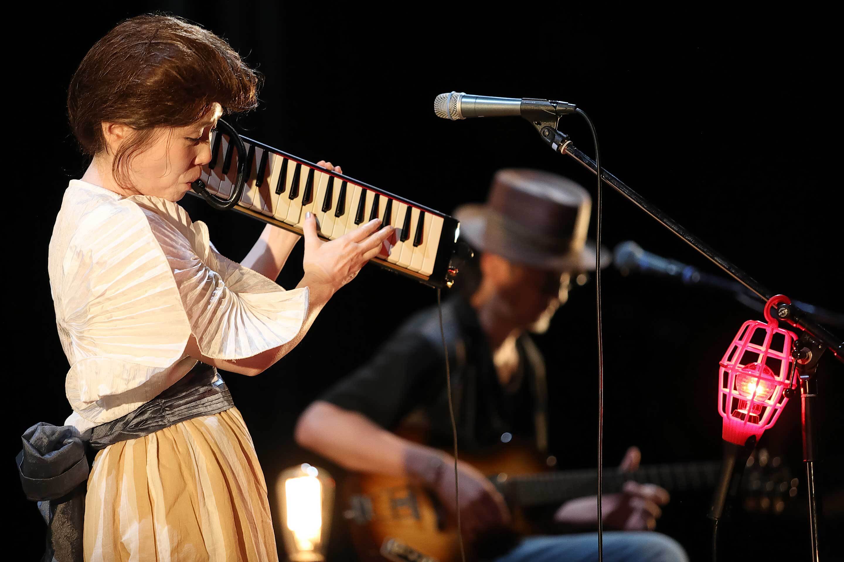中納は幸せのダンスを踊り出し、森は伴奏をつけていく。続く楽曲は「金沢にゆかりのある駆け出しの頃によくかけてもらった」という森の紹介から「a love song」へ。コール&レスポンスもあり、観客の元気さもまっすぐ感じられた。「やっと知っている曲が出てきた感じですか!?」と焚きつけて、中納は野生の動物の鳴き声みたいな神秘的な声でスキャットをしていき、「Neon Sign Stomp」へ。中納はカズーを吹き、黒いタンバリンも叩いていく。「今日はありがとうございました!」と言うと、あの温もりあるメロディーが聴こえてきた。ラストナンバーは「サニーサイドメロディー」。