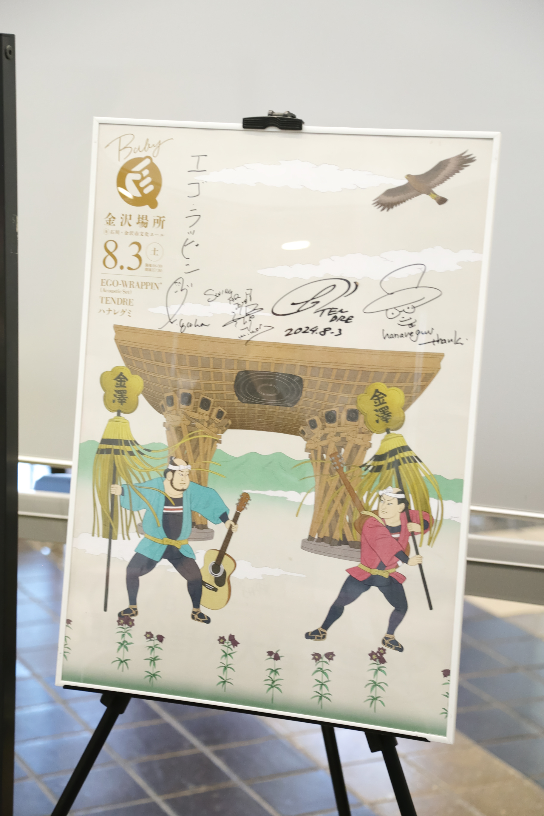 会場ロビーでは、厳選した能登の物産や『BABY Q 金沢場所』のオリジナルグッズ(エコバッグ、出演者のサイン入りポスター<限定>)が販売された。オリジナルグッズの売り上げは、製造費を除いて全額が能登半島地震の被災地に寄付される。主催者に話を聞くと、今年1月1日の震災が起きて、すぐに今回の開催を企画したという。全国を回るイベントだからこそ、各地への配慮を感じるし、意義のある金沢場所だと心から想った。