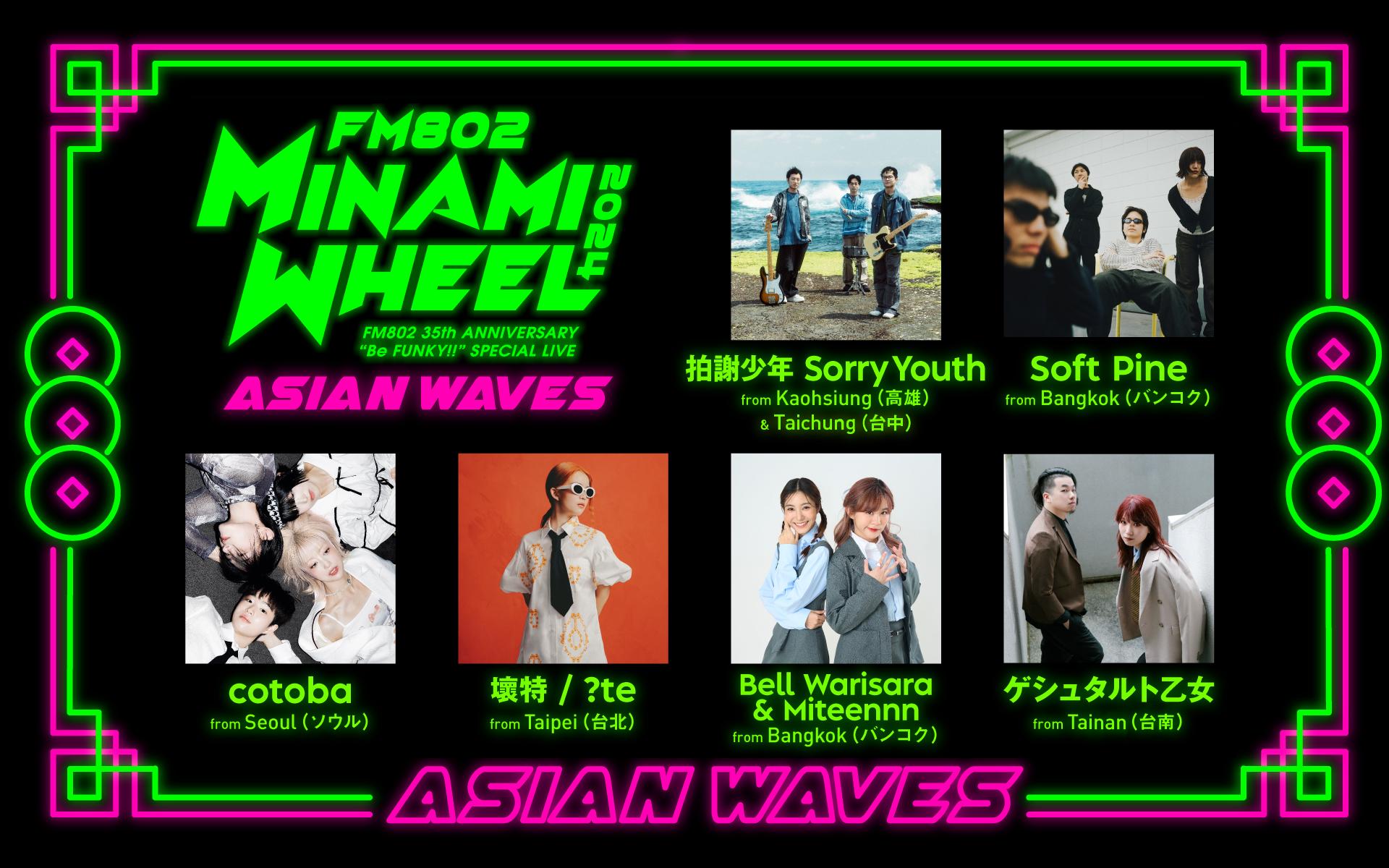 10月12日(土)~10月14日(月・祝)の3日間、大阪・ミナミエリア一帯の20会場以上のライブハウスに400組以上のアーティストが集結する『FM802 35th Anniversary “Be FUNKY!!” MINAMI WHEEL 2024』に、「ASIAN WAVES」と題し、アジアからの来日アーティスト6組の出演が決定した。