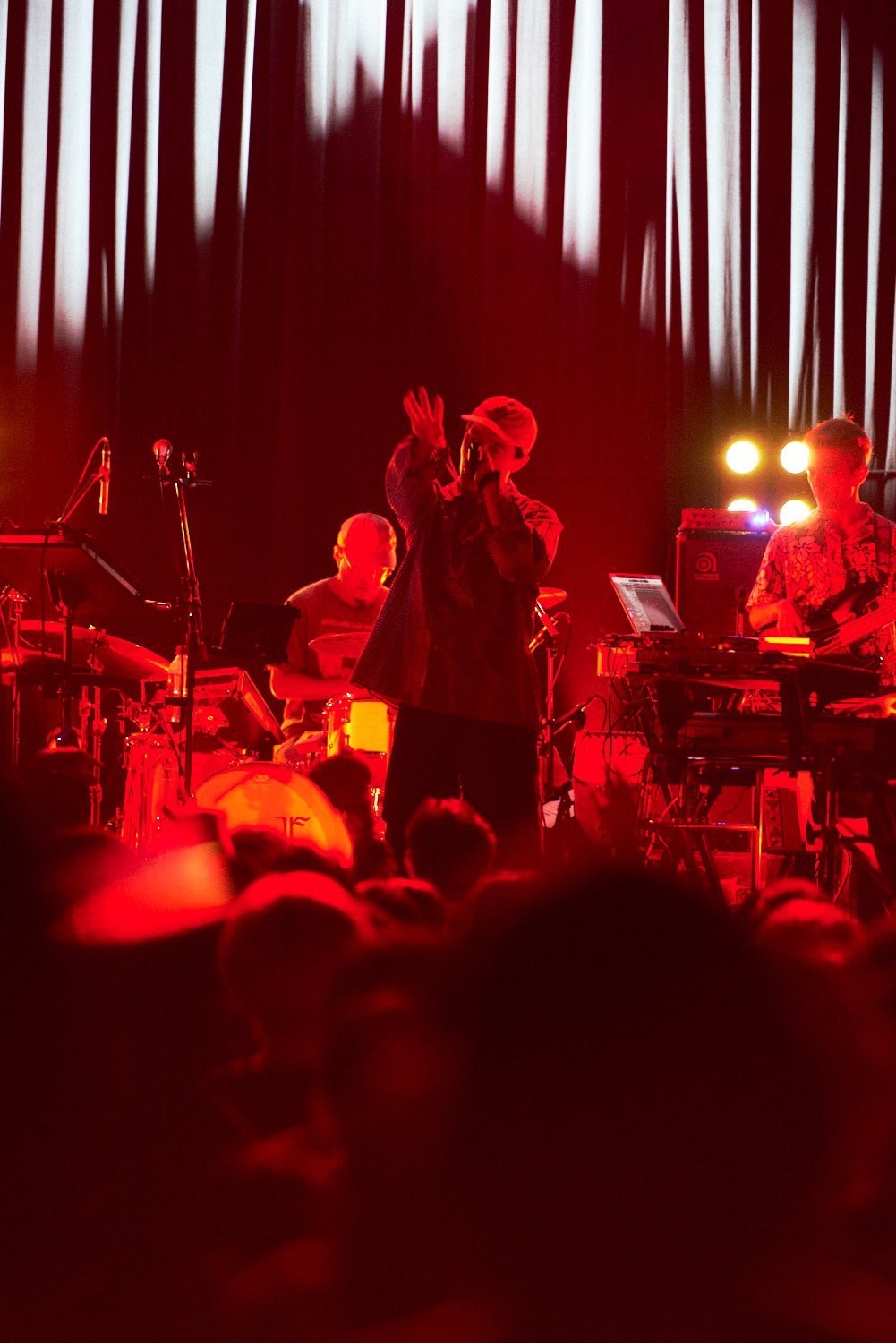 ステージ上に冂の字を描くように、上手から荒田洸(Dr)、井上幹(Ba)、長塚健斗(Vo)、江﨑文武(Key)と楽器が並ぶ。WONKのステージは挨拶抜き、「Fleeting Fantasy」のタイトなリズムと饒舌なピアノ、長塚のアダルトオリエンテッドなソウルボイスでゆったりと幕を開けた。2曲目には早くも未発表の新曲をプレイ、タイトルはわからないが、歌詞を聴く限りメッセージ色の濃い楽曲のようだ。長塚のエフェクティブなボーカルと口笛が印象的な「Euphoria」から、ベースとギターの両方を操る井上の、繊細なギターの爪弾きが耳に残る「Nothing」へ。曲が終わると長塚が「ありがとう」と言うのみで、MCもアクションもほぼない代わり、音がすべてを物語る。誰もが立ちつくしてステージを見つめる、実にストイックな、しかし居心地よさを感じる空間。