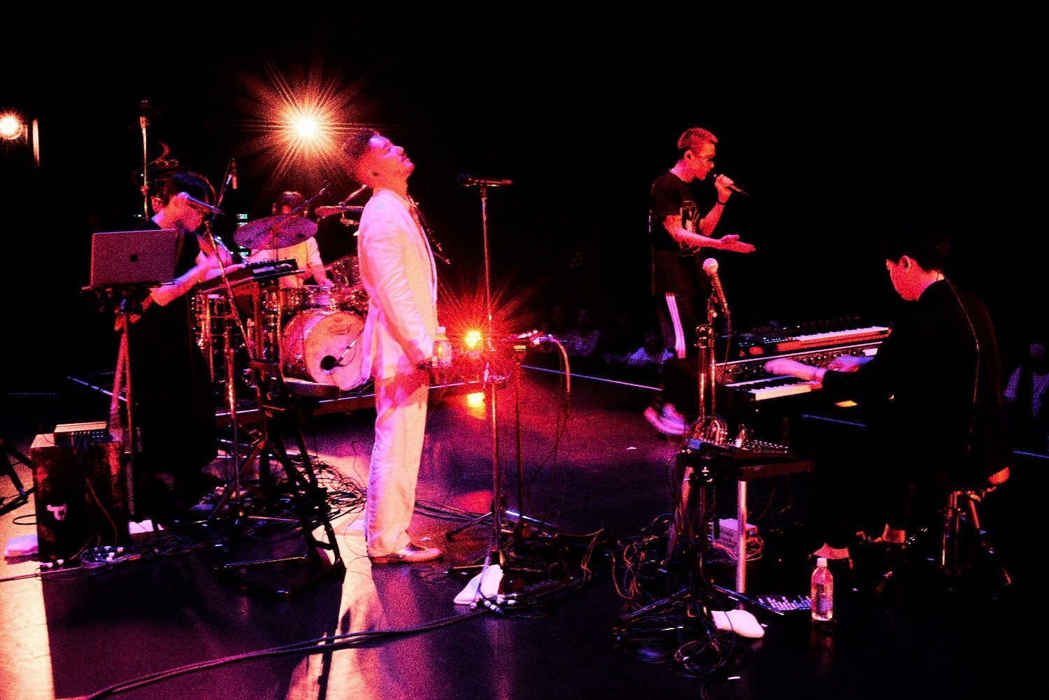 中盤ではさらなる新曲を。ゴスペルを感じる上品なスローバラードに、長塚の声がよく映える。アルバム『artless』からの「Butterflies」は、生音に加えて音響的なエフェクトを駆使した、彼らが掲げる“エクスペリメンタル・ソウル”にふさわしい1曲。波のように揺れる音の上で、漂うように浮かぶ長塚の声。そこから一気にテンポを上げ、「EYES」では自然発生で手拍子が沸き起こった。打ち込みかと思いきや、複雑なリズムを易々と叩く荒田が凄い。音源ではプログラミングもふんだんに使うWONKだが、ライブだからこそメンバーのスキルの高さがよくわかる。