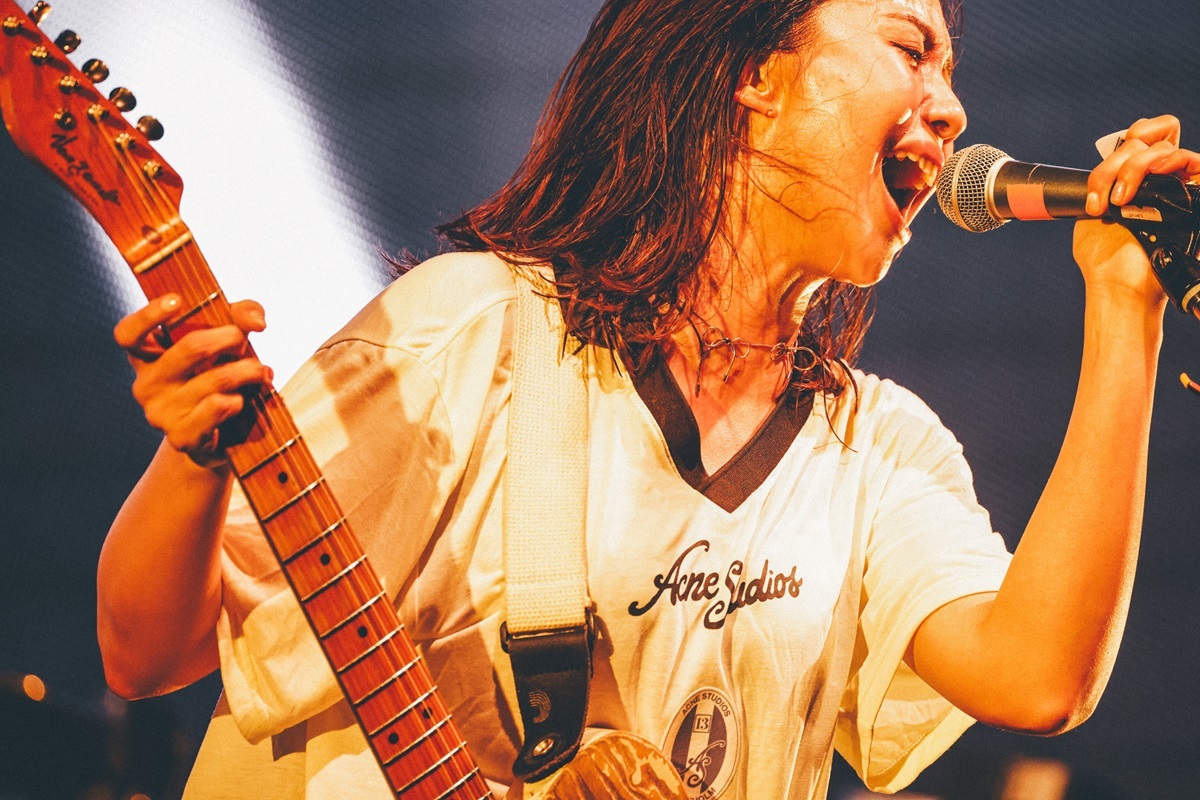 「後半戦もっと! もっと!」と上野が声を上げたその後半戦は、前半戦同様、ほとんど曲間を空けずに曲を繋げていきながら、アジテーションを思わせる歌と爆裂したサウンドに頭をぶん殴られた「6月」をはじめ、3人の演奏はロックバンドの矜持を見せつけるようにどんどん凄みを帯びていき、同時に歌いながら、いろいろな感情が溢れ出てくるのか、観客に訴えかける上野の言葉数も増えていく。