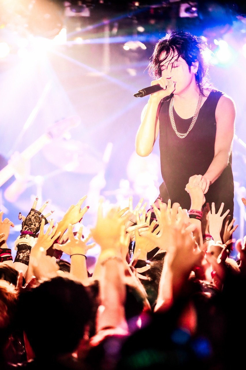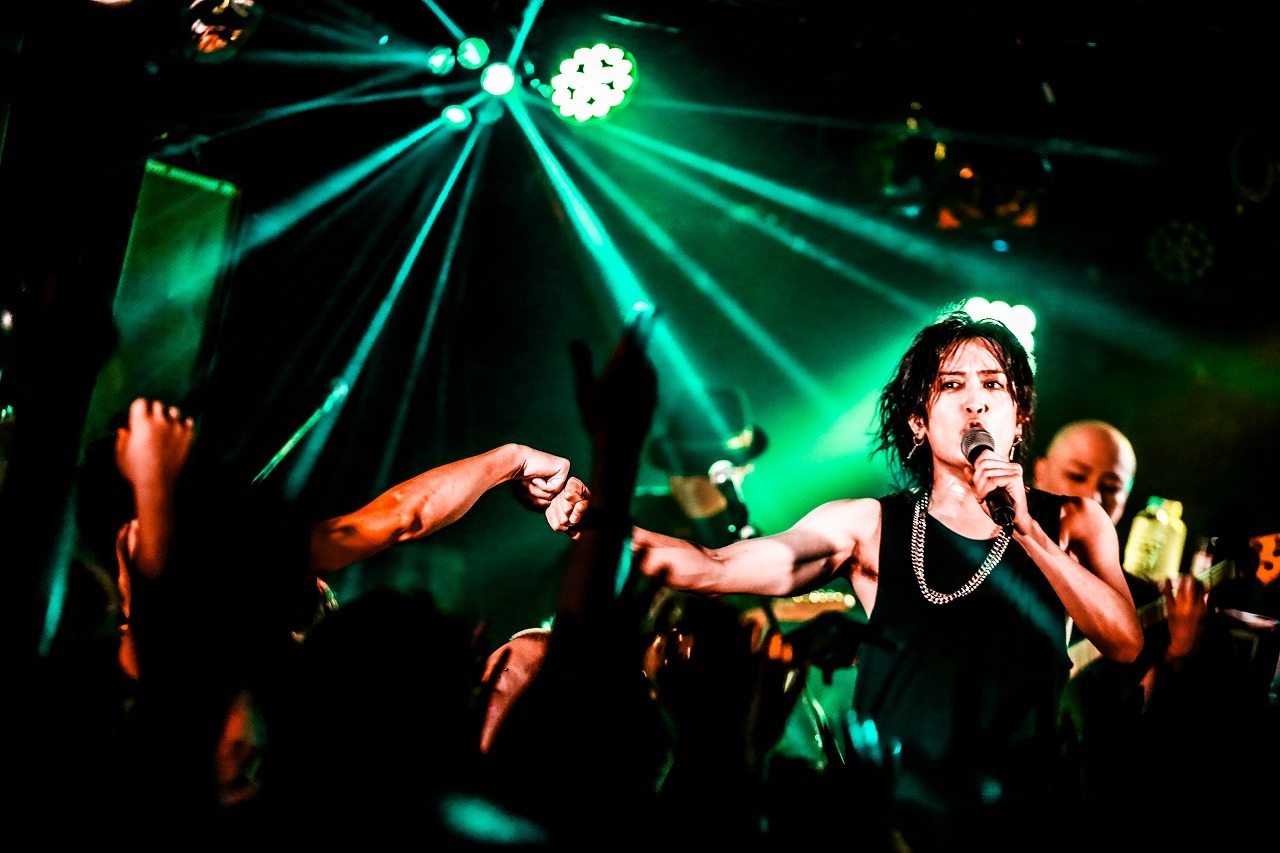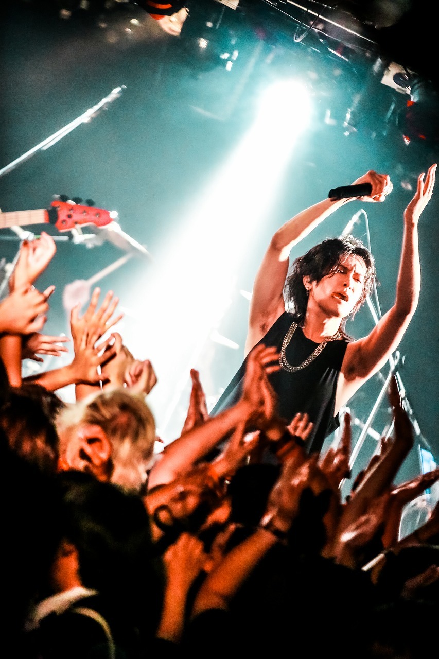 ステージを覆っていた幕が勢いよく開いてライブがスタート。眩しいライトで照らされた空間の真ん中に両腕を掲げた赤飯が立っていた。ギターのディストーションに負けないくらい歪んだ歌声が早くも冴え渡っていた「理想郷へおいでませ」から「人間の蕾」へと突入するとクラウドサーフがフロアからステージへと次々押し寄せ、その次の「見習いハーデス」は観客による無我夢中のクラップの嵐。懐かしい曲の連続によってノスタルジックなムードになるのかと思いきや、フレッシュで猛烈に熱いオープニングだった。