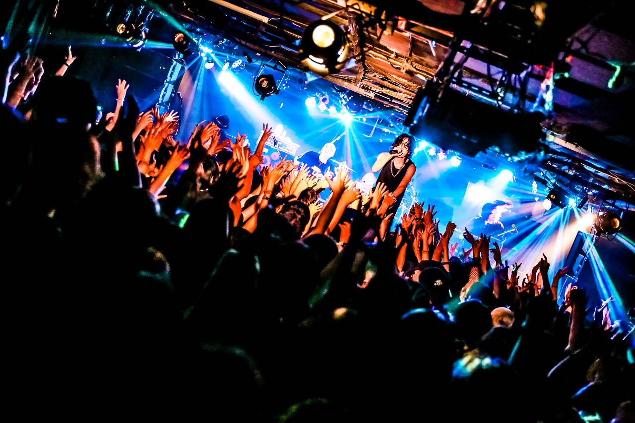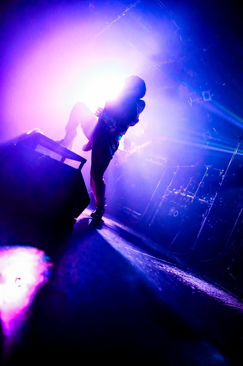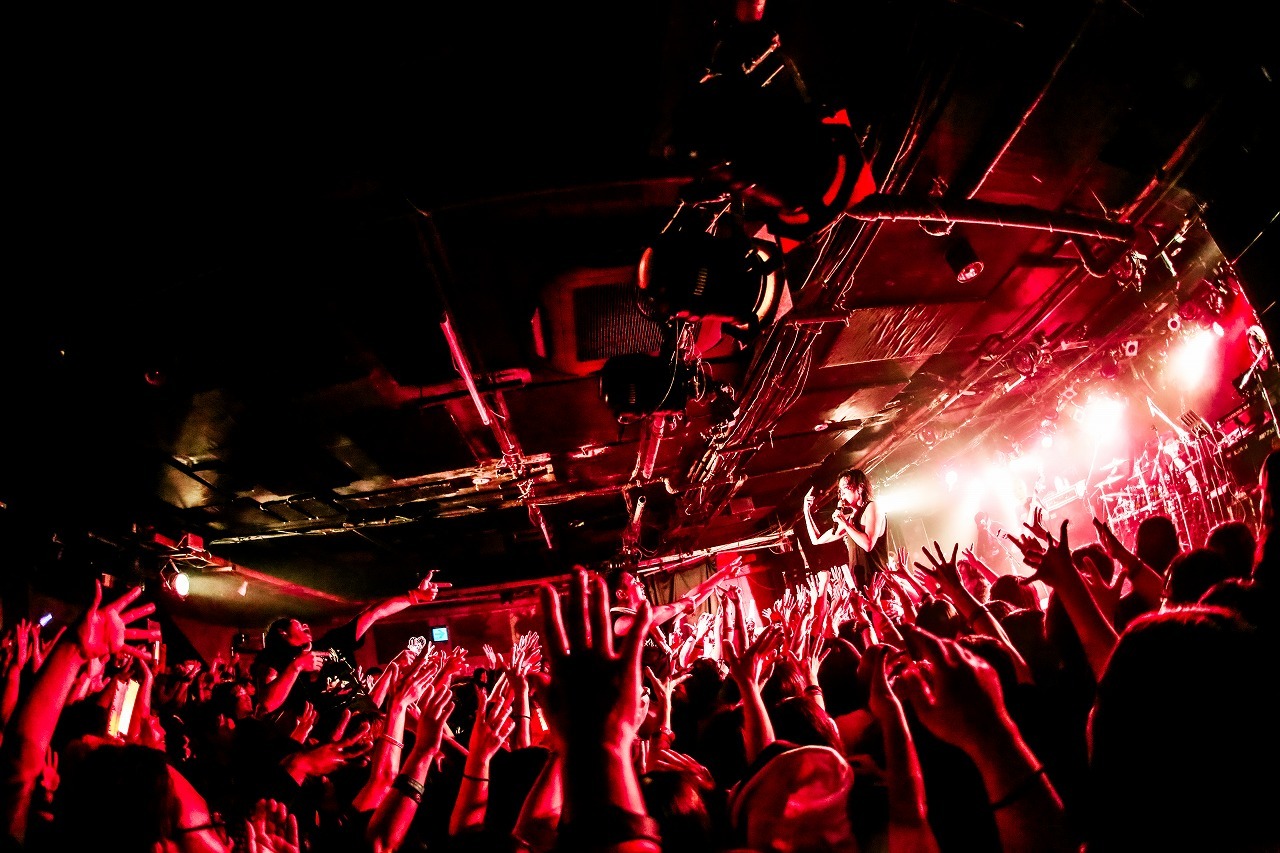 ステージを覆っていた幕が勢いよく開いてライブがスタート。眩しいライトで照らされた空間の真ん中に両腕を掲げた赤飯が立っていた。ギターのディストーションに負けないくらい歪んだ歌声が早くも冴え渡っていた「理想郷へおいでませ」から「人間の蕾」へと突入するとクラウドサーフがフロアからステージへと次々押し寄せ、その次の「見習いハーデス」は観客による無我夢中のクラップの嵐。懐かしい曲の連続によってノスタルジックなムードになるのかと思いきや、フレッシュで猛烈に熱いオープニングだった。