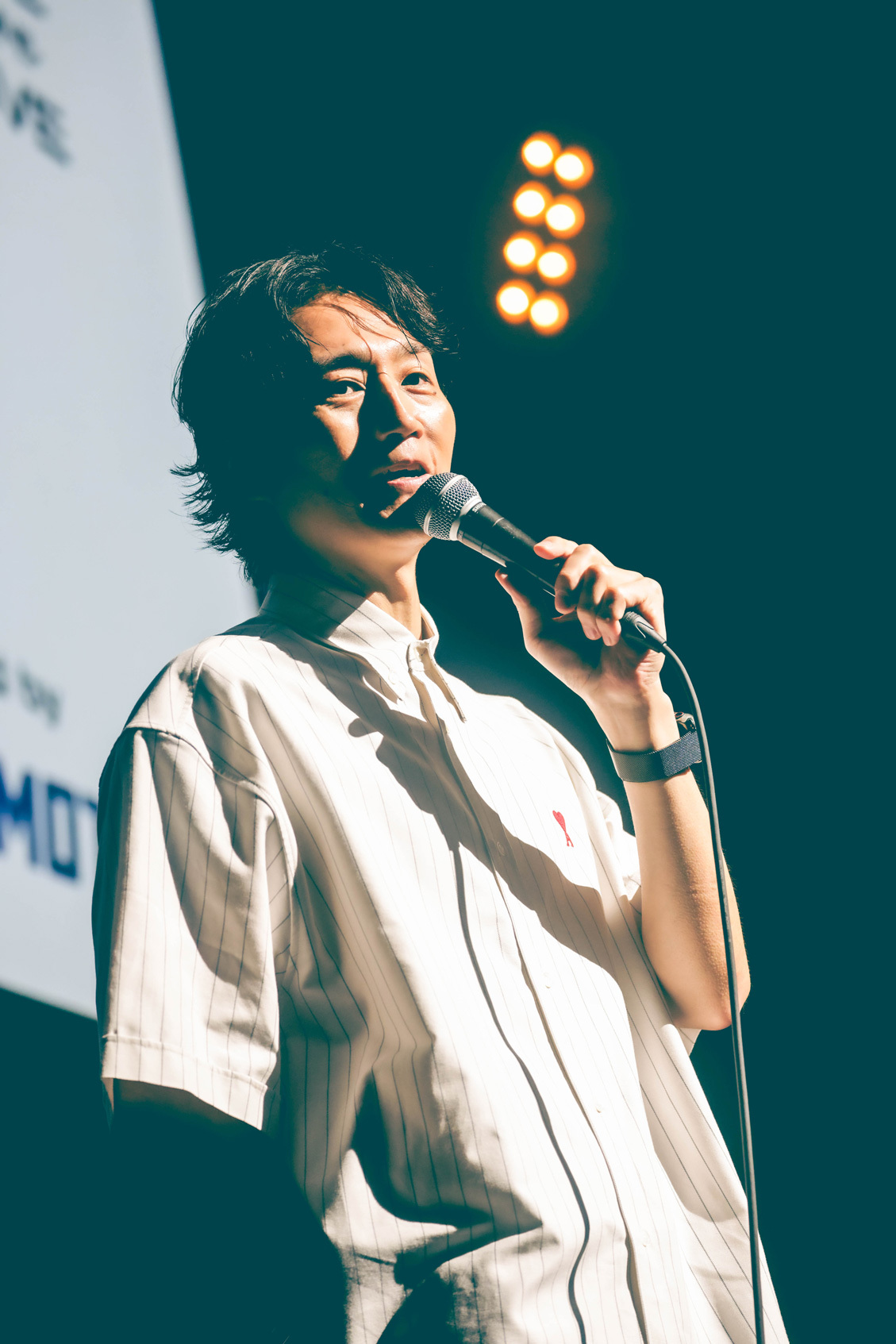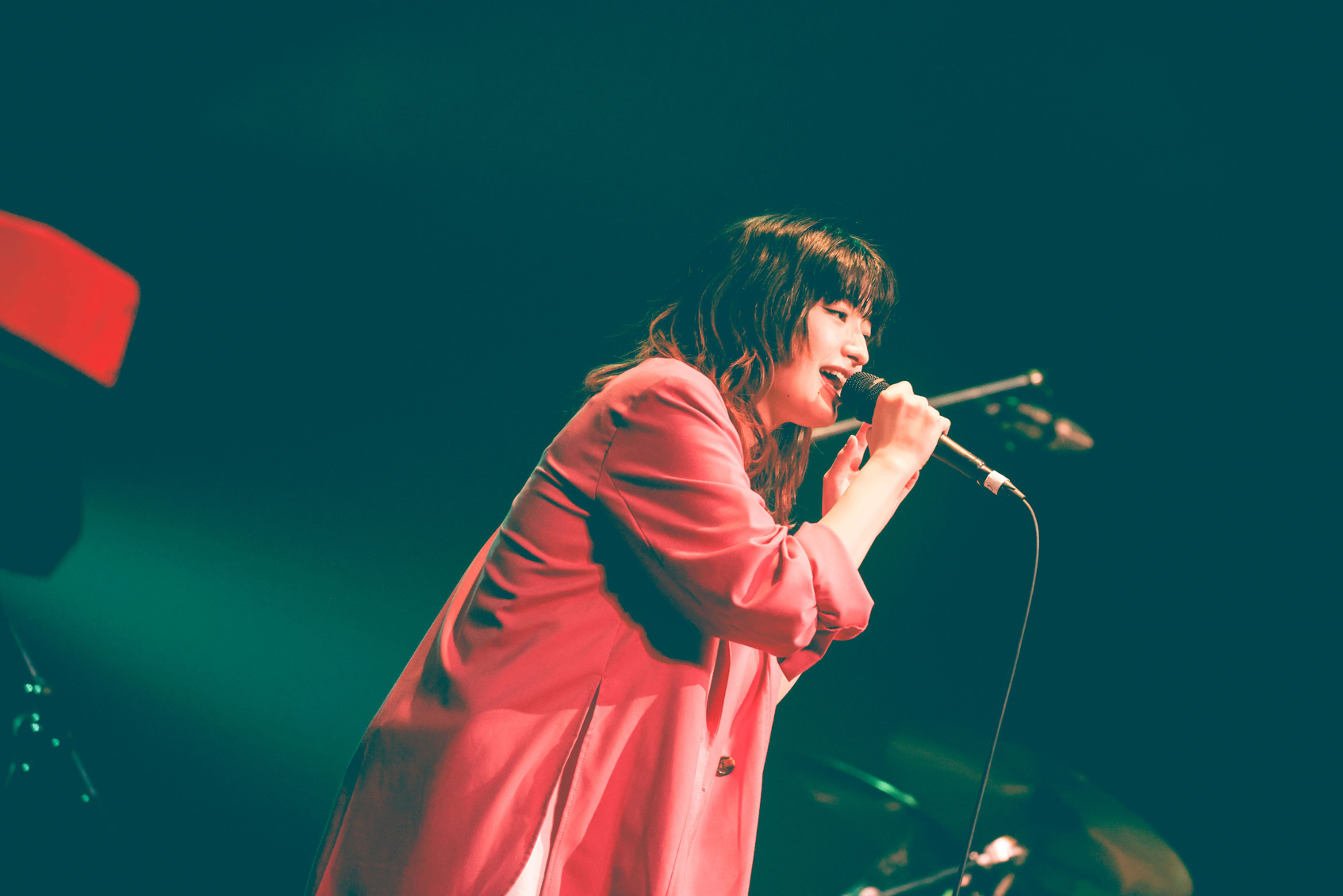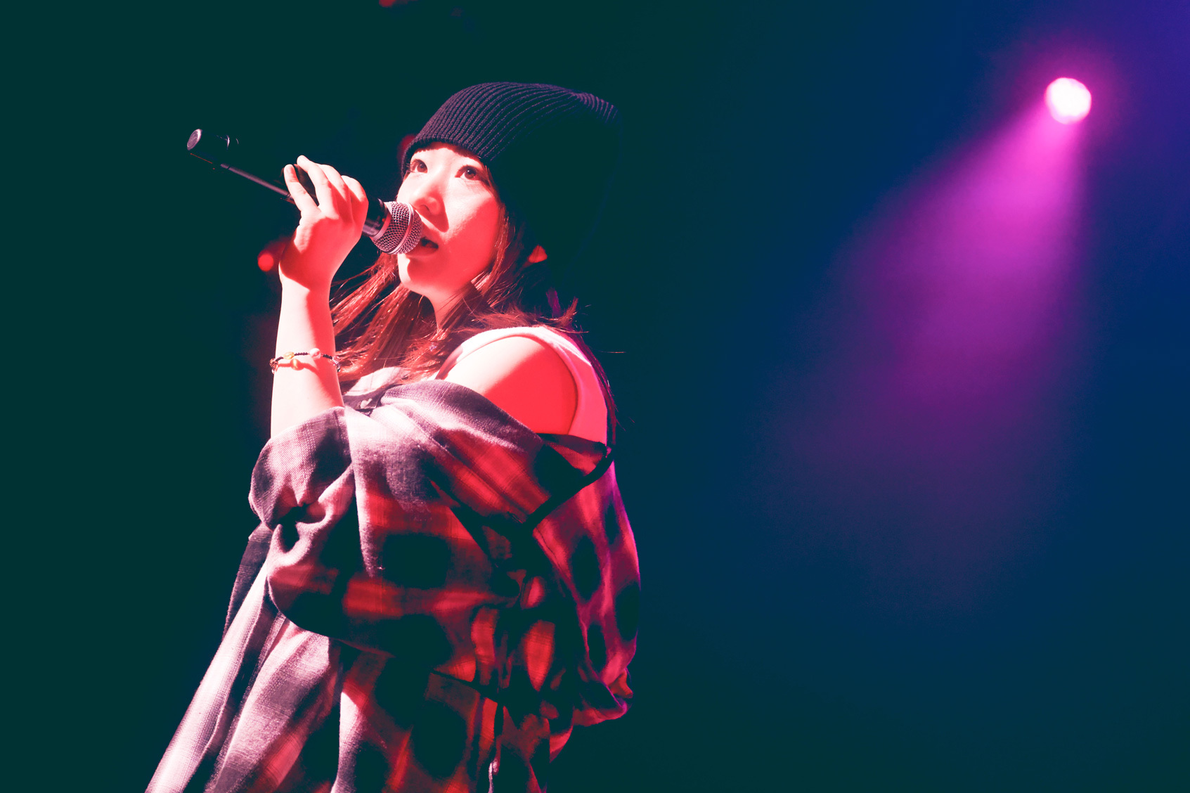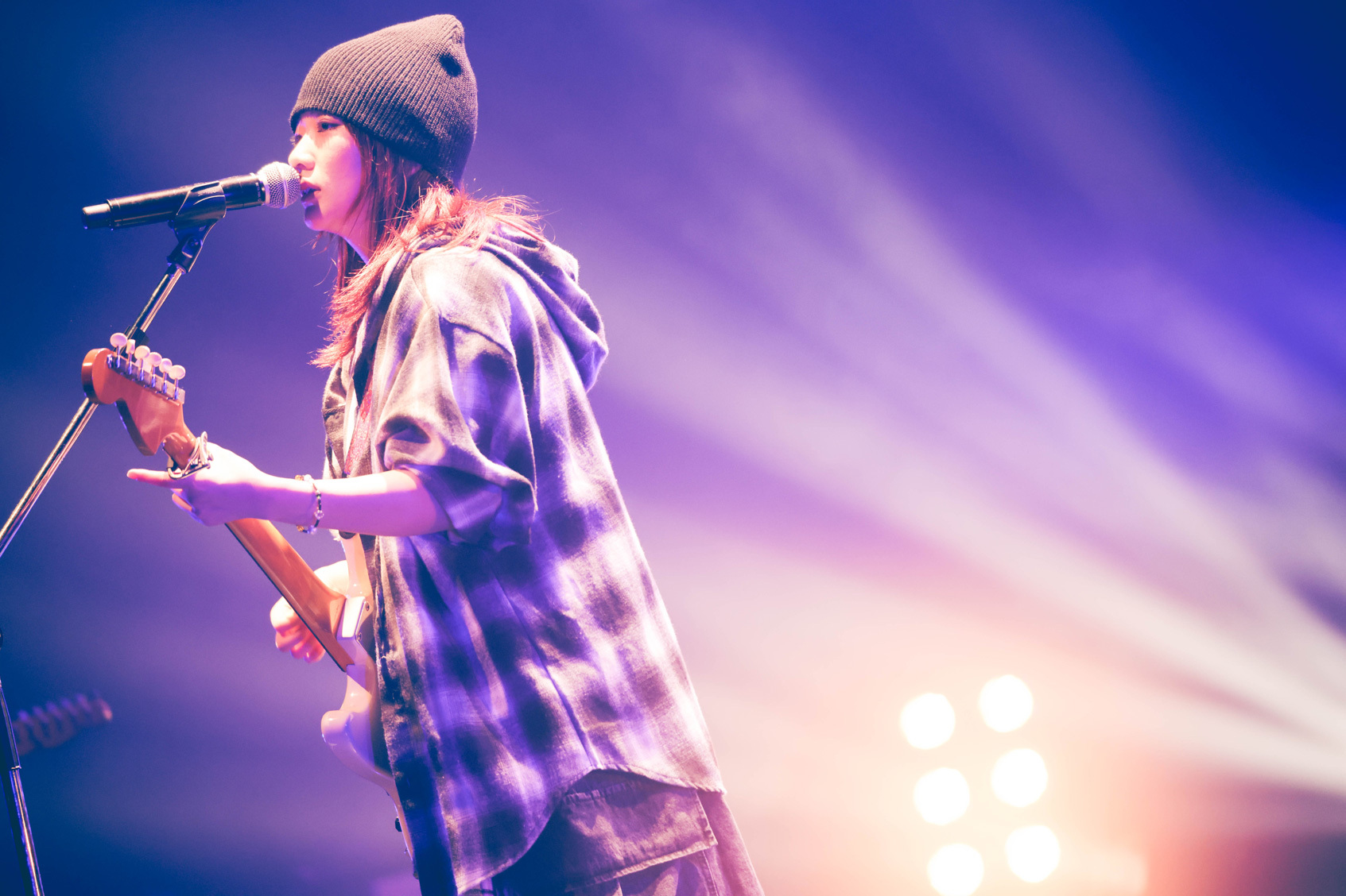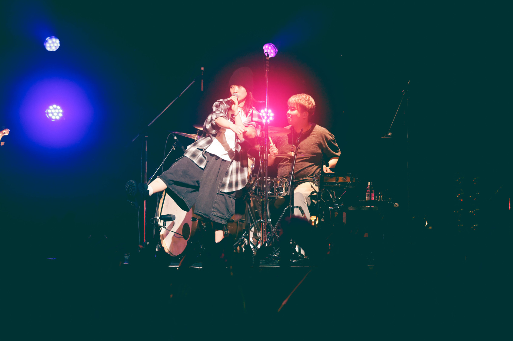 幕が上がると同時に鳴り響いた不協和音を切り裂くように始まった、シンガソングライターにしなのライブ。ニットキャップにオンブレシャツ、カーゴショーツとラフなストリートスタイルで現れた彼女は、「クランベリージャムをかけて」からハンドマイクでステージを横断。「キャンディ欲しい人~?」と飴玉を放り投げ、「東京マーブル」や「U+」でも、盤石のバンドセットを背に、より自由に軽やかに歌い上げていく。