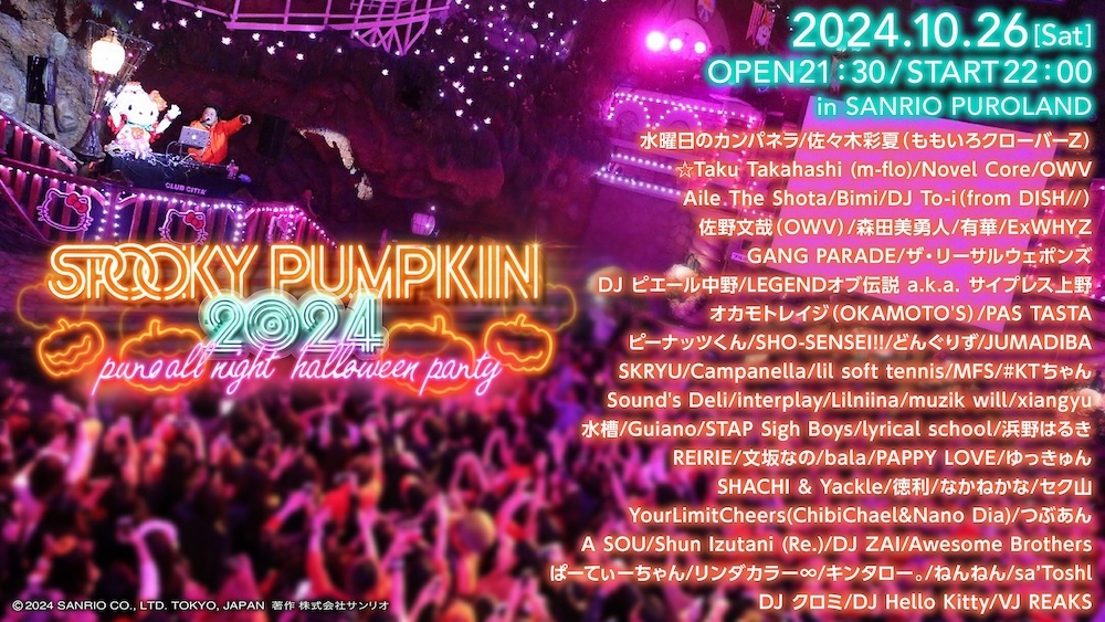 10月26日(土)にサンリオピューロランドにて開催される、一夜限りのオールナイトハロウィーンパーティ『SPOOKY PUMPKIN 2024 ~PURO ALL NIGHT HALLOWEEN PARTY~』から、第2弾出演アーティストが発表された。