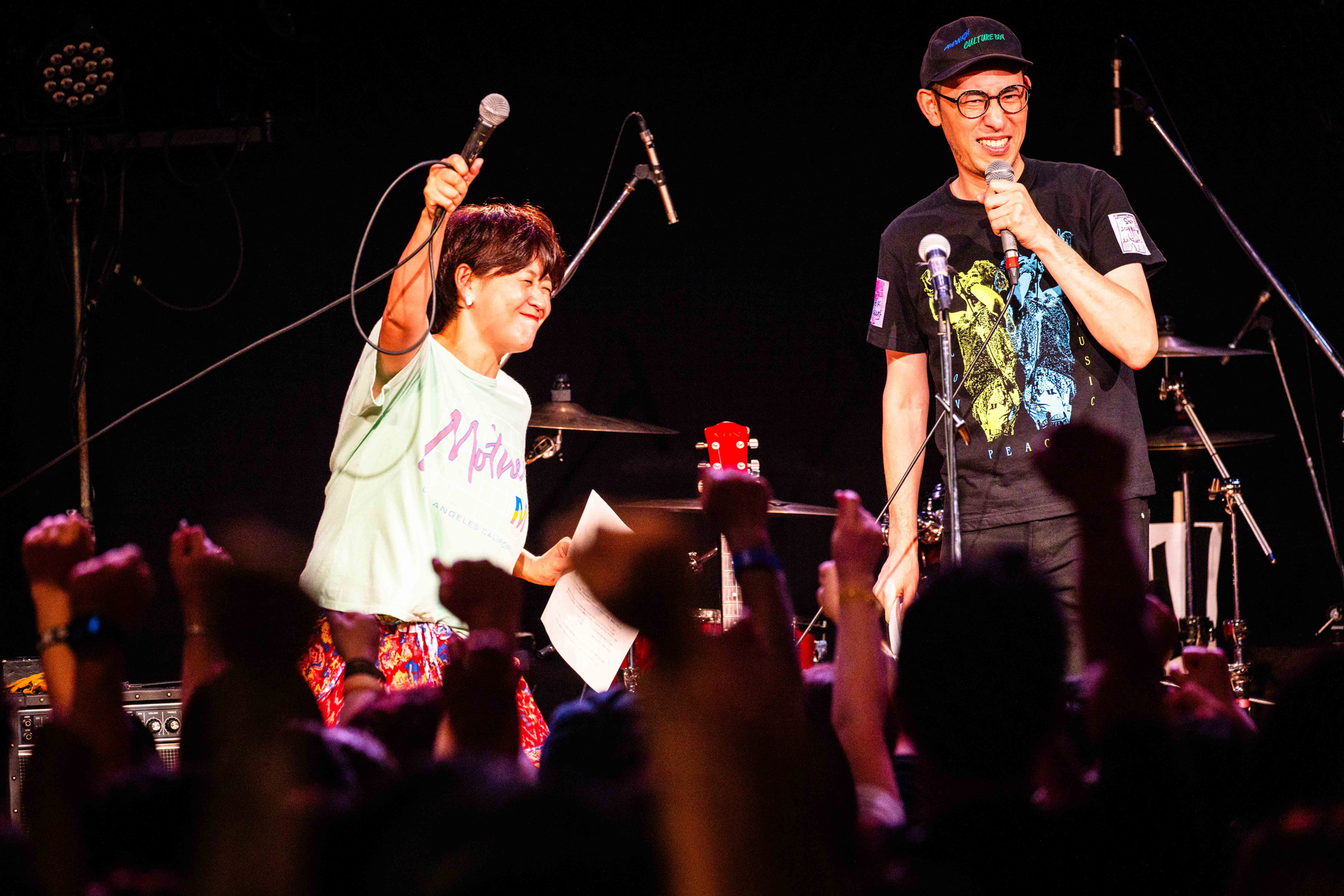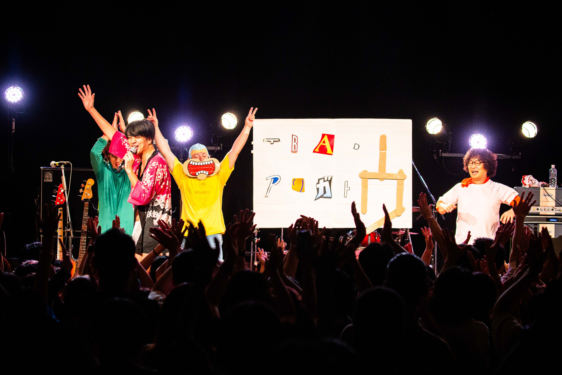 「お盆に先祖が来るぜ!」と言って、新曲「先祖にラブソングを」へ。愉快な歌詞ながら、讃歌であり、アンセムであり、ゴスペルであり、だからこそ響きまくるし、何だか楽しくて聴いているだけで笑ってしまう。ボイガルに対しても「怒っている奴がいたじゃん! でも先輩とか後輩とかじゃなくて同輩! そういうのを歌にしてみました!」と、これまた新曲「微差誤差僅差」へ。喋りの途中に曲を挟むという驚くべき逆転発想でライブを進めながら、「あれ変な声しない?!」という素敵な小芝居から、これまた新曲「祟りじゃ」へ。物騒なタイトルなのにリズミカルなナンバーであり、モーリーも「なんちゅう曲だ! でも、こういう遊べるところが好きなんです! ライブハウスって言うんですけど!」と嬉しそうに話す。