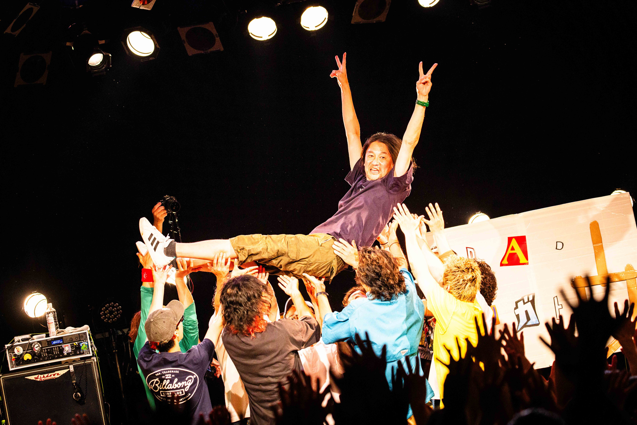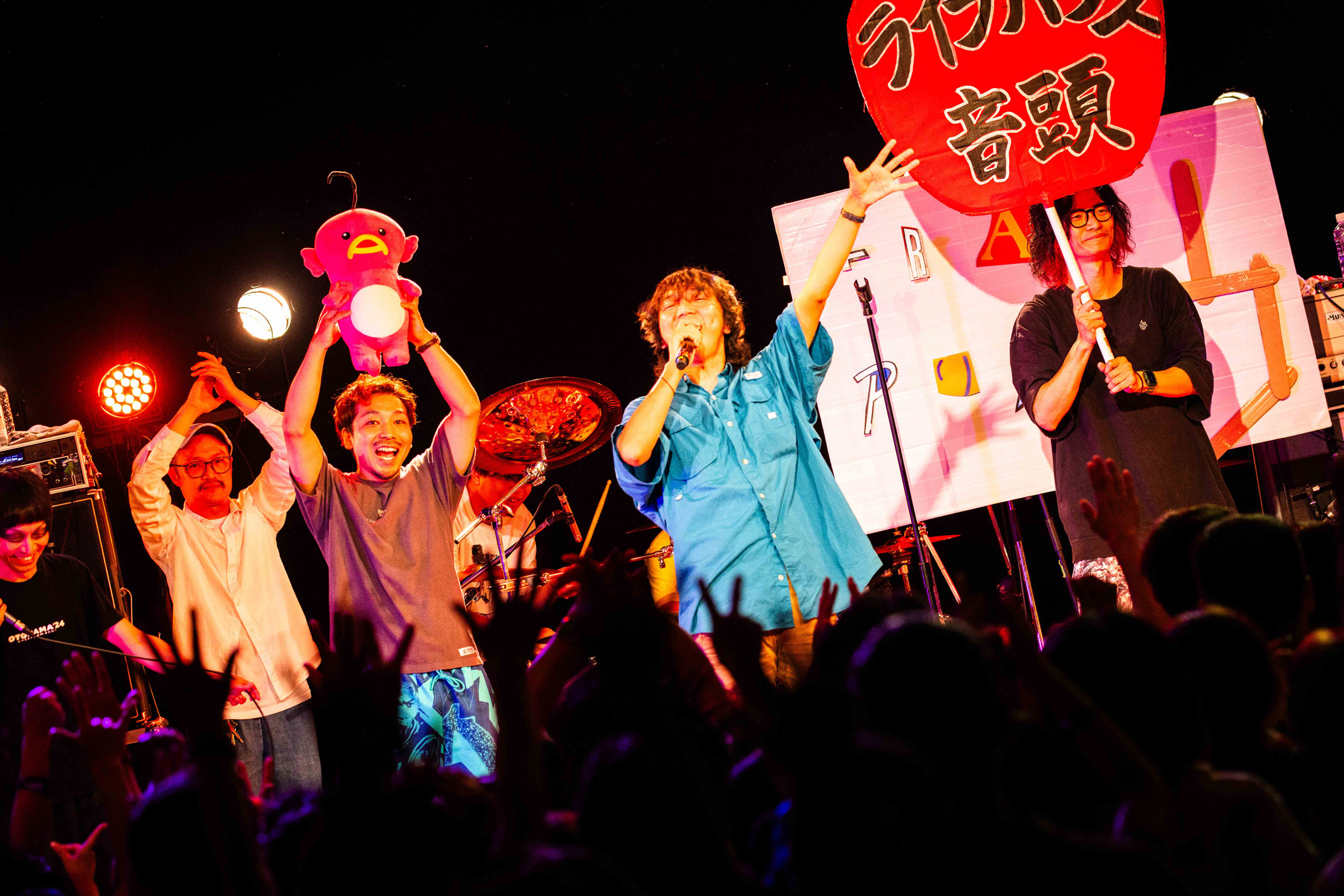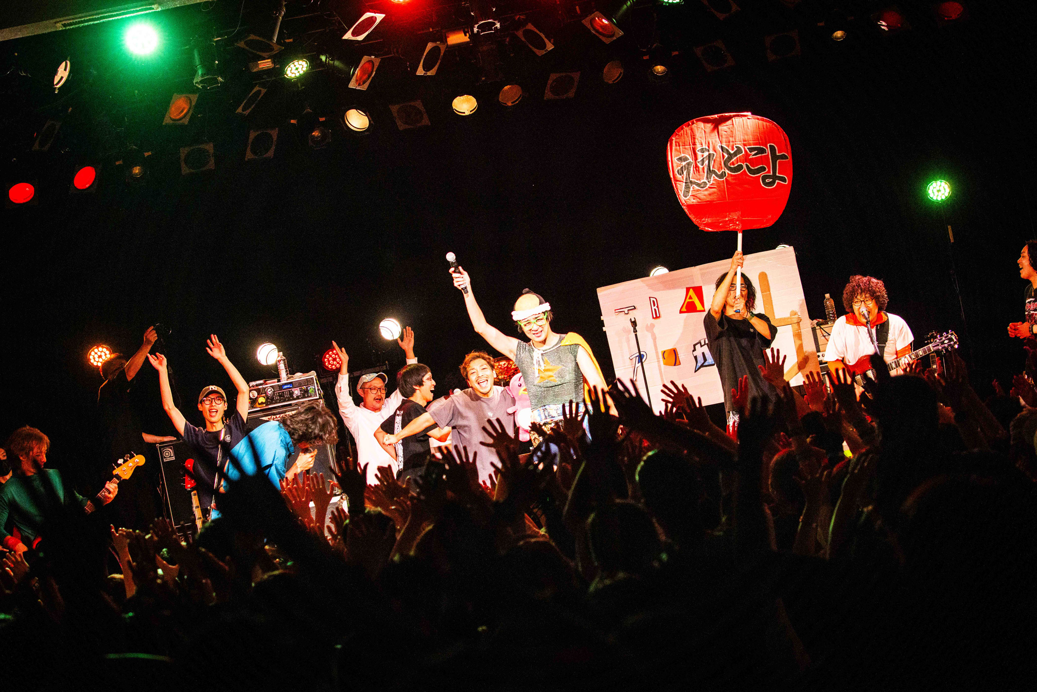 アンコールは康雄に似ているヒーロー“ちょんまげマン”が登場して、ABCのキャラクター“エビシー”を持って大暴れ! ライブハウスでしか観られない暴れっぷりは、めちゃくちゃ痛快すぎた。最後はセクマシとボイガルを呼び込み、ライブハウスを讃える歌「ライブハウス音頭」へ。<ええとこ ええとこよ>と繰り返し歌われる歌は『ええハコええオトいらっしゃーい!!』というイベントにもピッタリすぎた。そして、青木店長も呼び込み、出演者全員で胴上げ。
