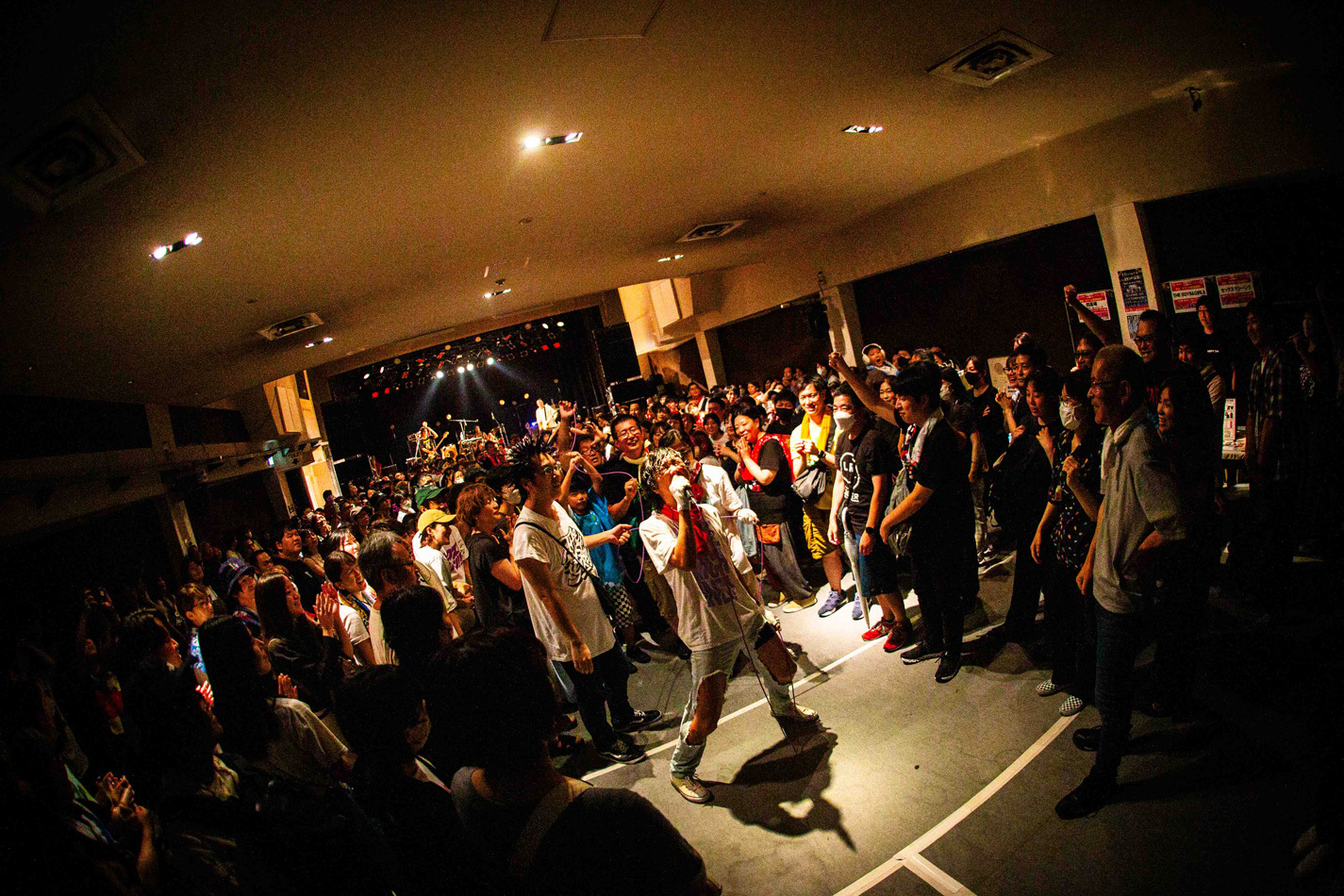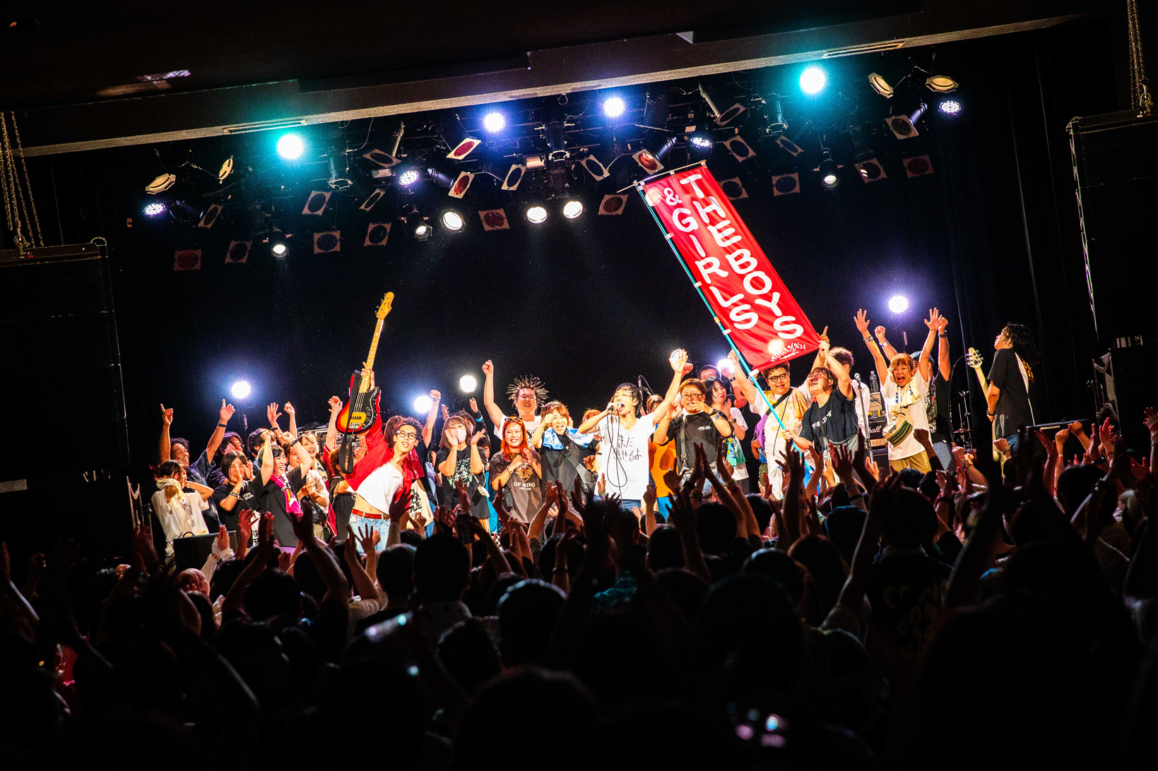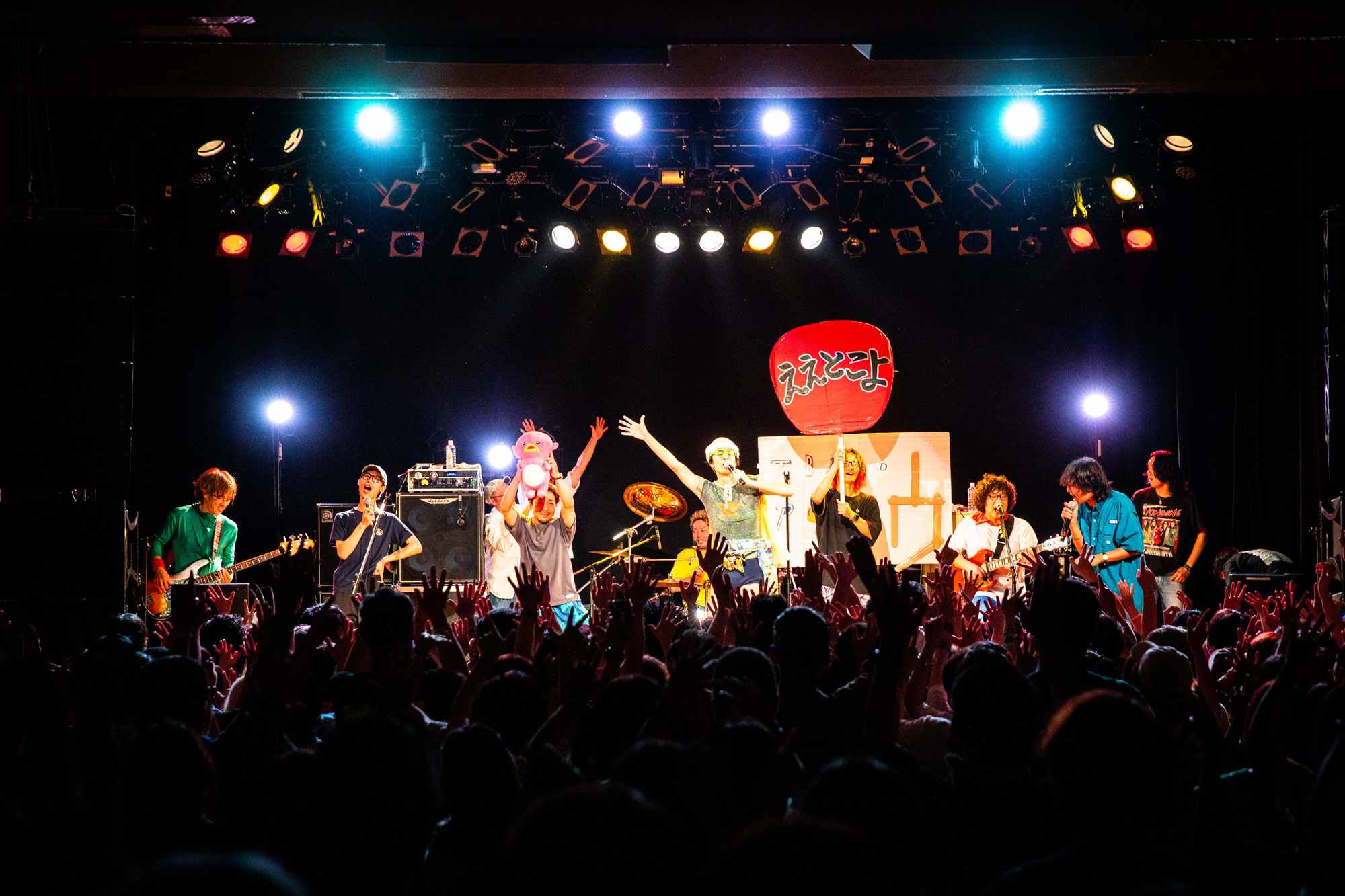 アンコールは康雄に似ているヒーロー“ちょんまげマン”が登場して、ABCのキャラクター“エビシー”を持って大暴れ! ライブハウスでしか観られない暴れっぷりは、めちゃくちゃ痛快すぎた。最後はセクマシとボイガルを呼び込み、ライブハウスを讃える歌「ライブハウス音頭」へ。<ええとこ ええとこよ>と繰り返し歌われる歌は『ええハコええオトいらっしゃーい!!』というイベントにもピッタリすぎた。そして、青木店長も呼び込み、出演者全員で胴上げ。