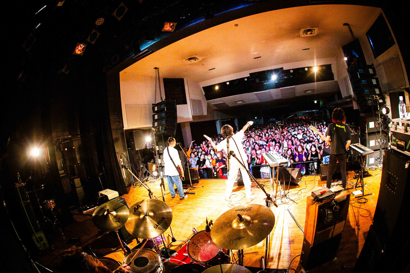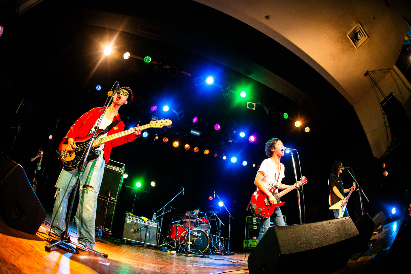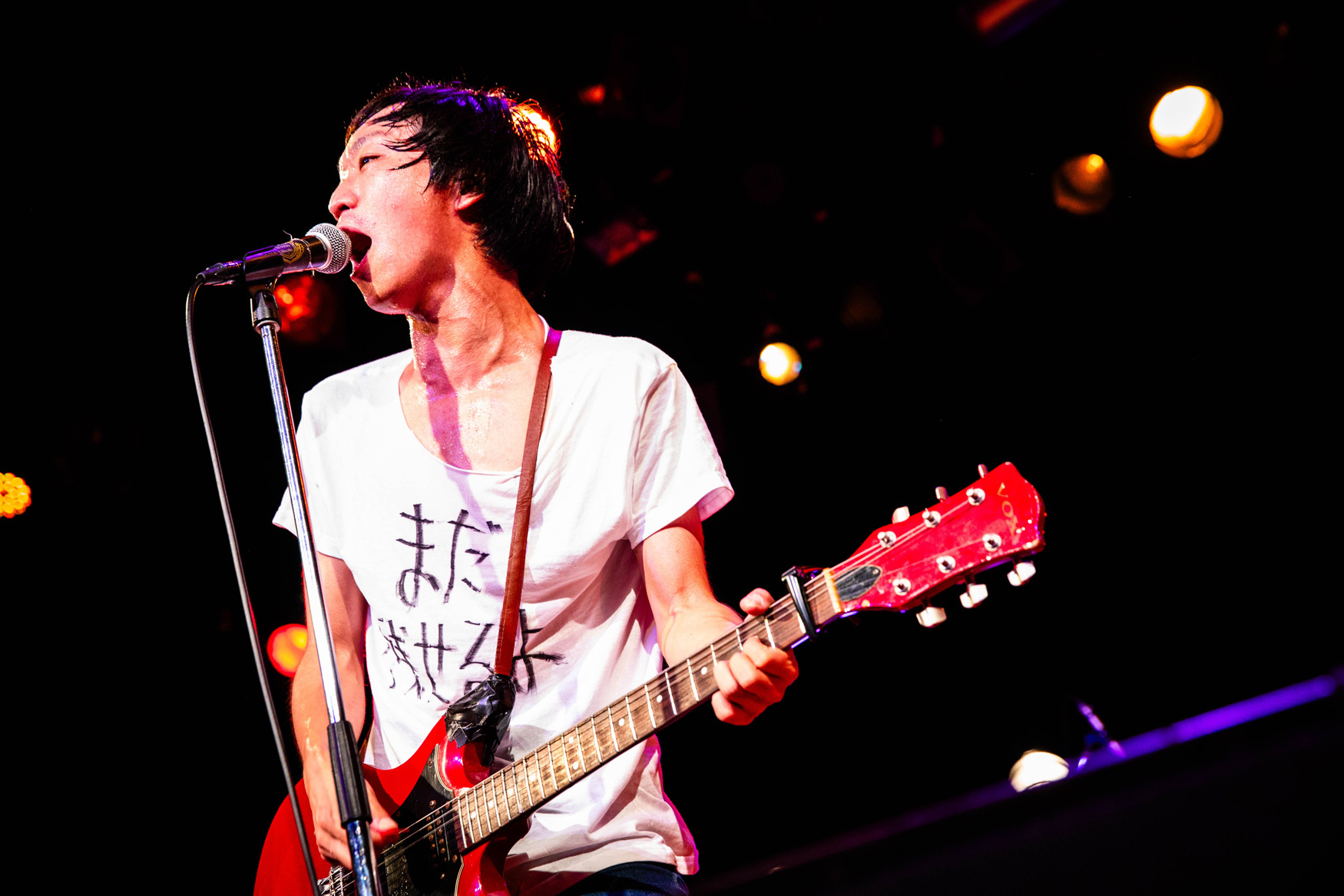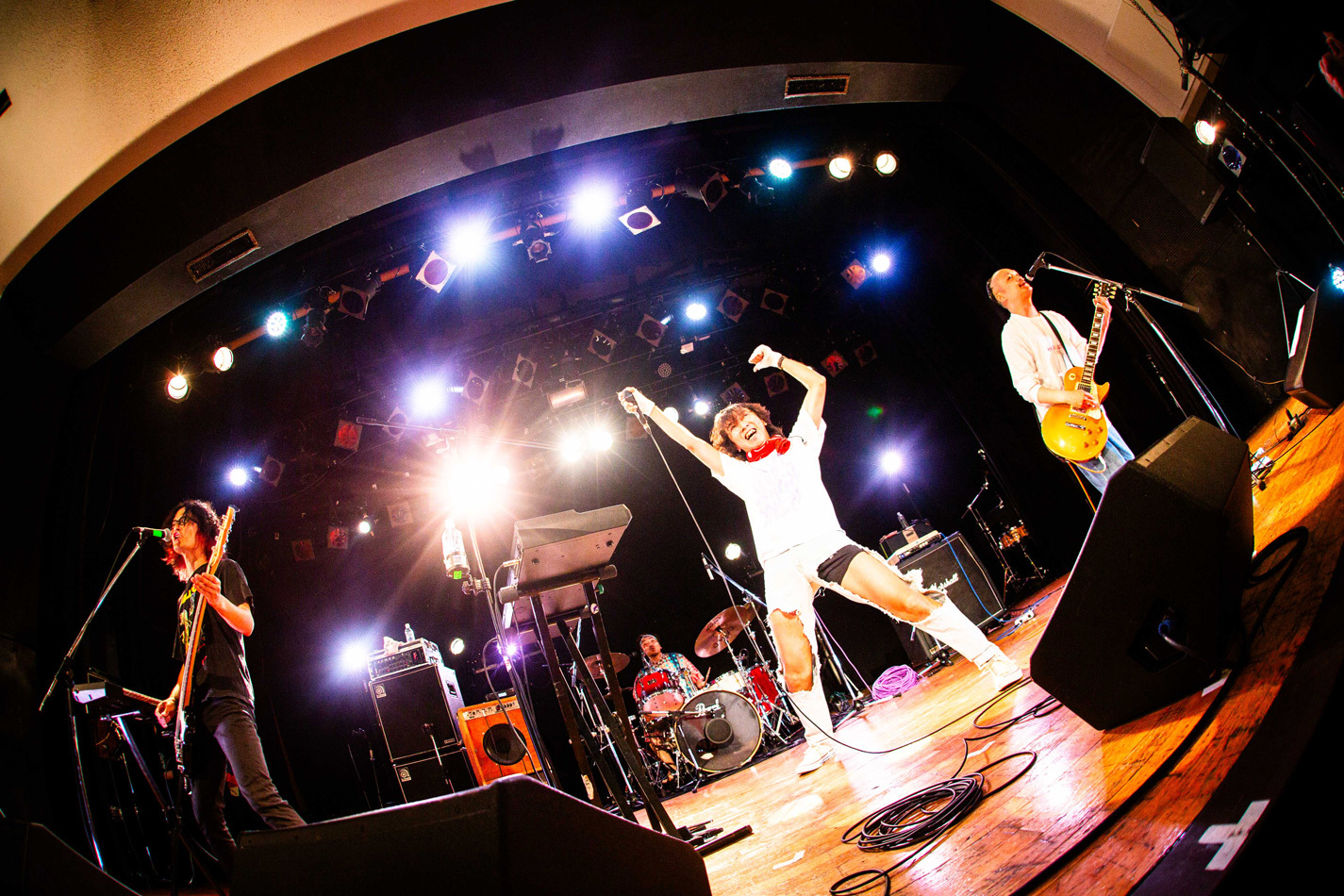 ラストナンバー「最初で最後のアデュー」では、観客フロアに下りて、清水音泉制作のバンド名が入ったのぼりを観客に持たせたり、他の観客たちも可能な限り舞台に上がらせたりと、やれる限り暴れまくっていた。憎めない可愛らしい悪童だなと改めて思っていたら、最後に「ふたつのバンドに悪態ついてスミマセンでした。本当は、そんなことは思ってません。みんな大好きです」と〆る。それはズルいよと思いながらも、そこが魅力的であり、とにかく大爆発させて、素晴らしく掻き乱しに来たトップバッターであった。