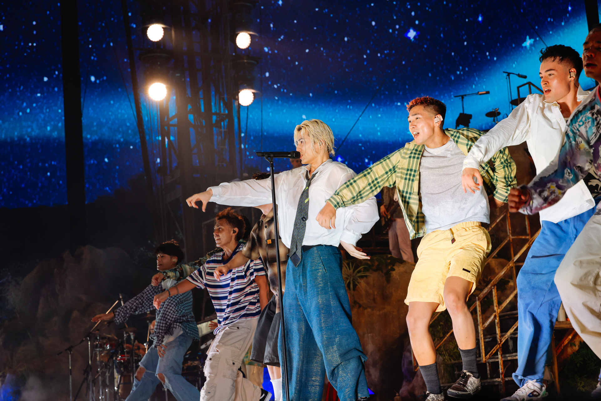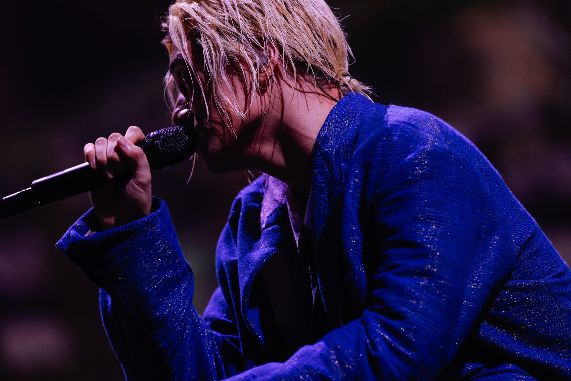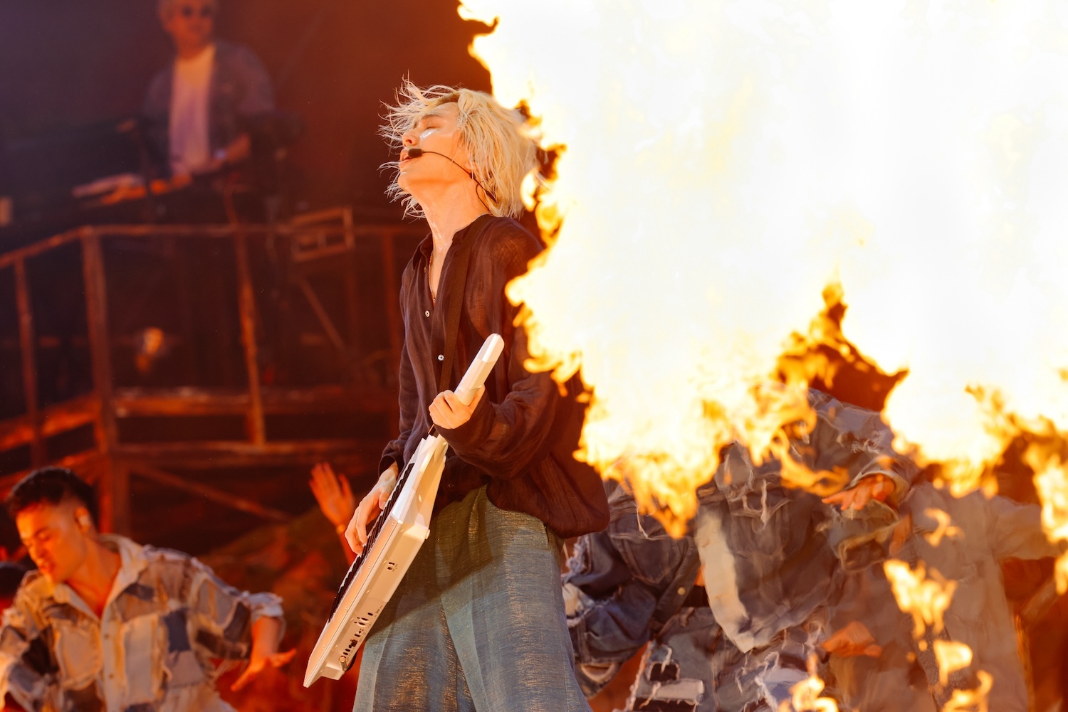 デビュー以降では初めてバンドで演奏するという“風よ”、そして続く、こちらもバンドでやるのは初めてとなった“ロンリーラプソディ”では、自身もピアノを奏でながら、再びじっくりと心の奥深くに降りていくように、その宇宙へと聴く者を惹き込んでいった。大観衆が描き出す一体感といったものよりも、彼が生み出す音楽がセーフスペースとなり、一人ひとりのあるがままの心がそっと解放されてゆくような、深い充足感が静かに会場を満たしていく。湘南乃風の“恋時雨”のピアノ弾き語りを1フック挟みつつ、イントロをピアノで響かせて“死ぬのがいいわ”へ。ARIWAとEmoh Lesというふたりと織りなす有機的な声のハーモニーも美しい。