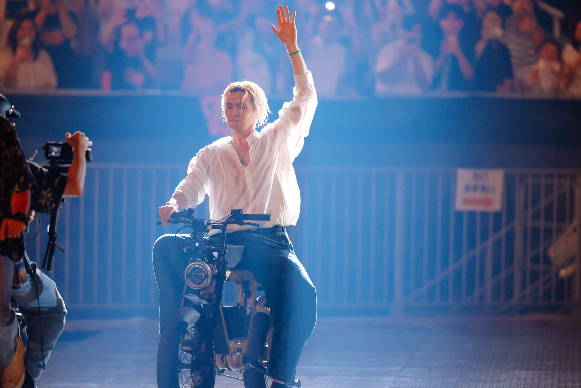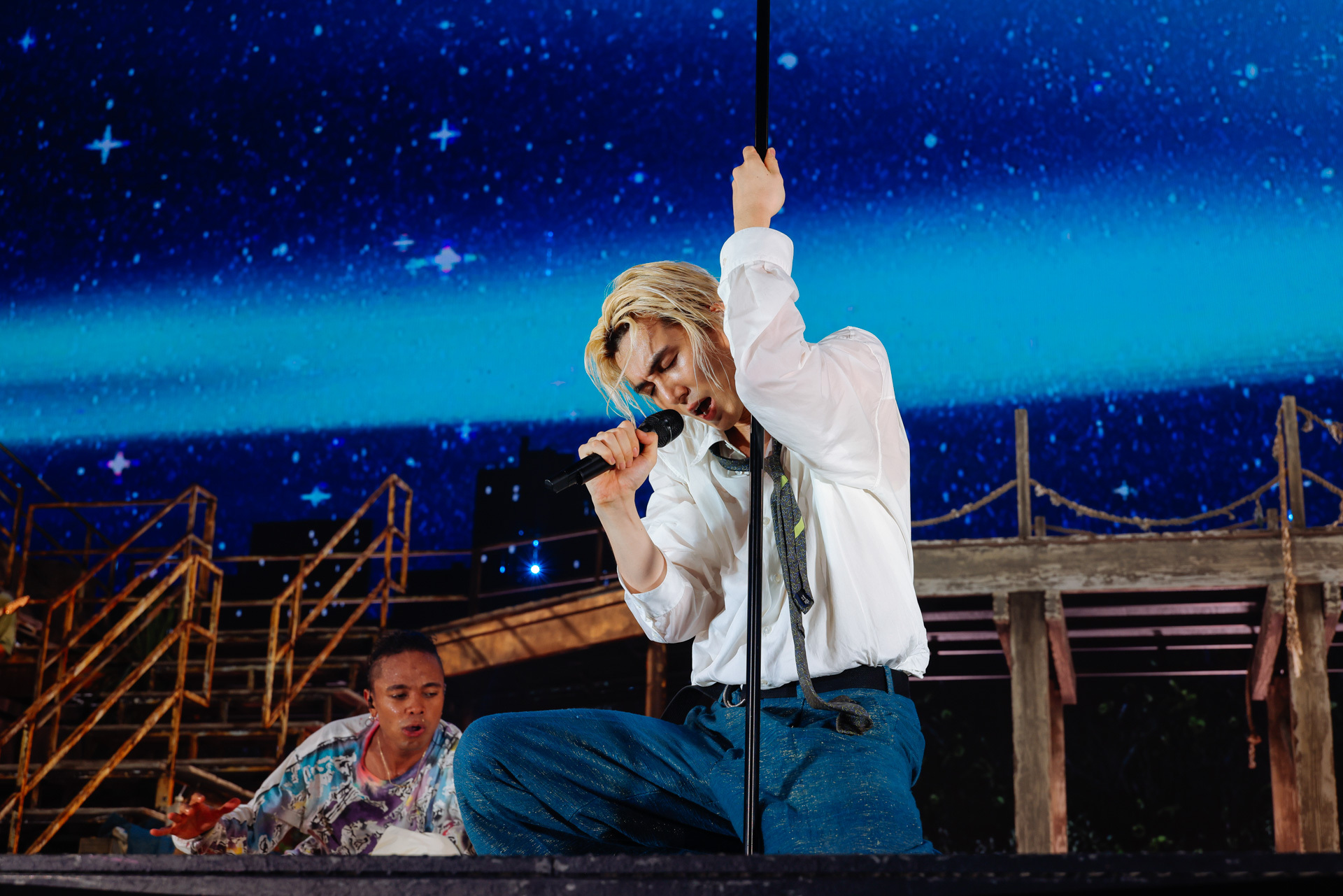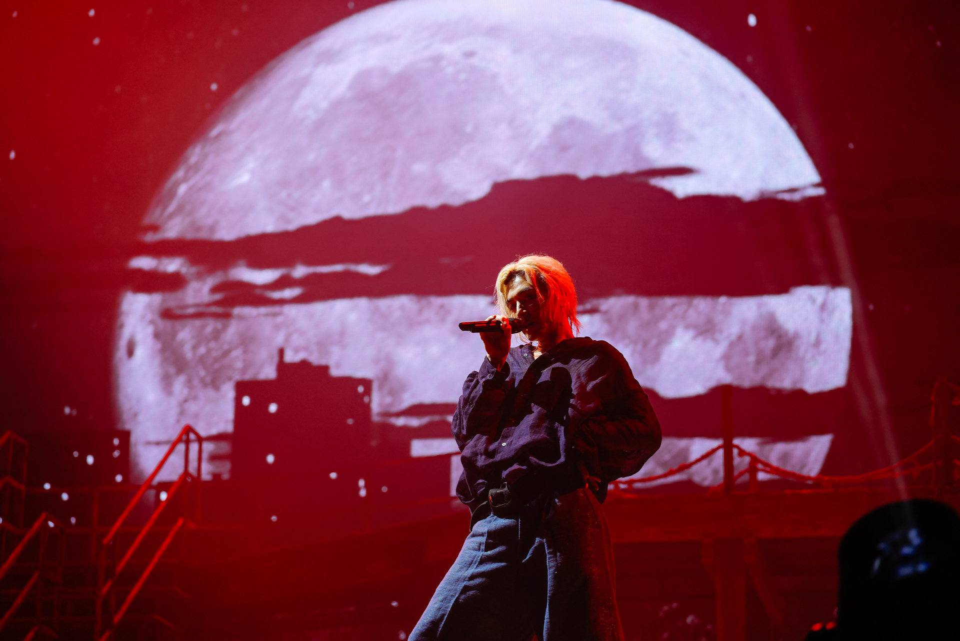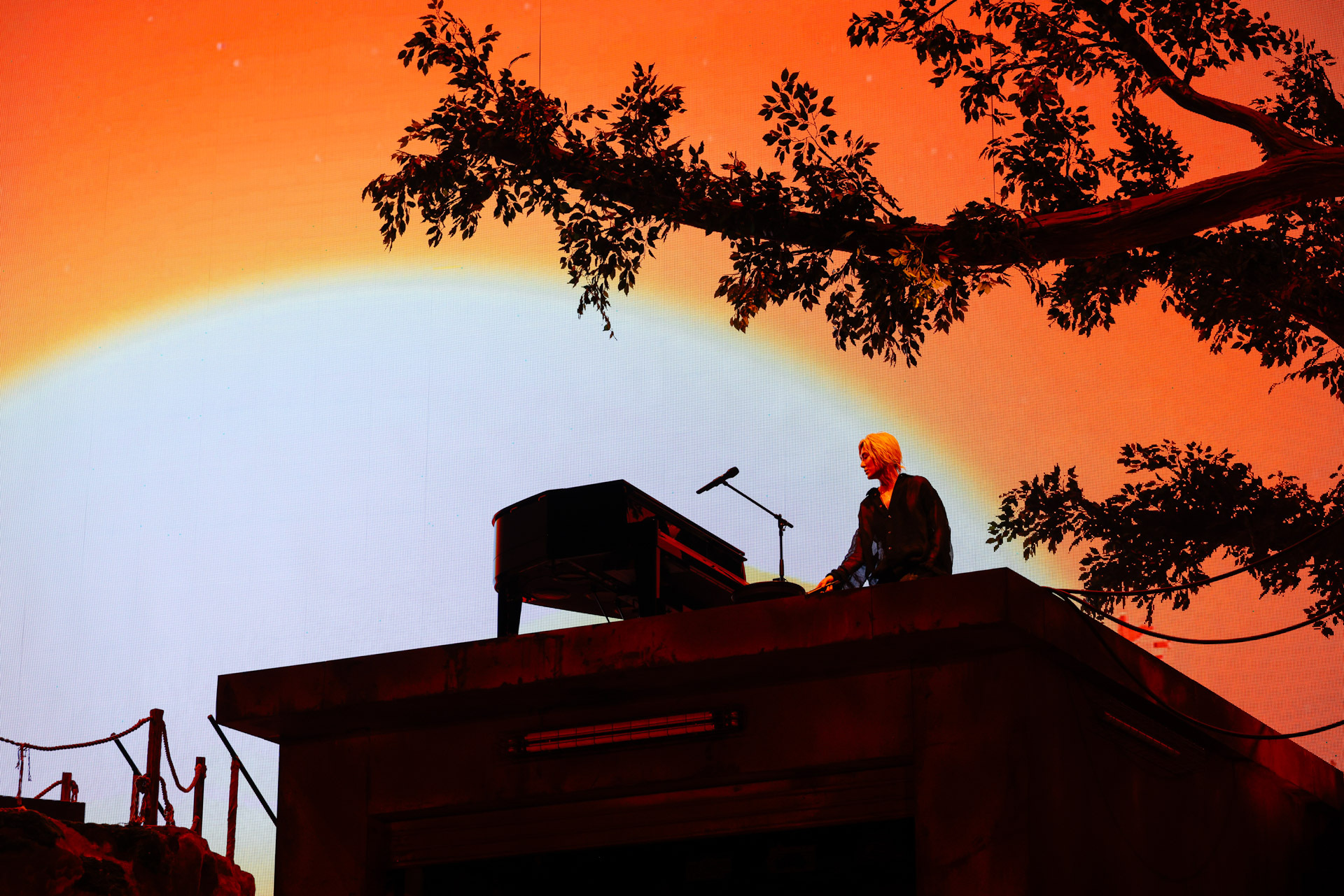 デビュー以降では初めてバンドで演奏するという“風よ”、そして続く、こちらもバンドでやるのは初めてとなった“ロンリーラプソディ”では、自身もピアノを奏でながら、再びじっくりと心の奥深くに降りていくように、その宇宙へと聴く者を惹き込んでいった。大観衆が描き出す一体感といったものよりも、彼が生み出す音楽がセーフスペースとなり、一人ひとりのあるがままの心がそっと解放されてゆくような、深い充足感が静かに会場を満たしていく。湘南乃風の“恋時雨”のピアノ弾き語りを1フック挟みつつ、イントロをピアノで響かせて“死ぬのがいいわ”へ。ARIWAとEmoh Lesというふたりと織りなす有機的な声のハーモニーも美しい。