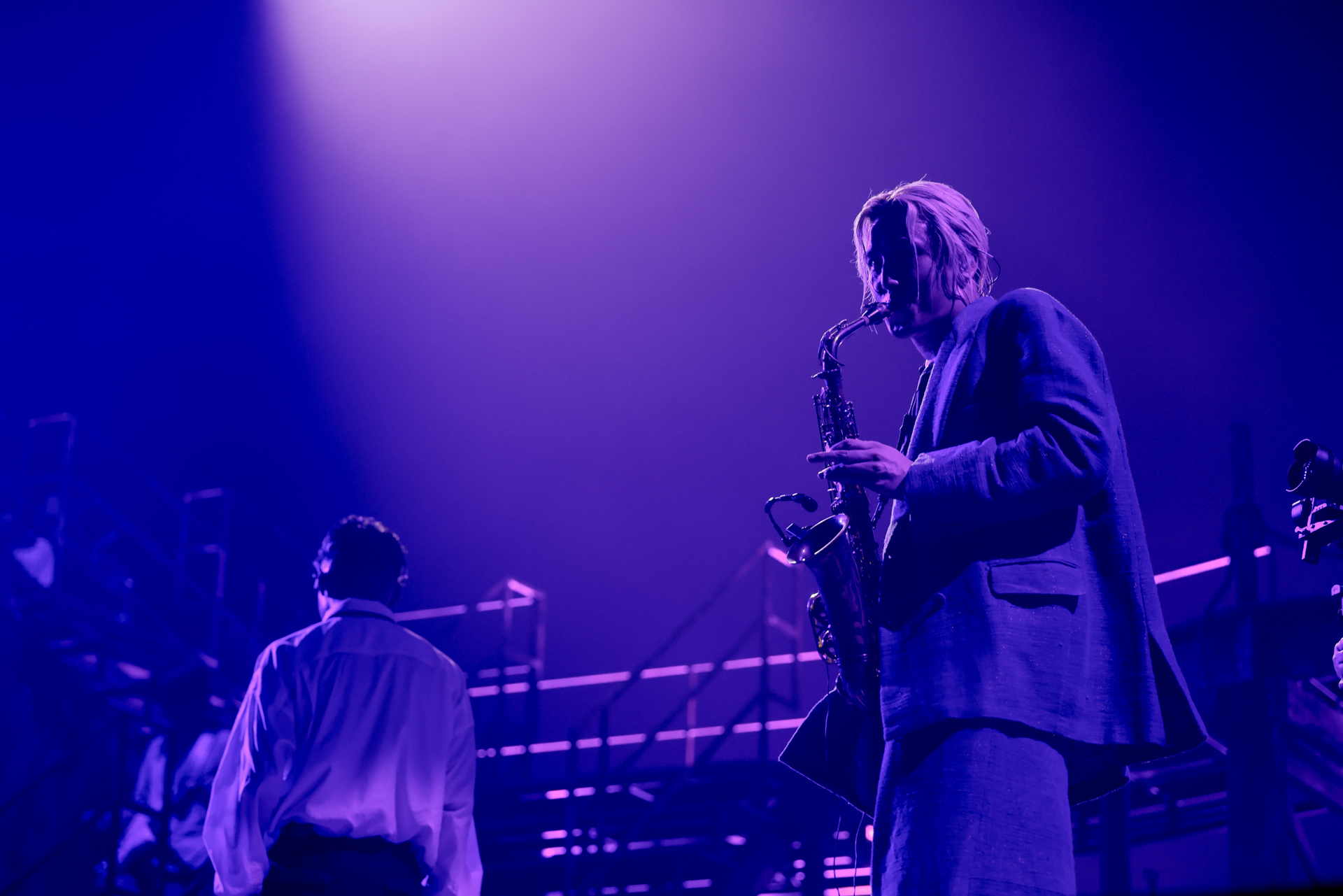 バンドのセッションとダンサー陣によるブレイキンで魅せたのち、ややオーバーサイズのジャケットにタイを締めた姿でサックスソロを響かせて始まった後半戦は、“Workin’ Hard”からスタート。ケンドリック・ラマーやSZAも手掛けるDJ Dahiと共に制作した、ローの効いたヘヴィなビートが特徴的なストイックなヒップホップ・トラックである原曲をバンドアレンジに展開し、『LOVE ALL SERVE ALL』以降にまた新たなフェーズを切り拓き始めている藤井 風の音楽世界を提示しつつ、軽快なドライブ感を放つ“damn”、そして原曲とはガラリと表情を変えたガレージロック・バージョンともいうべき“旅路”を披露していく。藤井 風はどの楽曲も自身のピアノと声のみで表現することができてしまうアーティストであると同時に優れたエンターテイナーでもあり、だからこそ、その楽曲は本質とメッセージを損なうことなくいかようにもアレンジ可能で、様々なポテンシャルを内包している。
