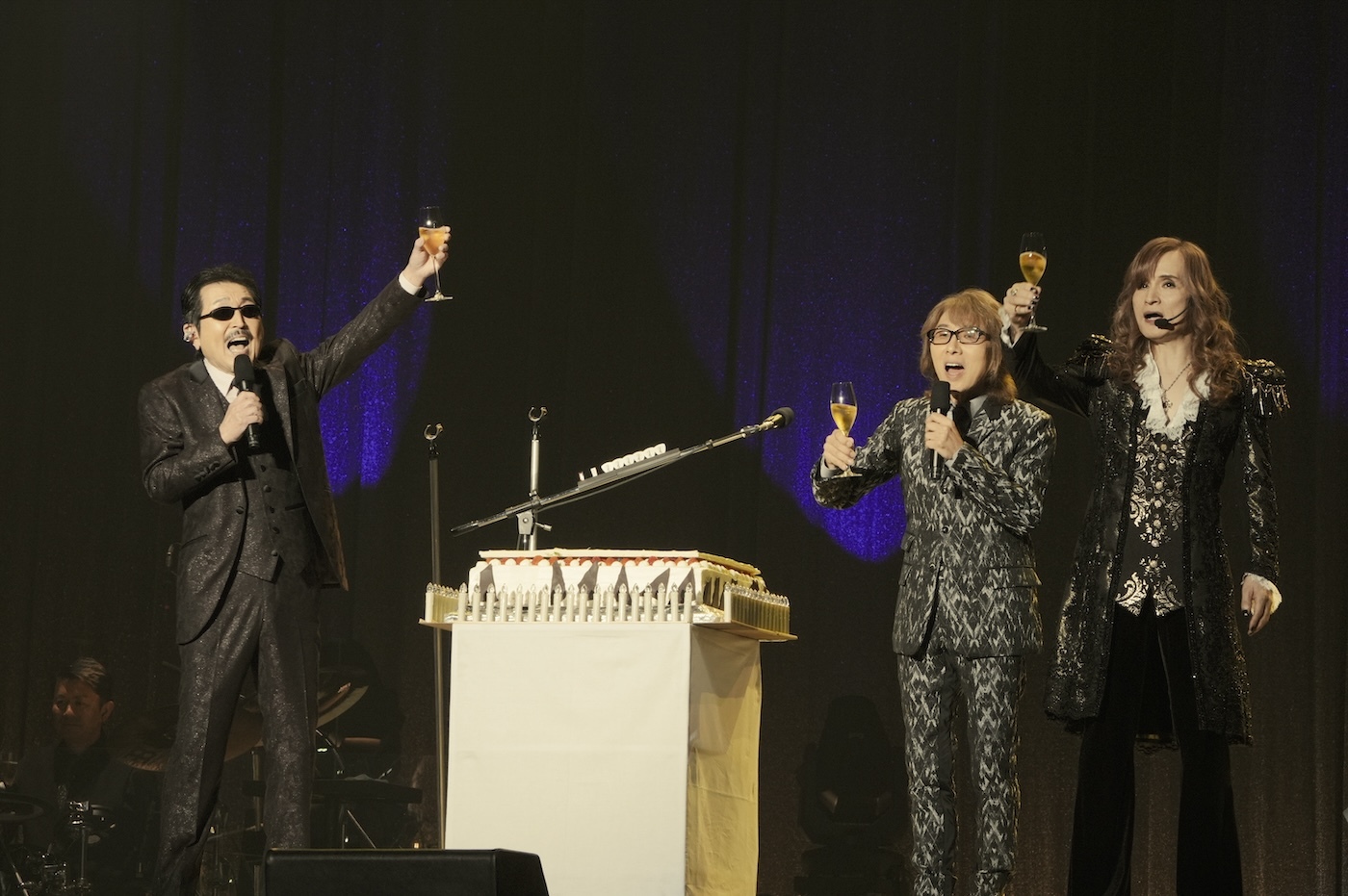 さらに坂崎が「デビュー日ということは誕生日。誕生日といえばケーキでしょう」と、お祝いのケーキとシャンパンが壇上に。3人は観客と一緒に「ハッピーバースデー」を合唱して祝福した。