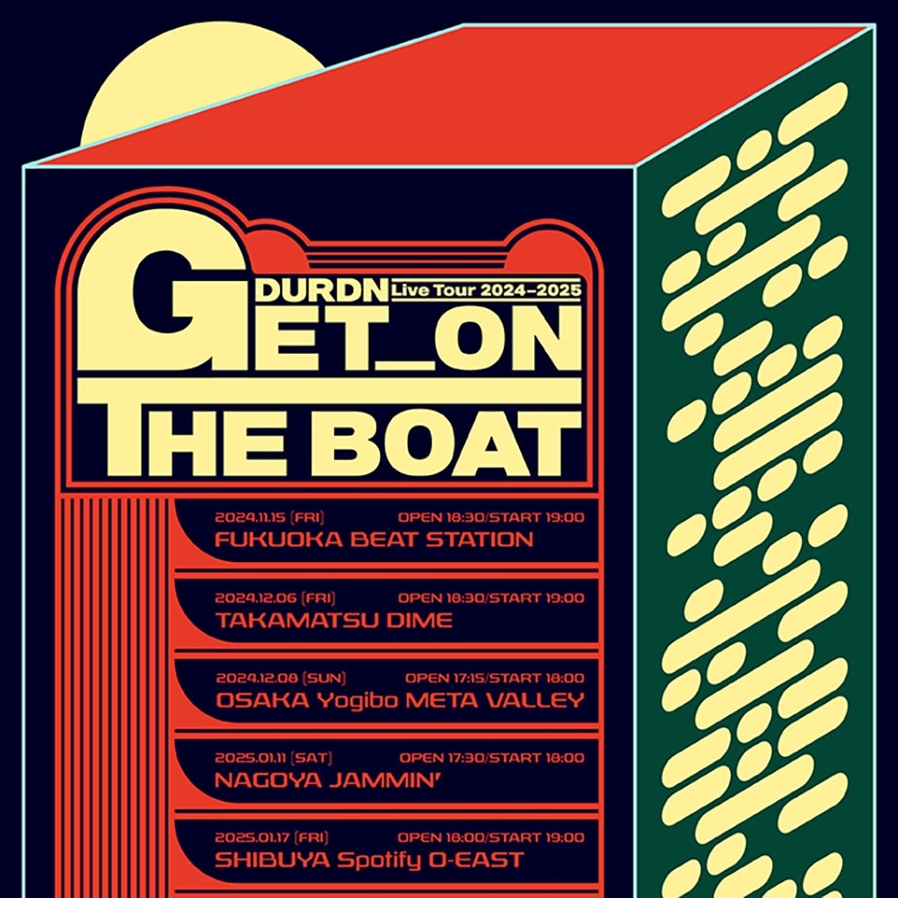 そして新たにDURDNのライブツアーも解禁。今年11月から来年1月にかけて『DURDN Live Tour 2024-2025 GET ON THE BOAT』と題した全国ツアーの開催が決定した。彼らのキャリア上、初となる5都市をめぐるこの公演は、これまでにワンマンライブを行った東京、大阪、名古屋に加えて、福岡と高松では初のワンマンライブとなる。11月15日の福岡BEAT STATIONを皮切りに、ファイナル公演は1月17日に渋谷のSpotify O-EAST。チケットは本日20時から9月16日までオフィシャル先行受付が行われる。