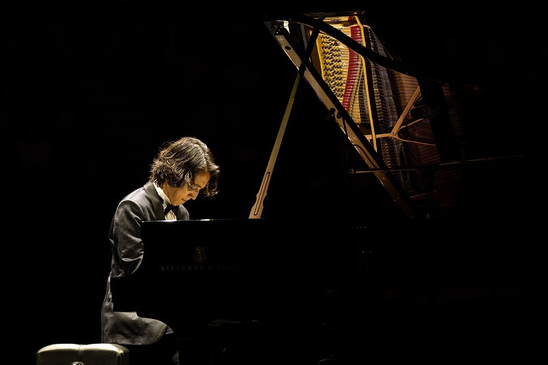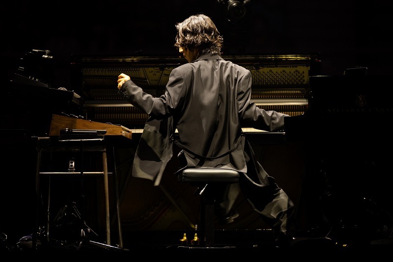 プログラムの最後に置かれた自身の編曲によるラヴェル「ボレロ」では、アップライトピアノの素朴な音に始まり、そこに内部奏法も含むグランドピアノ、シンセサイザーの音を重ねていく。自由に音楽を膨らませ、燃えるような赤い照明の中でステージが回転し、狂気と情熱が入り混じるようなクライマックスを迎えた。