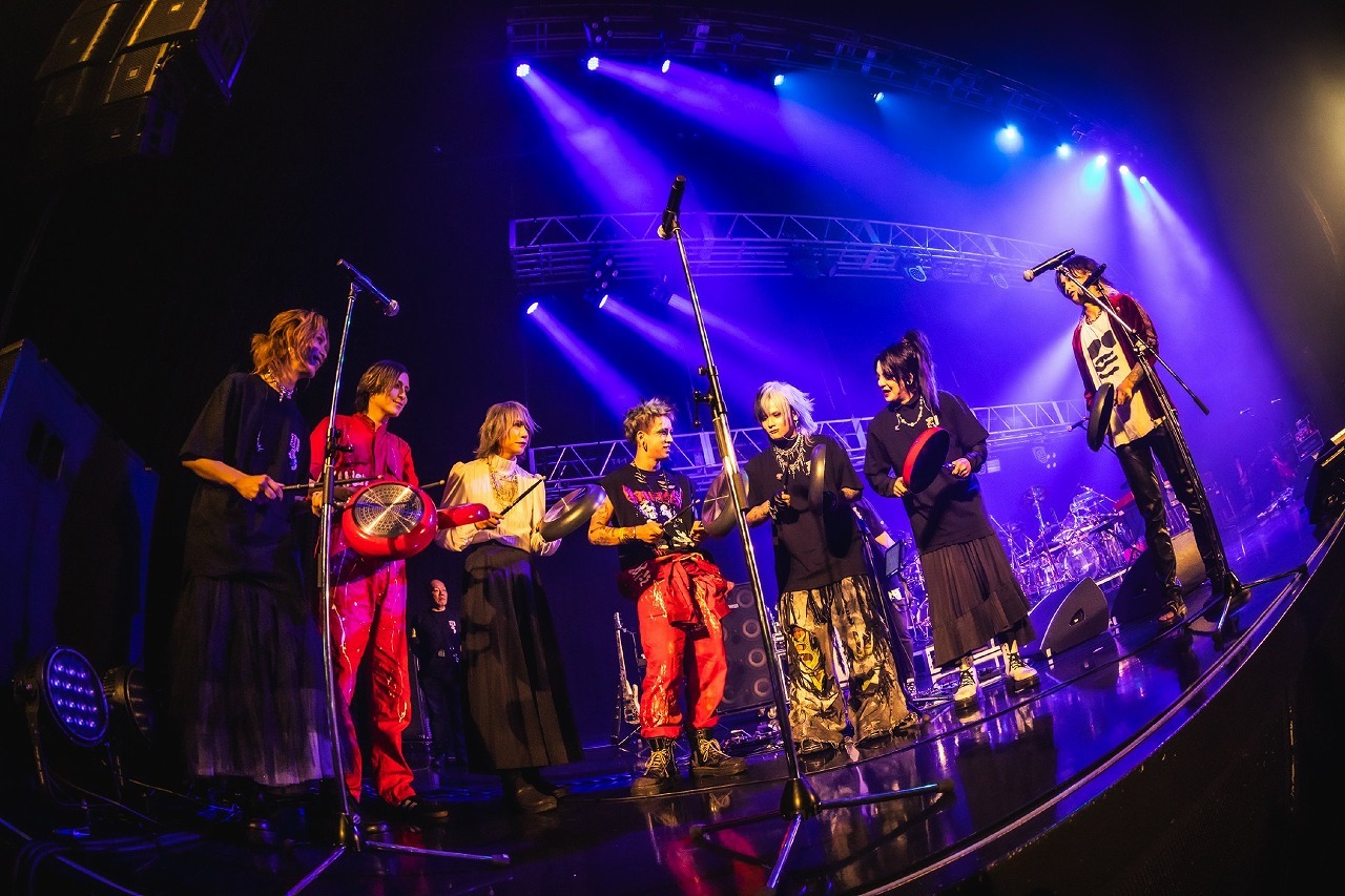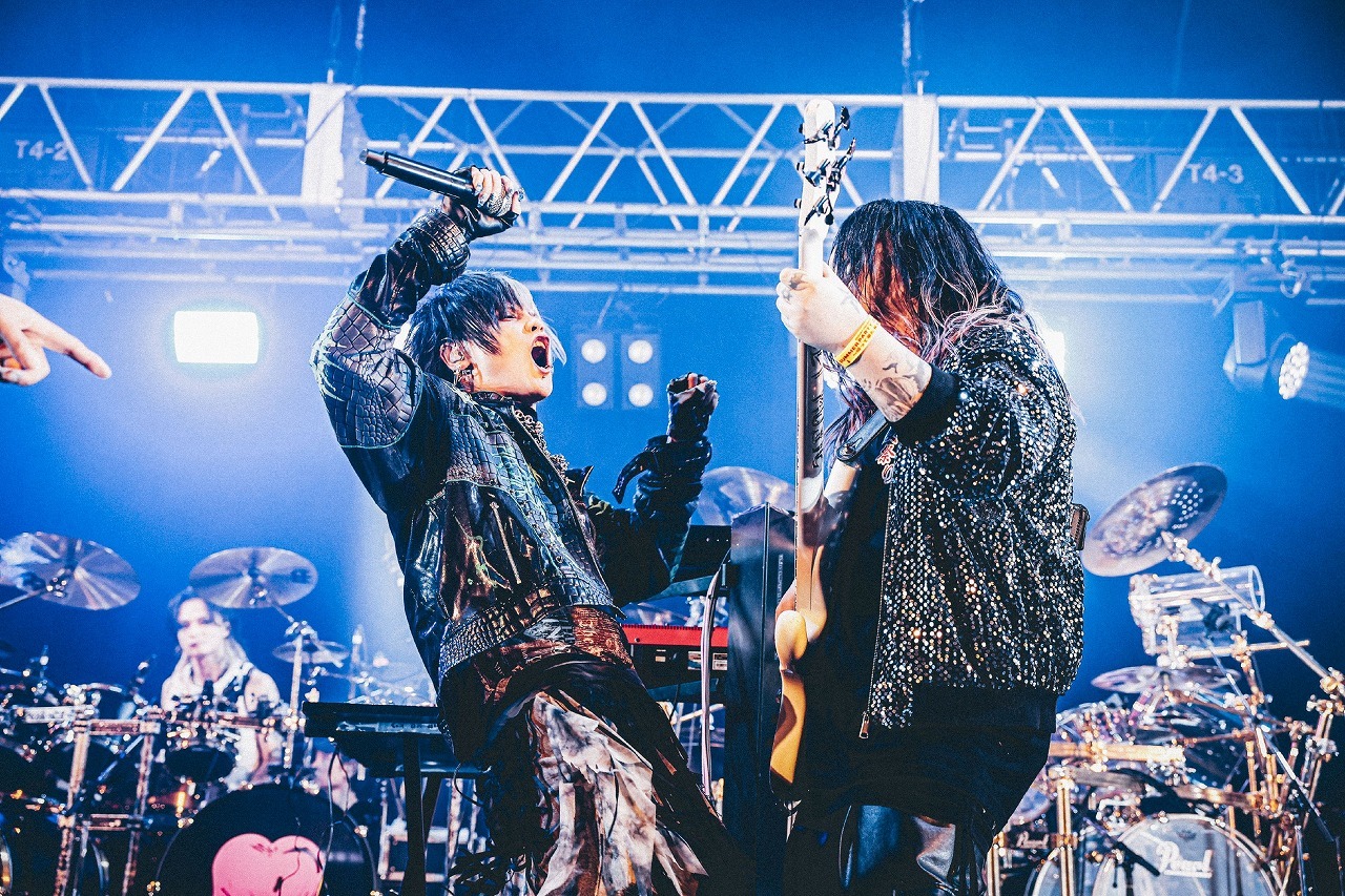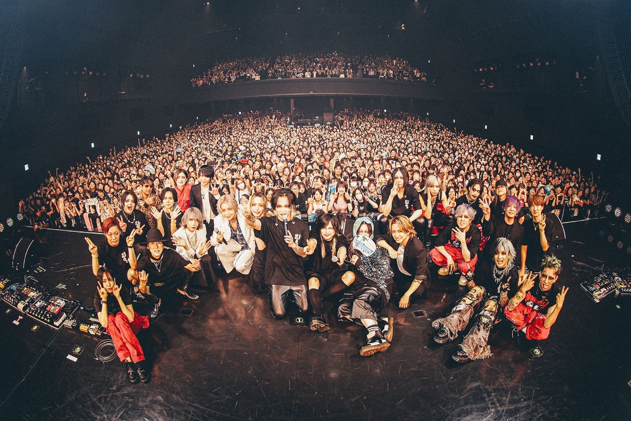 最後は、逹瑯、千秋、Shouのトリプルボーカルに、Ken&[ kei ]のツインギター、YUKKE&AKiのツインベース、Shinyaが顔を揃えての「Voice」。Kenが奏でるイントロのフレーズで大歓声が湧き、珠玉のメロディを3人のボーカルが歌い繋いでいく。SORAにMiyako、Sacchanがイベントグッズを持って乱入し、ステージ上は完全にお祭りモード。ピースフルな空気が会場中を満たし、終演を迎えた。