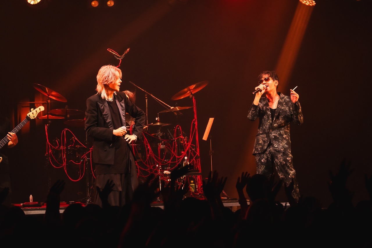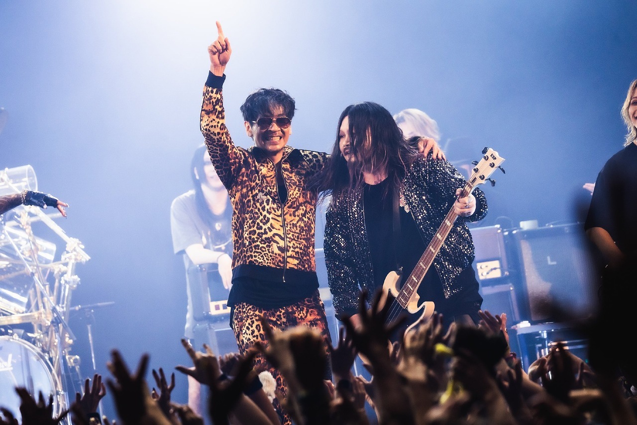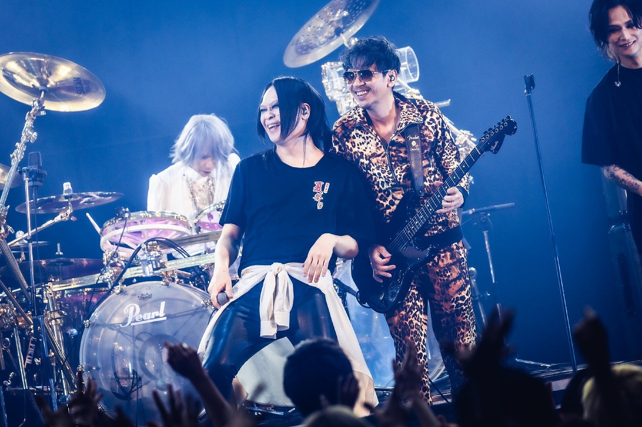 続いてステージに並んだのは、逹瑯、Ken、YUKKE、SORA、足立房文の5人。逹瑯のソロアルバム『非科学方程式』で、Kenが提供した「the love letter」が初披露と相成った。逹瑯の歌声にKenのフレーズとシンセの音が映える情熱的なラブソング。一緒に歌う逹瑯とKenの表情が、ライブで演奏できる日を待っていたことを物語っていた。