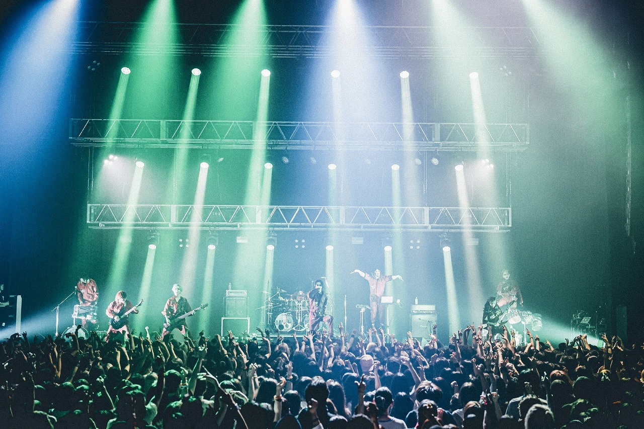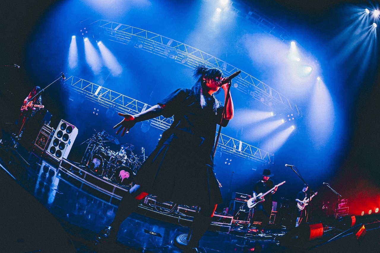 暗転したステージに、トップバッターを務めるMUCCが姿を現す。堂々たる風格を纏って定位置に着くと、「パーティ、はじめようか!」という逹瑯の言葉を合図に「蘭鋳」を投下。真っ赤に染まったステージで轟音を解き放ち、一気に会場に火をつけてみせた。間奏で観客を座らせる演出も「全員死刑!!」の絶叫も容赦なく盛り込み、ひとり残らずMUCCのライブに巻き込んでいく。最新シングル「愛の唄」でシアトリカルな魅力を見せた直後、メロディアスな「ニルヴァーナ」で包み込む柔軟な表現力に酔い痴れた。