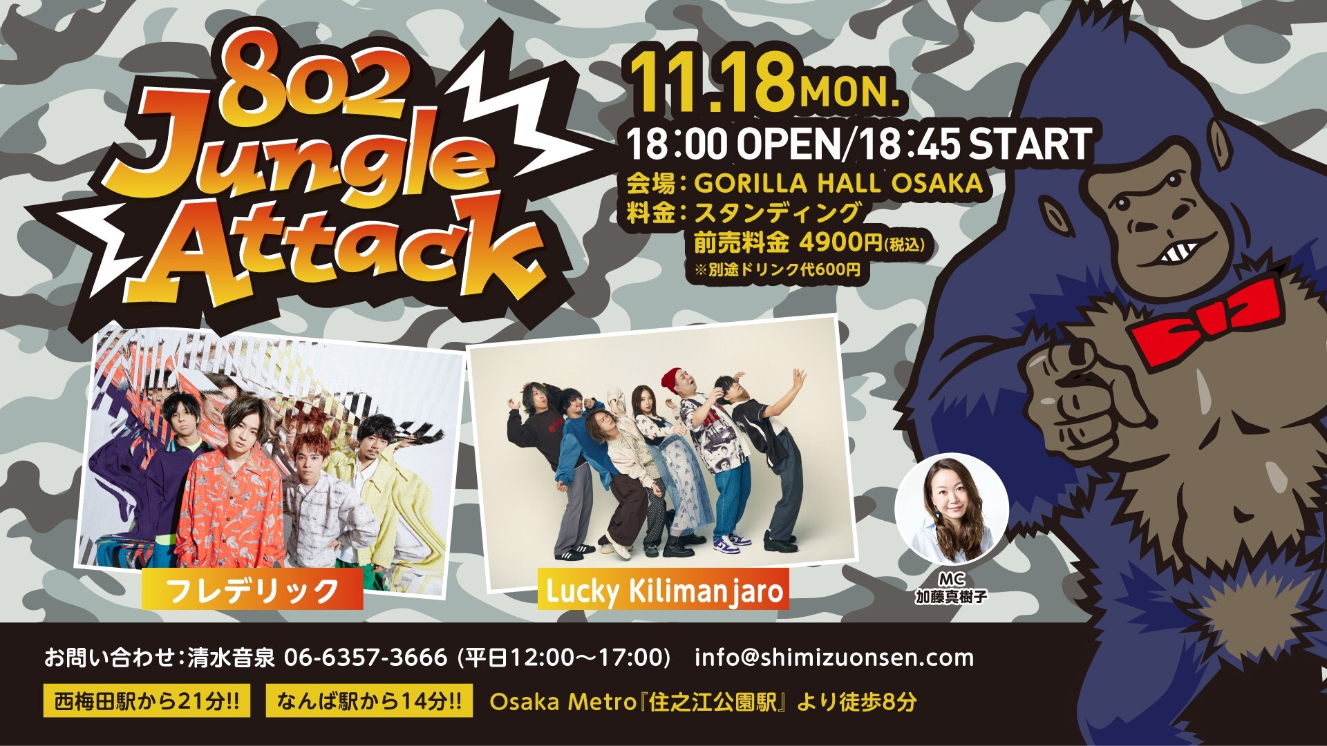 11月18日(月)、GORILLA HALL OSAKA にて第二弾となる『802 Jungle Attack』が開催される。出演はフレデリック、Lucky Kilimanjaroの2組。