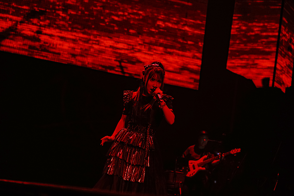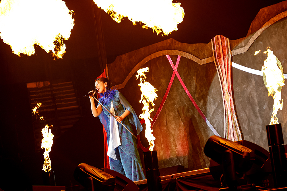 「アッツアツのバトンを受け取っちゃったので、ありったけの魂を……。貴方の魂を燃やして!」と、TVアニメ『ソードアート・オンライン アリシゼーション War of Underworld』2ndクールOPテーマの「ANIMA」を披露。「魂の色は何色ですか…」アカペラから入り、楽曲終盤に向けてのラストスパート、バックバンドの演奏にも熱が入る。チョップするように鍵盤を叩き、魂を削るように身を捩りながら悲鳴にも似たギターの音色を響かせる。