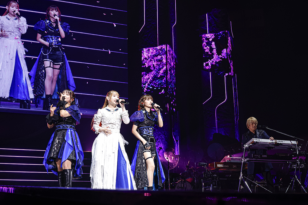 3日目のトップバッターを務めたのは、第2期が好評放送中のTVアニメ『【推しの子】』より、B小町の3人(星野ルビー役の伊駒ゆりえ、有馬かな役の潘めぐみ、MEMちょ役の大久保瑠美)。期待やプレッシャーを引き受ける役目になったと思うが、結果的にB小町以外は考えられない最高のトップバッターを演じてくれた。1期11話挿入歌の「STAR☆T☆RAIN -New Arrange Ver.-」、そして「サインはB -New Arrange Ver.-」を披露し、アニメのライブパートさながらのステージが繰り広げられた。1組目から早速、特効の火花が飛び散るアツいライブとなったが、客席も負けじと1曲目からコール&レスポンスも完璧で、誇張抜きにさいたまスーパーアリーナが揺れていた。「完璧で究極なアイドル」とはまさにこのこと。圧巻のパフォーマンスに引っ張られる形でDAY3は加速していく。
