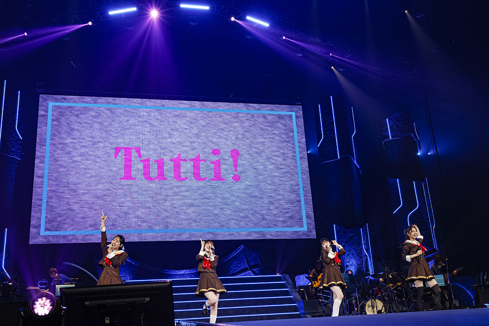 そして前半戦ラストを担当したのは北宇治カルテット。北宇治高校の制服を着た4人が姿を表すと1期ED主題歌「トゥッティ!」を披露。久美子と麗奈がずっと手を握り合っている姿が印象的だったし、緑輝と葉月は跳ねるように歌っている姿は、まさにEDそのまま。彼女らの楽曲は1期から3期まで3曲とも全て、先ほど出演していたZAQが作詞作曲を手がけていることを挙げ「(ZAQは)北宇治カルテットのママだよね。」と紹介し、そんなZAQも続く「音色の彼方」では、ピアノで参加。ここでバックバンドの皆さんの譜面台に、北宇治が使ってる譜面隠しが使われている事に気付く。芸の細かさが嬉しい。