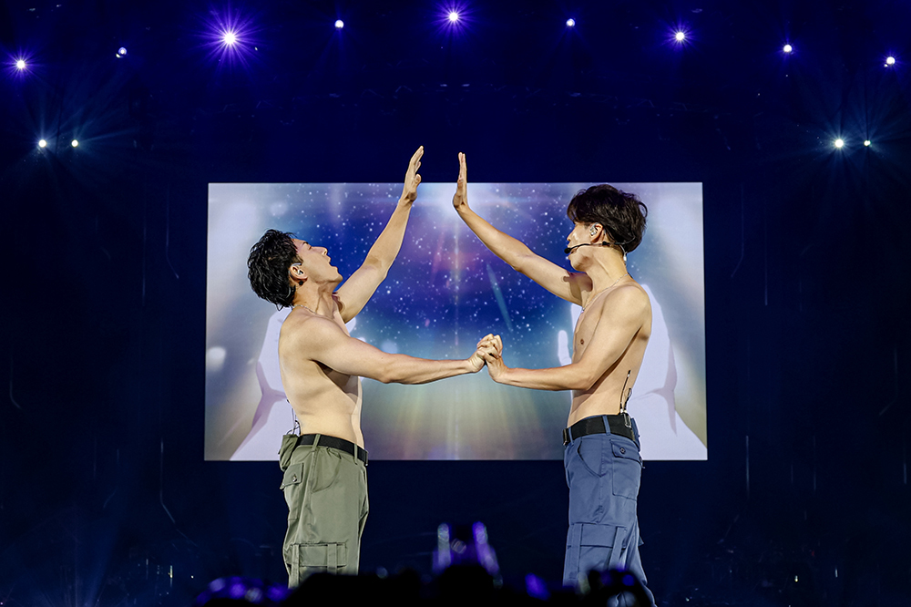アニサマ後半戦は「待たせたなアニサマ! 私の中に早く乗るんだ!」のセリフと共に、鈴村健一とブレイバーンが登場し「ババーンと推参! バーンブレイバーン」を歌い上げた。ブレイバーンの口が動くことを紹介すると、後ろに隠れて「一緒に必殺技を叫んでくれてありがとう!」と即興のアテレコが始まる。そして「みんなで一緒に叫ぼう! イサミー! アンド、スミスー!」と、イサミ・アオ(CV.鈴木崚汰)とルイス・スミス(CV.阿座上洋平)を呼び込み「双炎の肖像」を披露。EDの映像ではイサミとスミスは上裸でアツく歌い上げている訳だが、そこは今を時めく若手声優の2人。さすがに服は着てたけど、何故かだんだん上裸に見えてきたぞ。それくらいアツいデュエット……と思っていたら本当に脱いだ!。この日のために2人とも身体を鍛えて絞ってきたとのこと。いやはや、後半戦も波乱の幕開けに場内は大興奮。