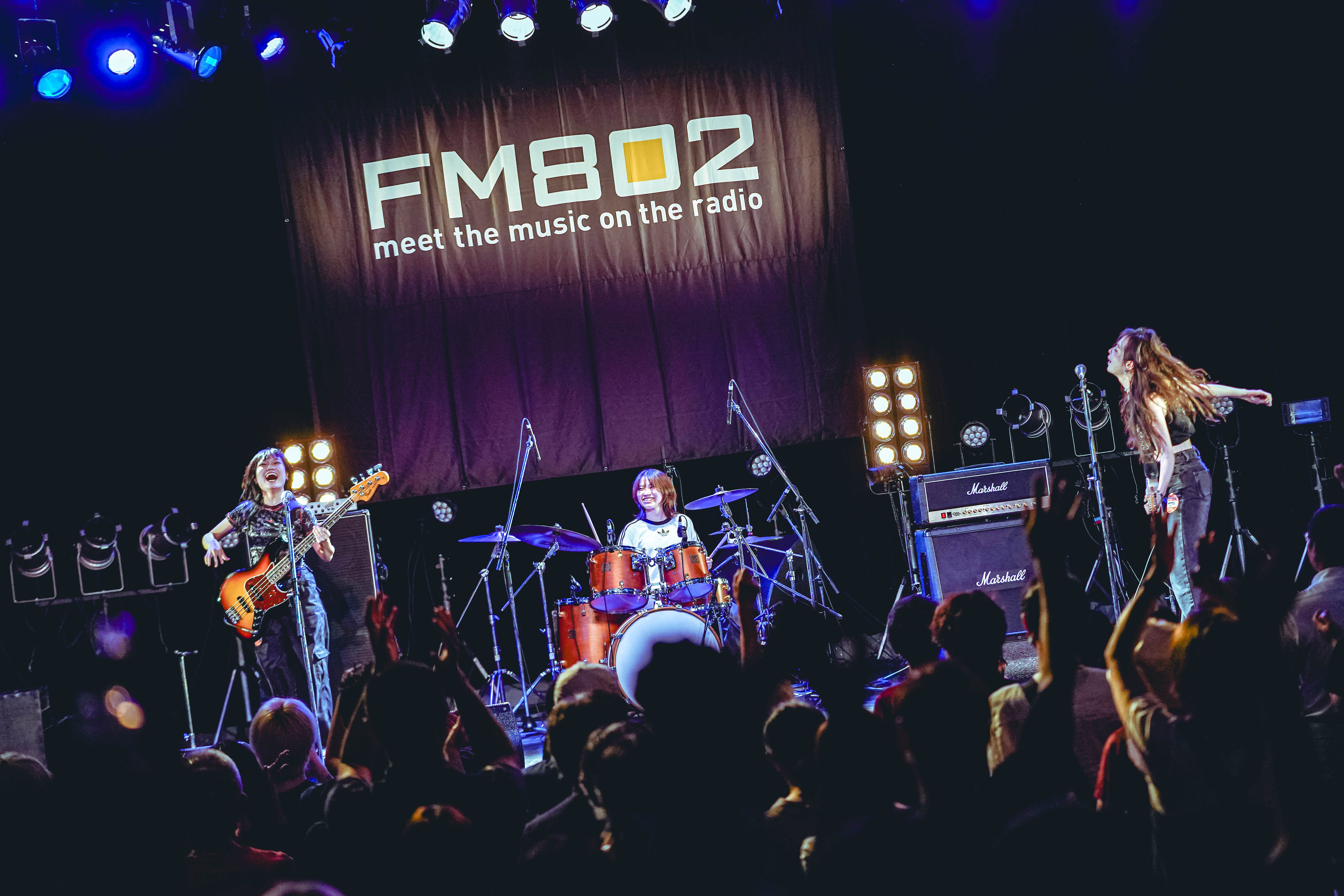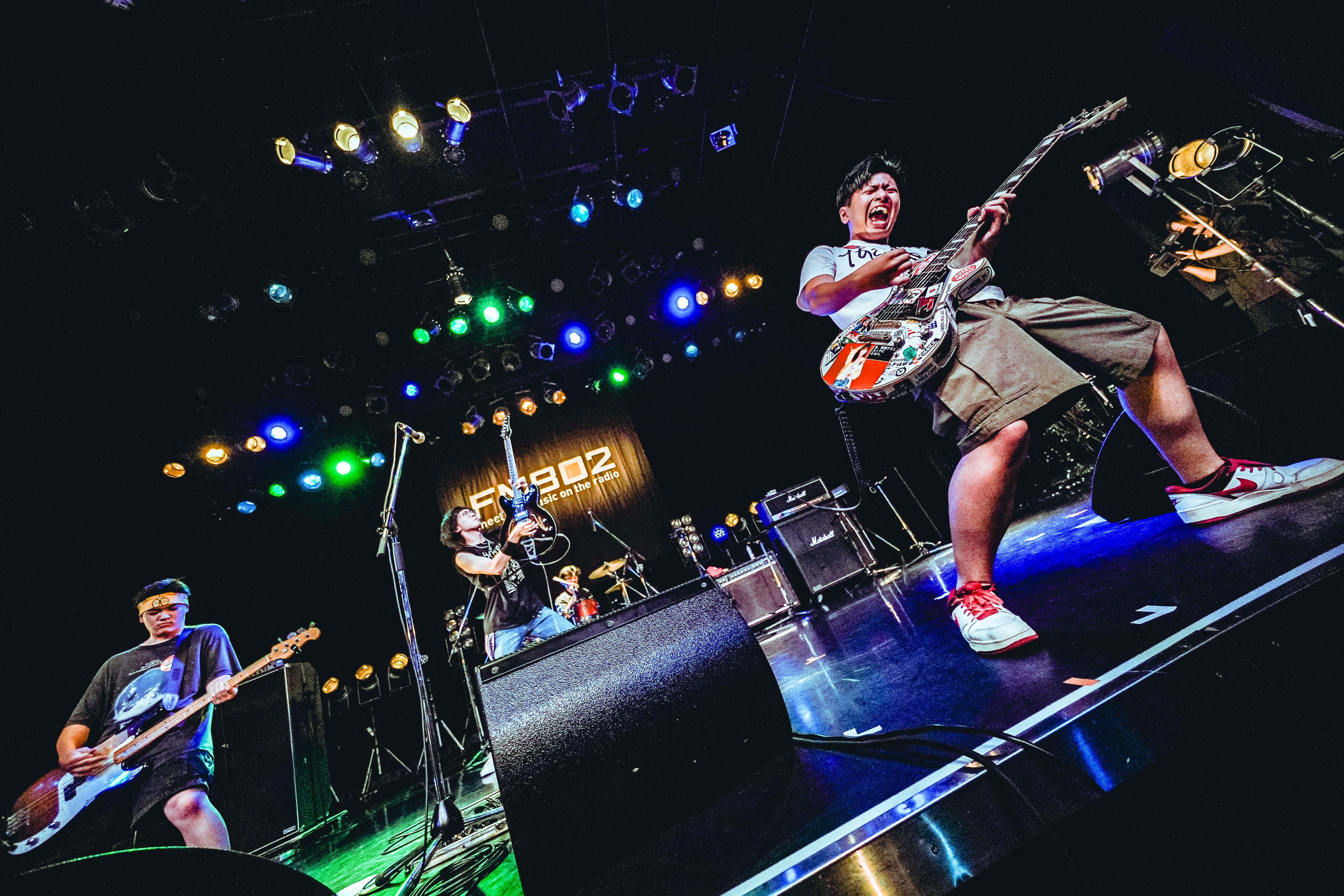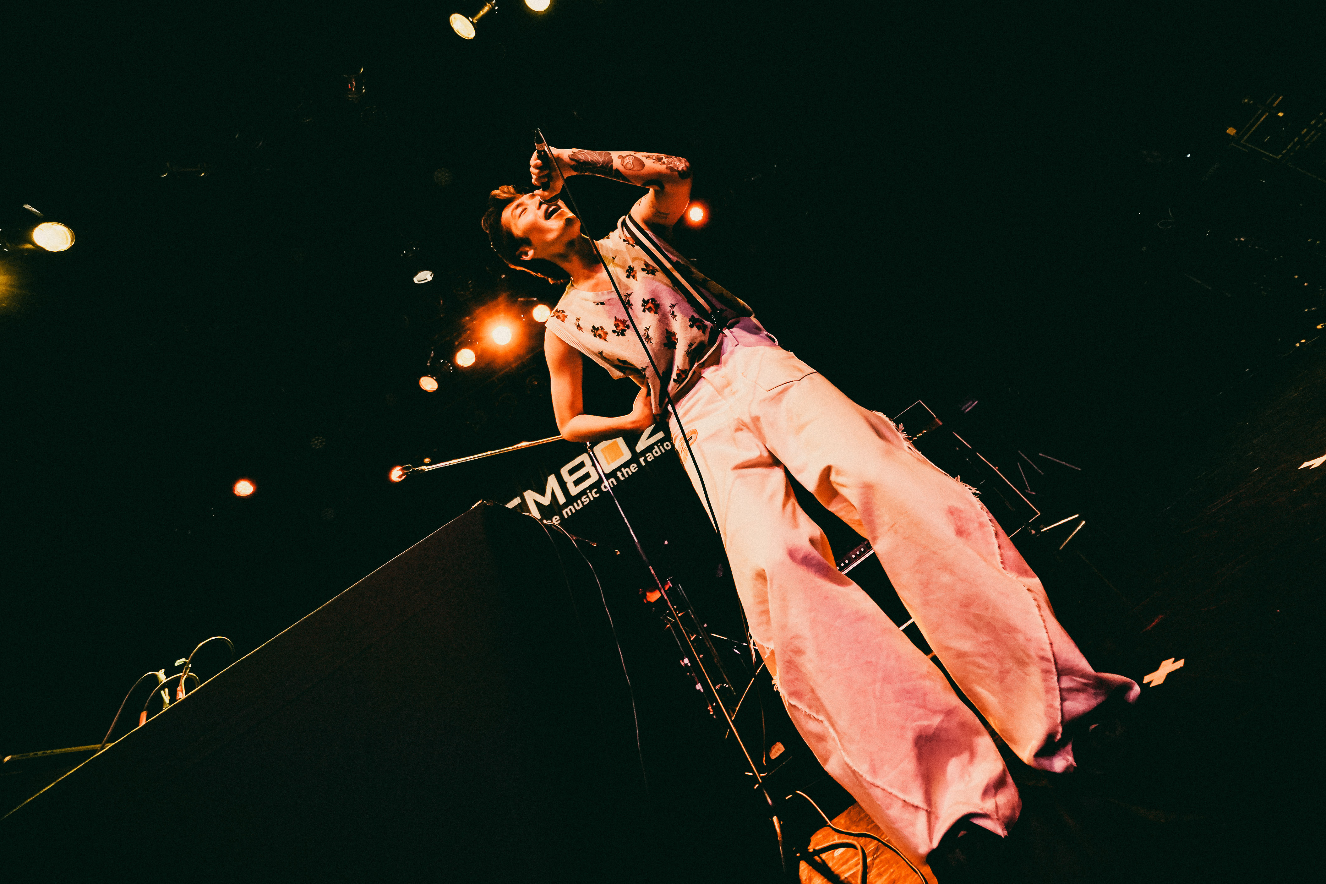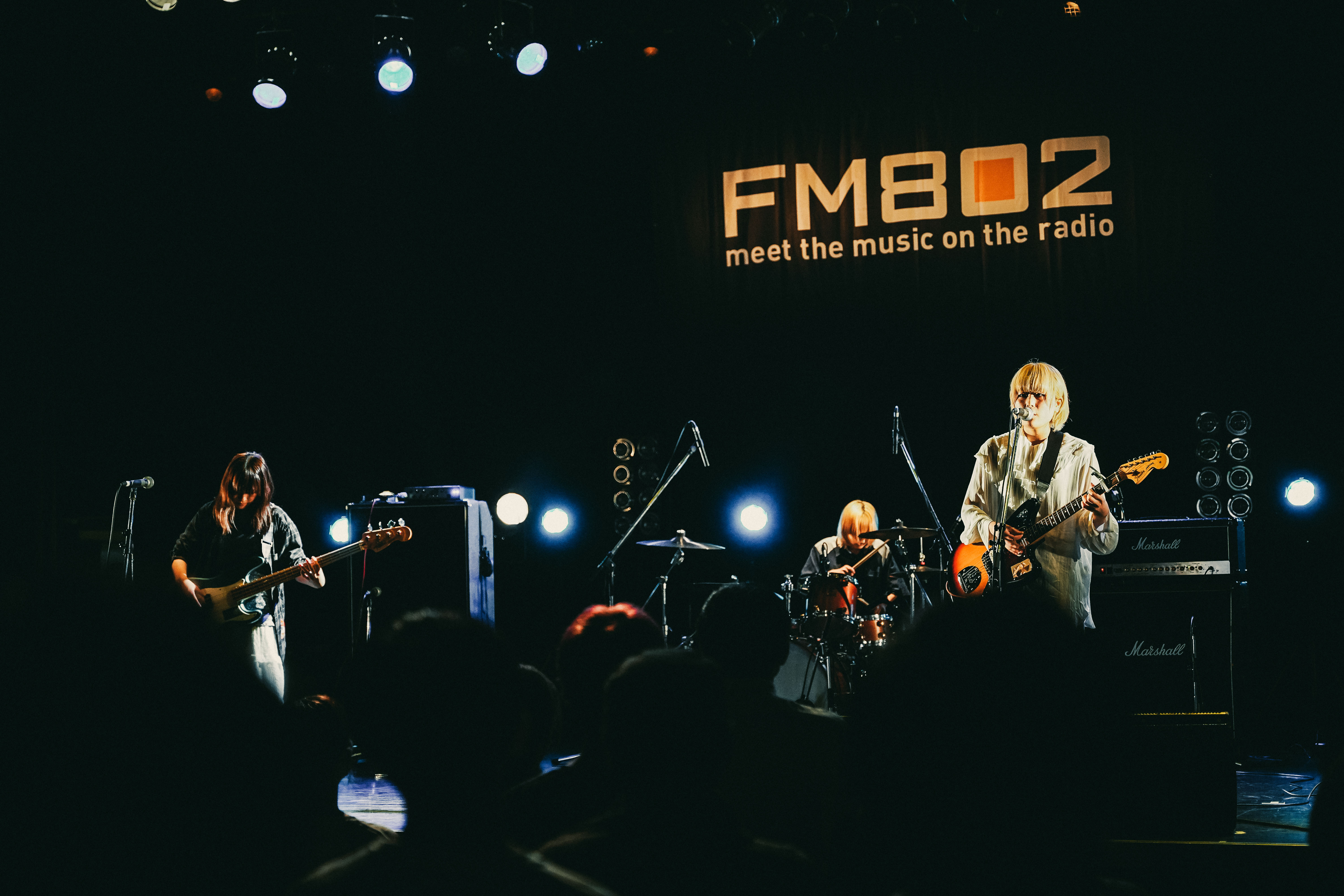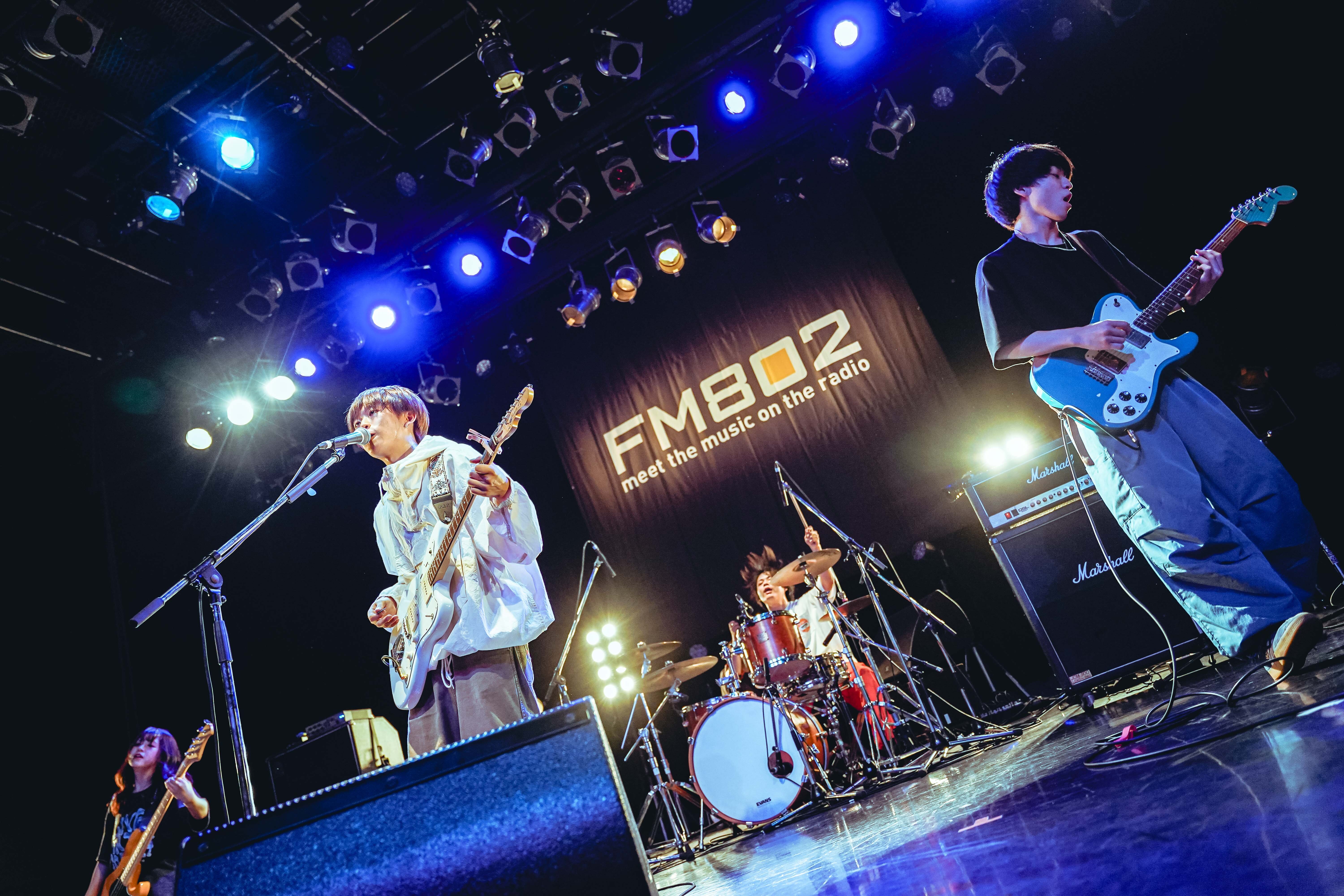 唯一のソロアクトである Manpa は、2002年生まれのヒップホップアーティスト。いざ本番となっても「お願いしゃーす」と、まるで自分の部屋にでもいるかのようにリラックスした表情で、ラップトップとターンテーブルだけのシンプルなセットから、メロウな「Sick 八苦」を投下する。「バンドじゃないんで、いい意味で味変しちゃってください。そんなこんなで 2 曲目いっちゃお!」と続けた「言う通り」ではトリッピーでドープな歌声で引き込み、フリースタイルで宣戦布告も。ラストは「GuruGuru」の不穏なトラックに長尺のリリックを乗せ、「世のお父さんお母さん、こんな息子は作らないようにお願いします」と言い残す。ライブはこの日で3回目(!)とは思えない抜群のセンス。普段は服飾専門学校に通い、音楽活動を始めるきっかけは FM802 という現役ヘビーリスナーにして、予測不可能な新鋭から目が離せない。