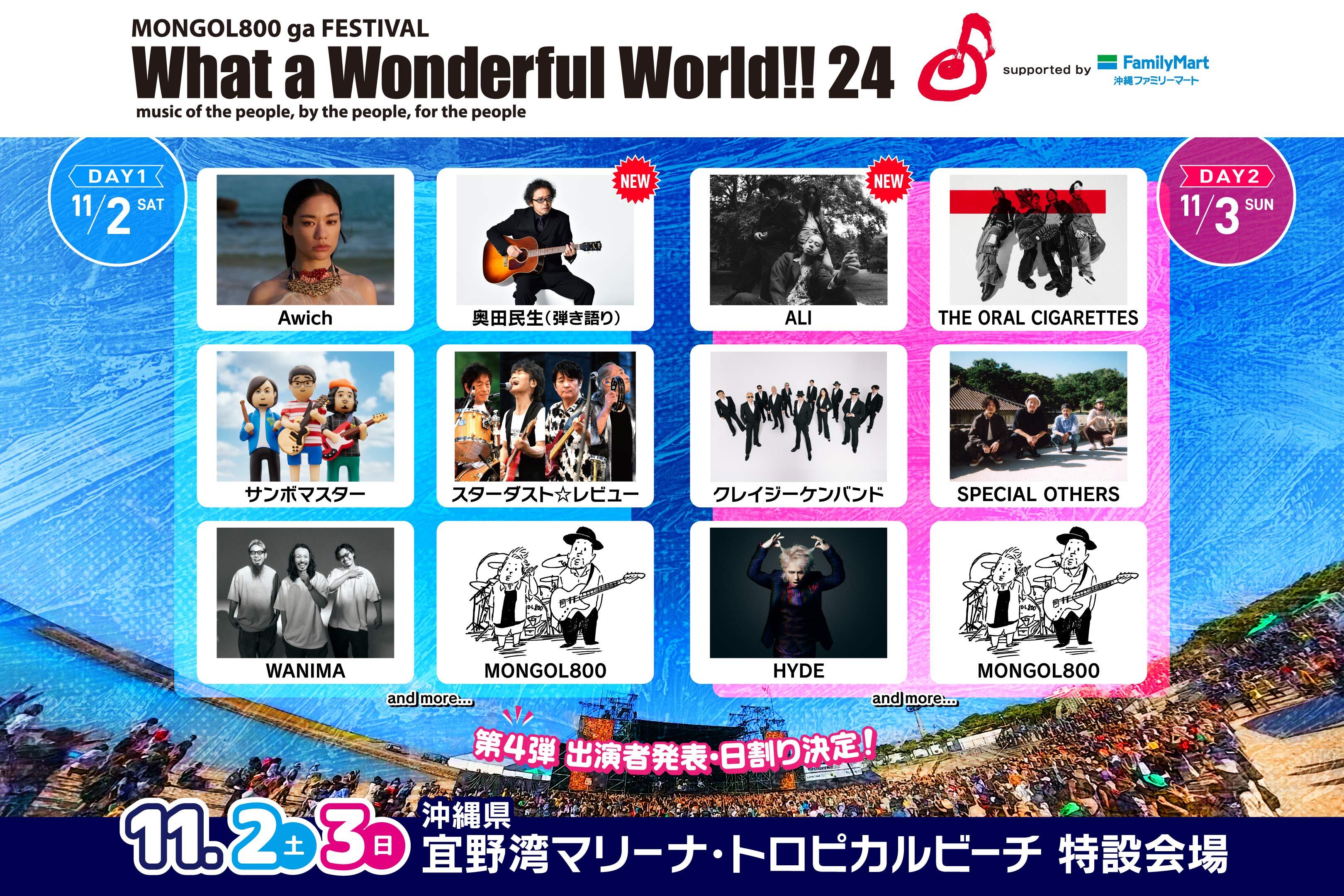 11月2日(土)・3日(日)の2日間、沖縄県宜野湾マリーナ ・ トロピカルビーチ特設会場にて開催される、MONGOL800主催の野外フェス『MONGOL800 ga FESTIVAL What a Wonderful World!!24』(『モンパチフェス』)の第4弾アーティストが発表された。