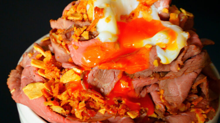 ●ステーキラボ…低温熟成のローストビーフとライスに温玉を乗せた 「温玉マウンテン ローストビーフ丼」は、夏の音楽フェスで1000食販売した逸品。