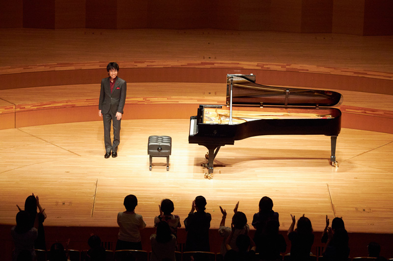 全プログラムを弾き終え、満場の拍手に応える務川。サントリーホールのステージ全面、四方向に向かって丁寧にお辞儀をする姿が印象的だった。鳴りやまぬ拍手に応えて ラヴェル マ・メール・ロワ から「妖精の園」(務川自身のピアノ独奏用編曲版での演奏)と、ショパン「英雄ポロネーズ」を演奏。最後はスタンディングオベーションの高揚感に会場全体が包まれていた。