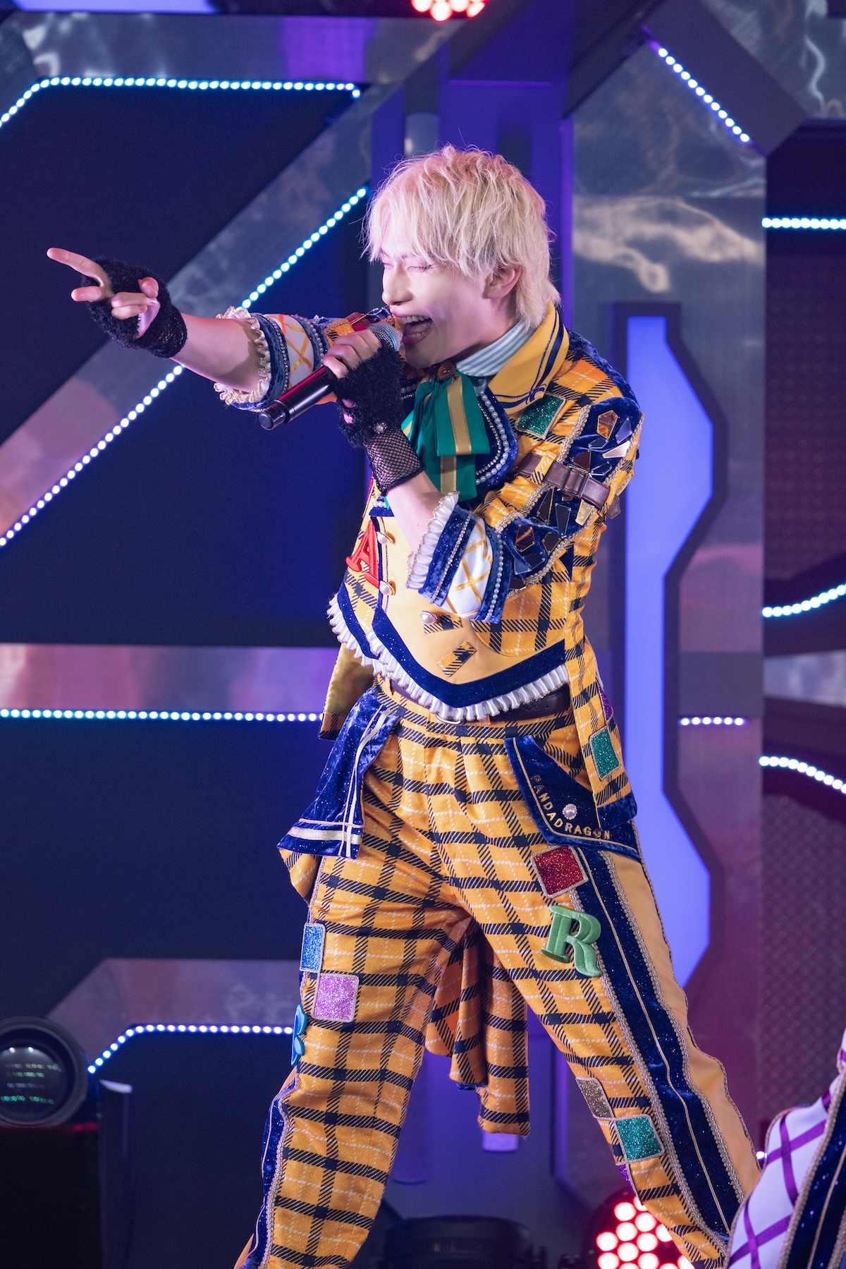 コントのような掛け合い後は、曲振りから大きな歓声があがったロックナンバー「Dragon Lance」、ファン投票でセレクトされた「NA・NA・NA」「キラリペダル」を続けて披露。ダンスや歌唱だけではなく、クールで色っぽい表情でも魅せる3曲。彼らの気迫に応えるようなヴィーナス・ゼウスの掛け声、レーザーライトの演出も合わさり、会場が芯からじわじわと熱くなっていくのが分かる。