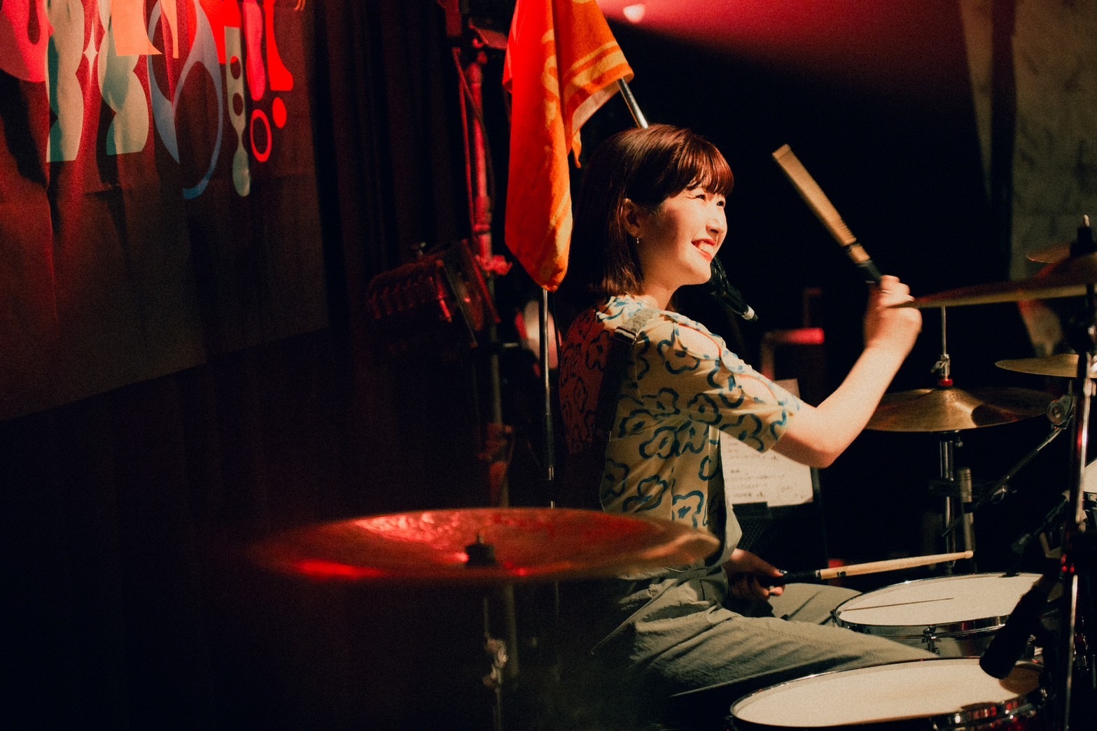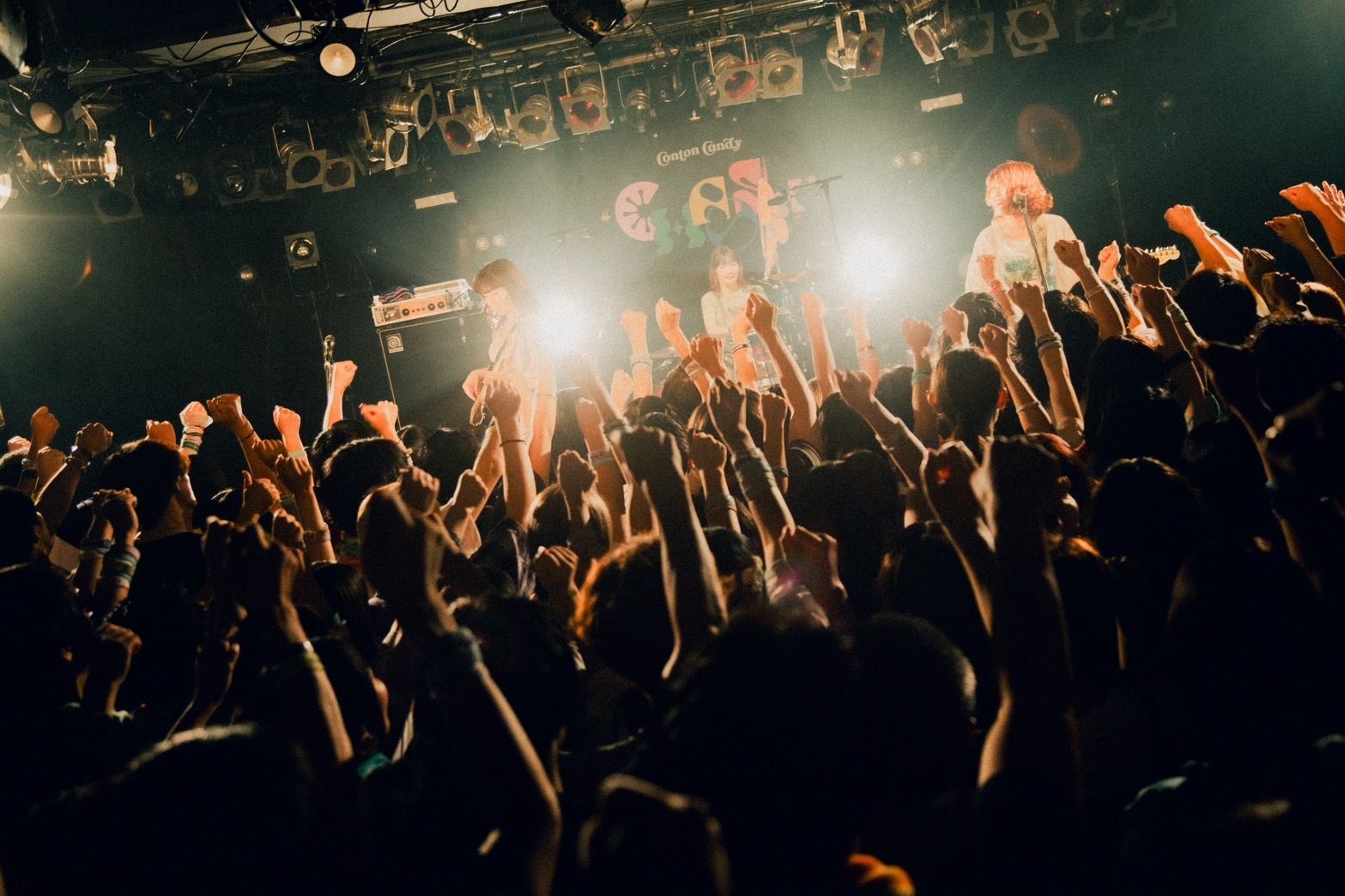 アンコールを求める手拍子に応えてステージに戻ってきた3人は、ステージの前方に並んで歓声を浴びた。演奏中はドラムセットから離れられない彩楓は、この瞬間を楽しみにしているらしい。「ライブハウスって本当に思いもよらぬ化学反応が起きたり、“このバンドとこのバンドが一緒にやるんだ?”っていう企画も実際に行ってみたらめちゃめちゃ良い1日になったりします。そういう魔法みたいな特別な力を持っている場所がライブハウスだと思っています。これからもそういう場所を大切にして頑張っていきますので、私たちの小っちゃい背中についてきてくれると嬉しいです」と紬衣が語った後、1stフルアルバム『melt pop』が10月9日にリリースされる旨が発表された。「Conton Candyの頭皮から足の裏までわかる1枚になっておりますので!」という紬衣の言葉が示していた手応えと達成感。そしてアルバムに収録される「急行券とリズム」が初披露された。広い空へと飛び立つかのようなサウンドを楓華と彩楓のコーラスが一際心地よいものにしていたのが思い出される。3人の演奏と歌のコンビネーションの良さを再確認できる新曲だった。