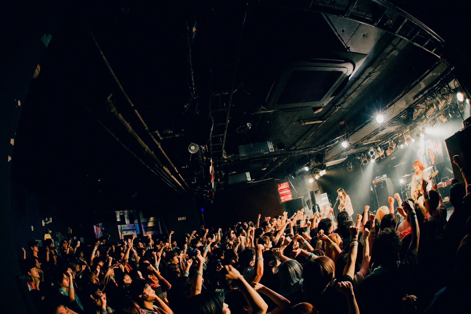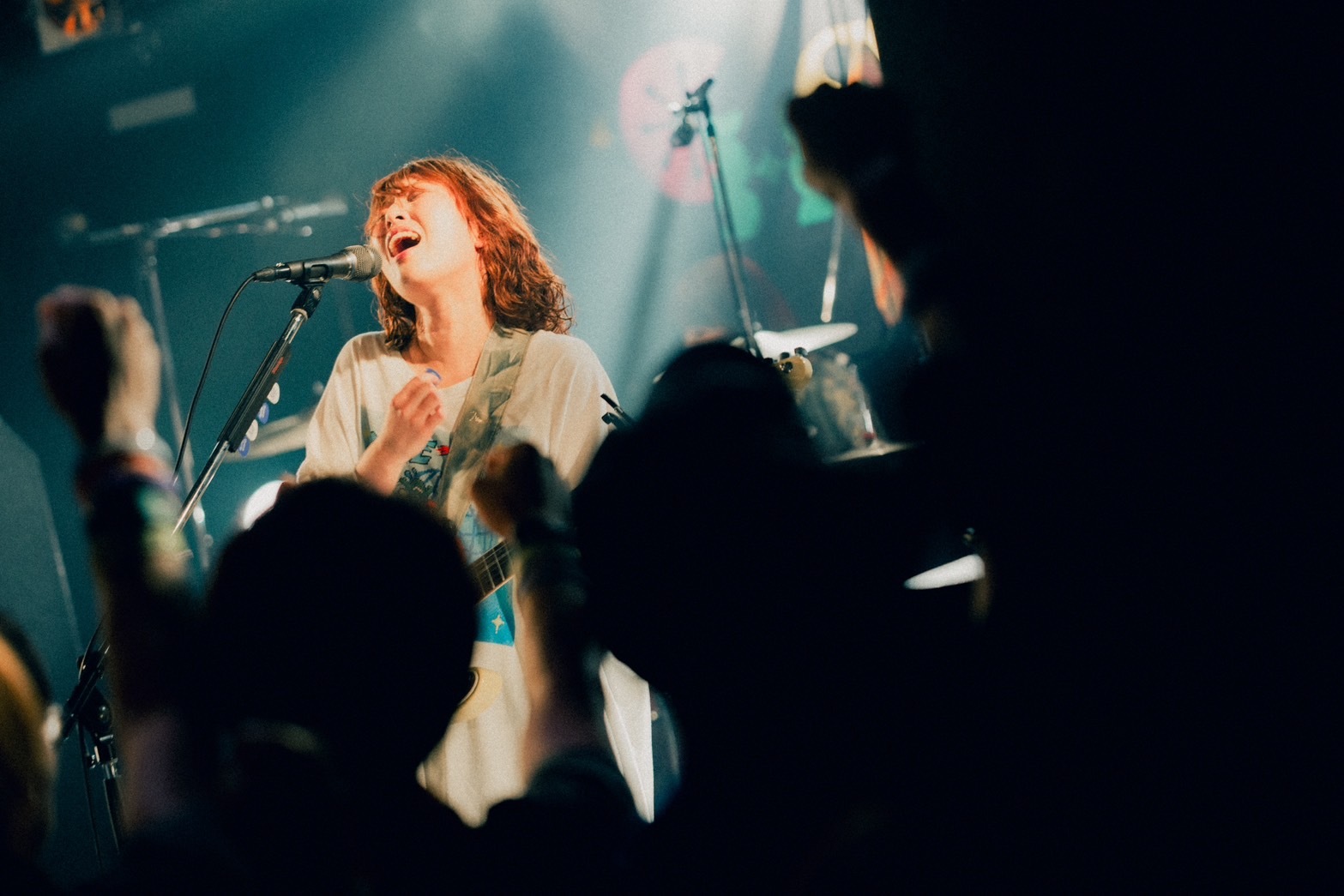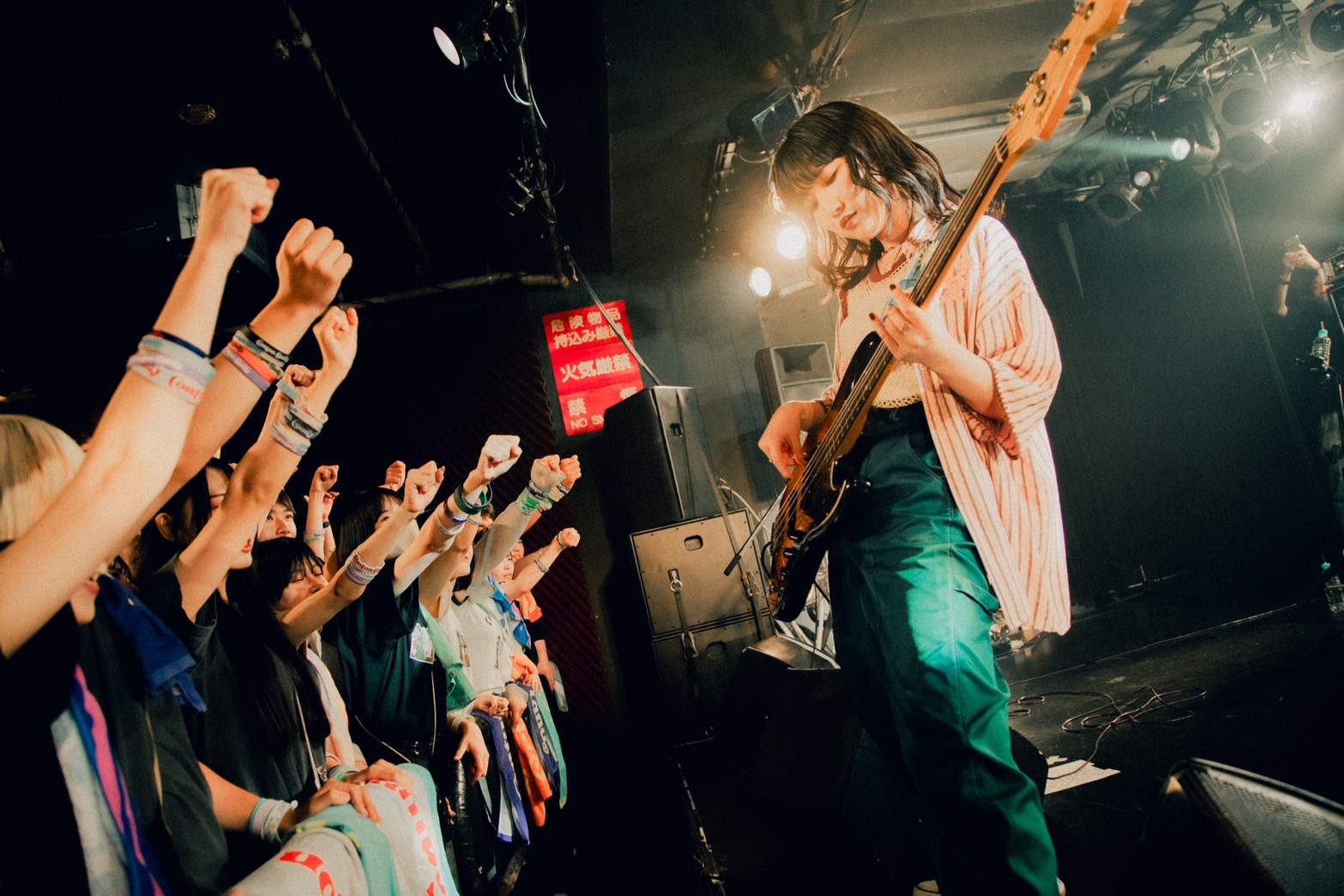 オリジナルグッズのタオルを掲げて彩楓(Dr./Cho.)と楓華(Ba./Cho.)が現れたのに続いて紬衣(Vo./Gt.)も登場。準備を整えた3人が手を重ね合った後、「好きなものは手のひらの中」がスタートした。強力なナンバーがいきなり飛び出し、一気に興奮状態となったフロア。拳を突き上げる観客の勢いがものすごい。その後に披露された「baby blue eyes」と「プードル」は、力強い手拍子を誘っていた。会場を満たした熱気を射抜くかのような紬衣の歌声が絶好調。エネルギッシュなバンドサウンドの中で埋没することなく、輝度をどんどん増す様が素敵だった。
