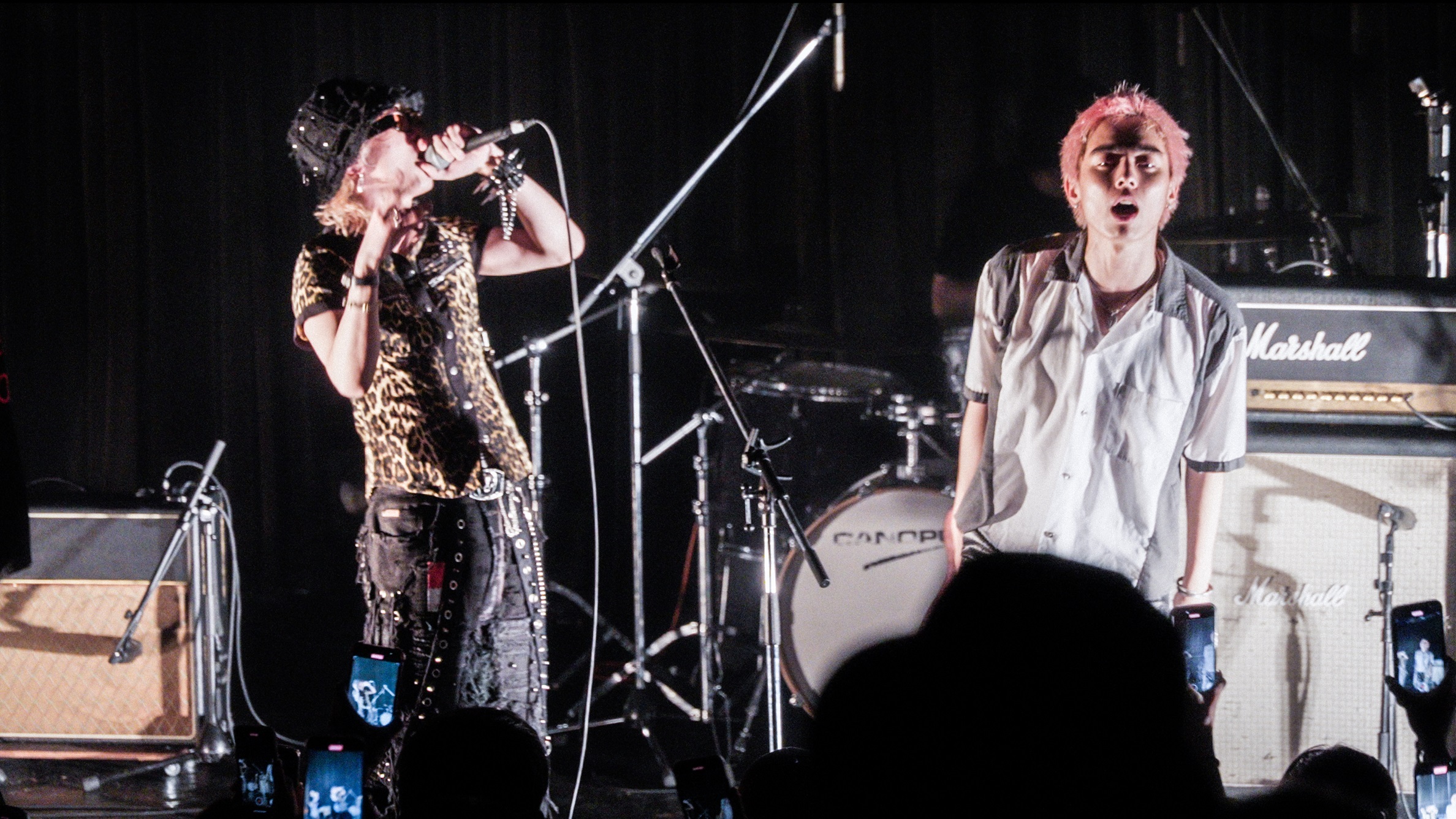 「you hate caffeine」のソリッドで中毒性の高いリフを繰り出す、ストイックなギタリストはKyazm。たぶんポップと言ってもいい、メジャーコードのキャッチーなメロディが耳に残る曲だ。4曲目「OK」まではニューEP『Monkeys』からの曲を畳みかけて一気に飛ばす。ギターを外してマイクで歌う、Linna Figgの細身の身体にはいかしたパンクスのムードがある。ただし楽曲のイメージはパンクというよりはニューウェーヴ、いやノー・ウェーヴか。ひきつったノイジーなギター、執拗に繰り返すシンプルなコード、時にポエトリーに聴こえるラフなメロディ、ラップを感じるフロウ、そして叫び。「pink head」のような、内省的でメランコリックなミドルチューンも含め、新世代ミクスチャーの香りがぷんぷんする。アコースティック・ギターの弾き語りで「7」をやったのは、意外だったがはまっていた。ライブだと意味まで伝わりにくいが、Linna Figgが詩人であることはよくわかる。