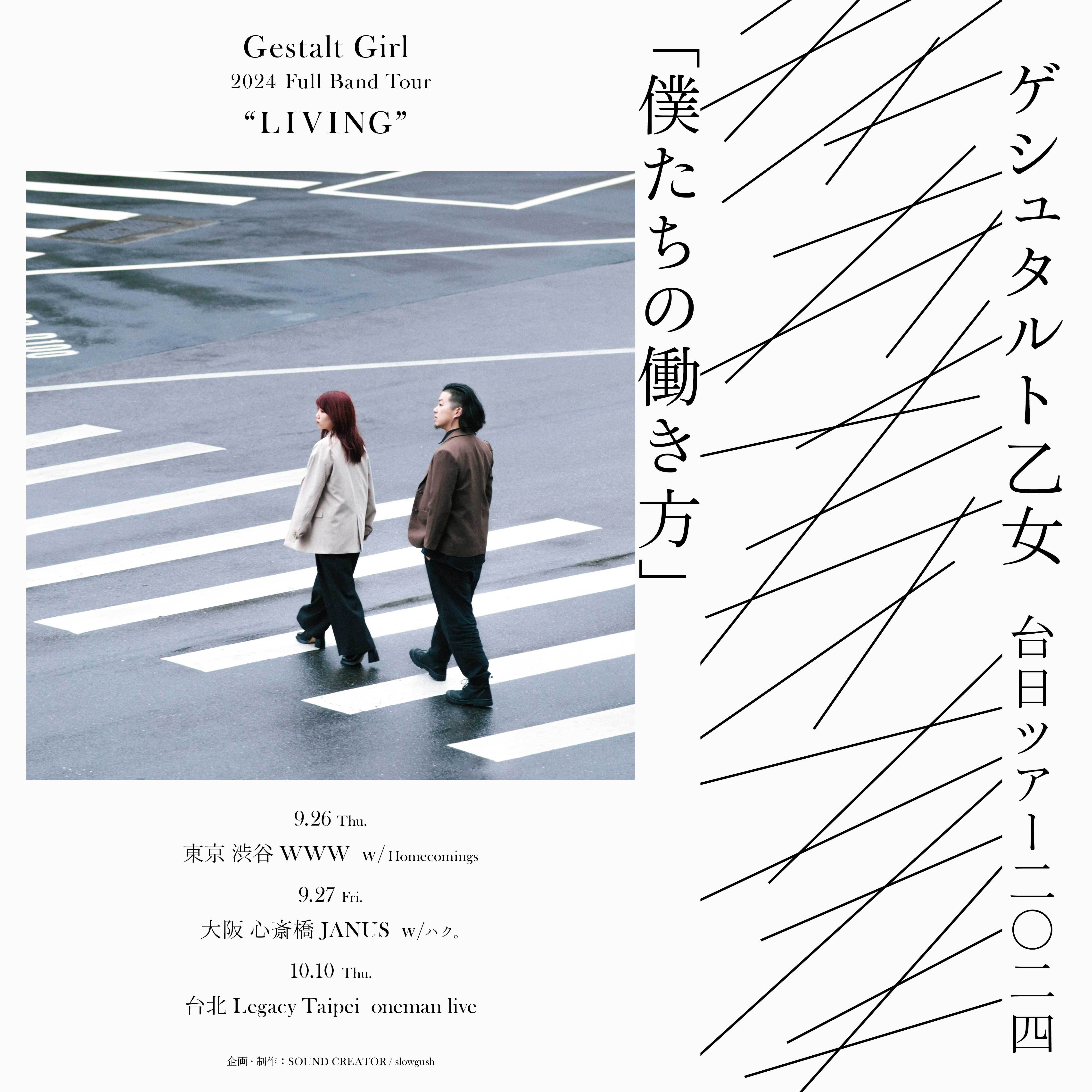 『ゲシュタルト乙女 台日ツアー2024 “僕たちの働き方”』は、東京は9月26日(木)渋谷 WWW、大阪は翌日の9月27日(金)心斎橋 JANUSにて開催。ツアーファイナルは、10月10日(木)に台北・Legacy Taipeiでのワンマンライブとなる。は一般発売中。