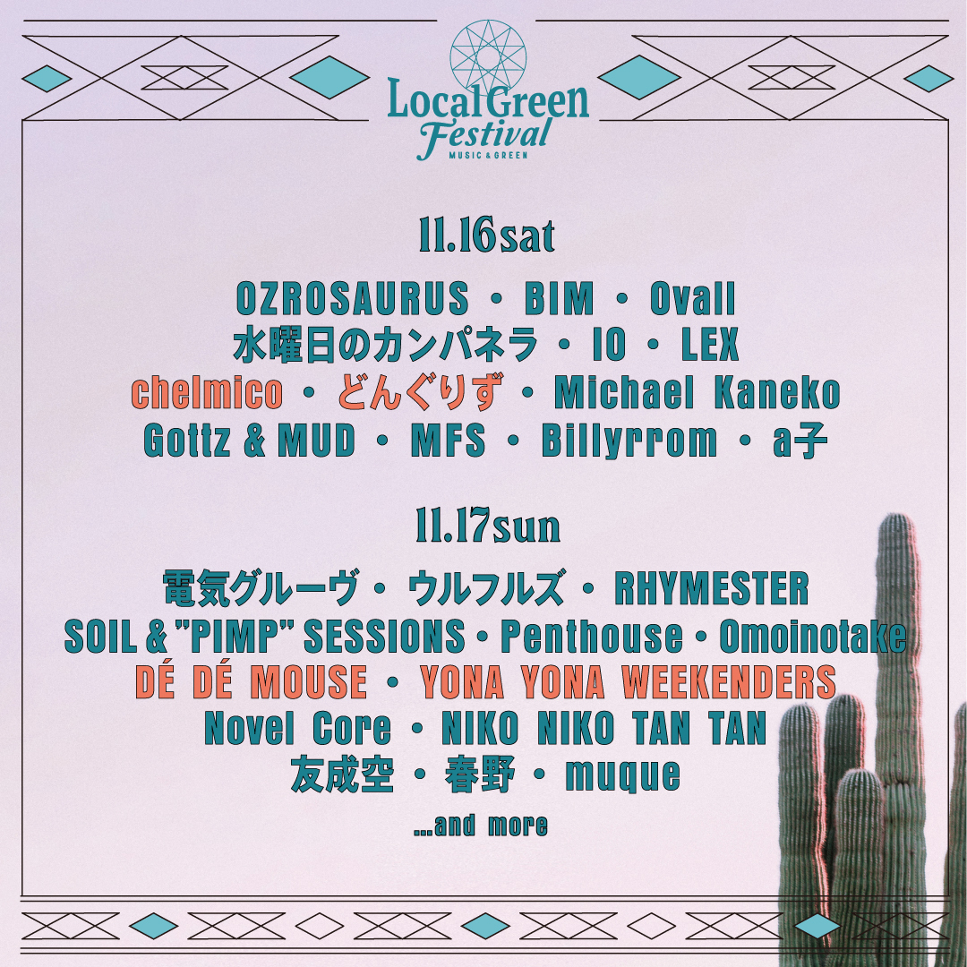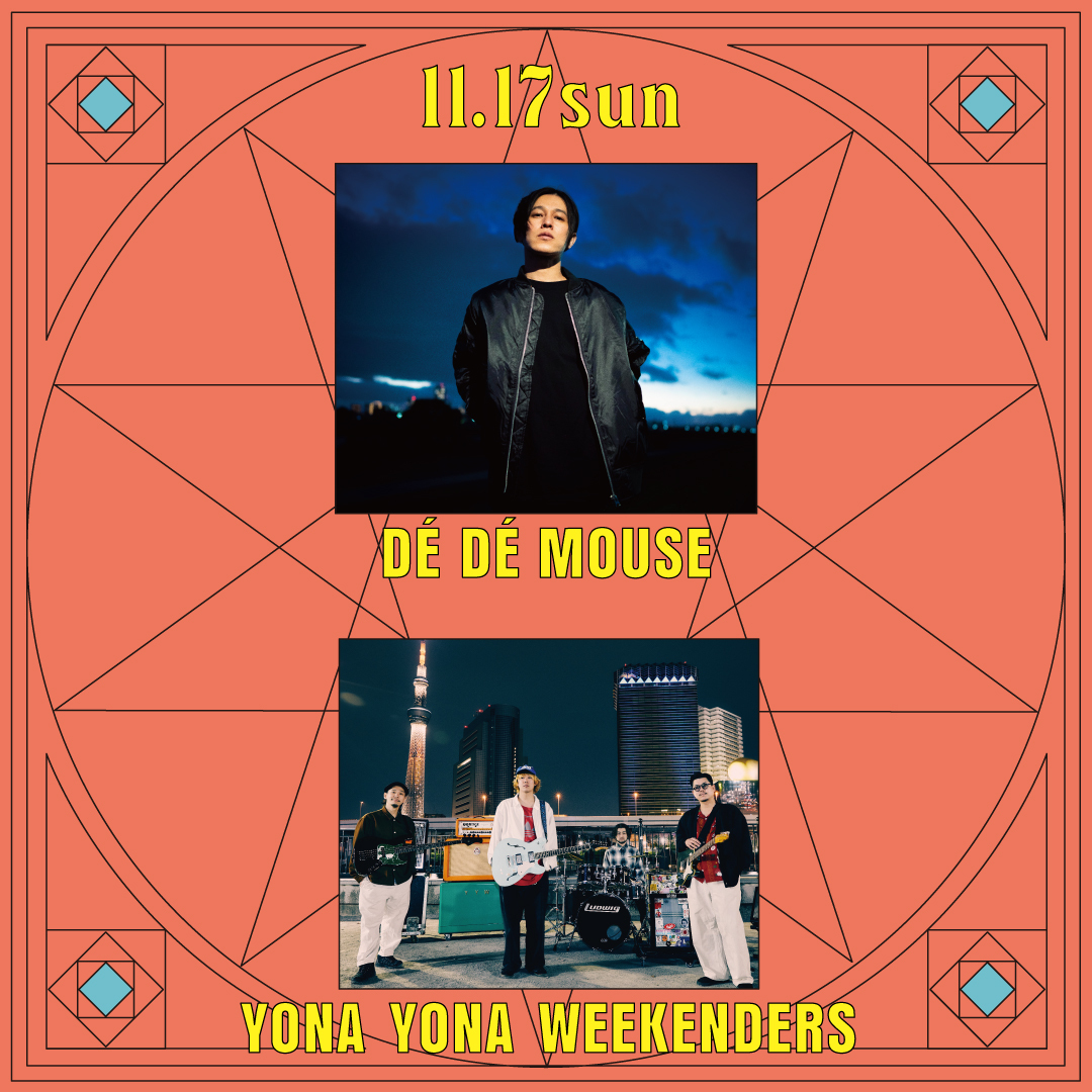 2日目の11月17日(日)には、遠藤大介によるソロユニット、緻密に重ねられたオリエンタルなメロディとドリーミーなサウンドで、幅広い層からの人気を誇るDÉ DÉ MOUSE、“ツマミになるグッドミュージック” を奏でるメロコア・パンク出身の4人組バンド・YONA YONA WEEKENDERSの出演が発表された。