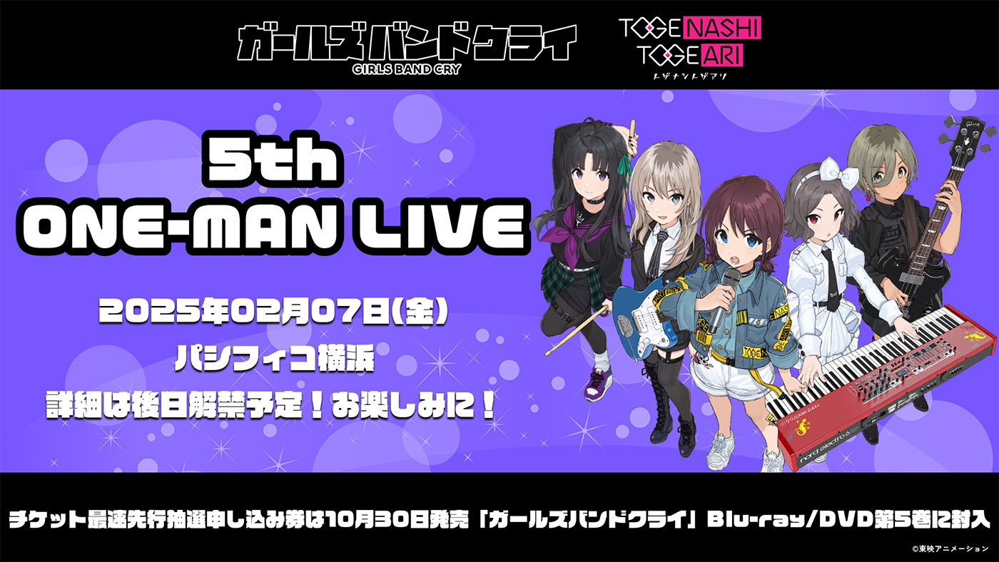 まず来年2月7日(金)に開催される5th ONE-MAN LIVEはパシフィコ横浜で開催されることが発表された。日々進化し続けている彼女達が初めて立つ大舞台でどんなパフォーマンスを見せてくれるのか、今から期待が高まる。同公演のライブチケット最速先行抽選申し込み券は10月30日(水)に発売するTVアニメ『ガールズバンドクライ』Blu-ray&DVD第5巻に封入される。