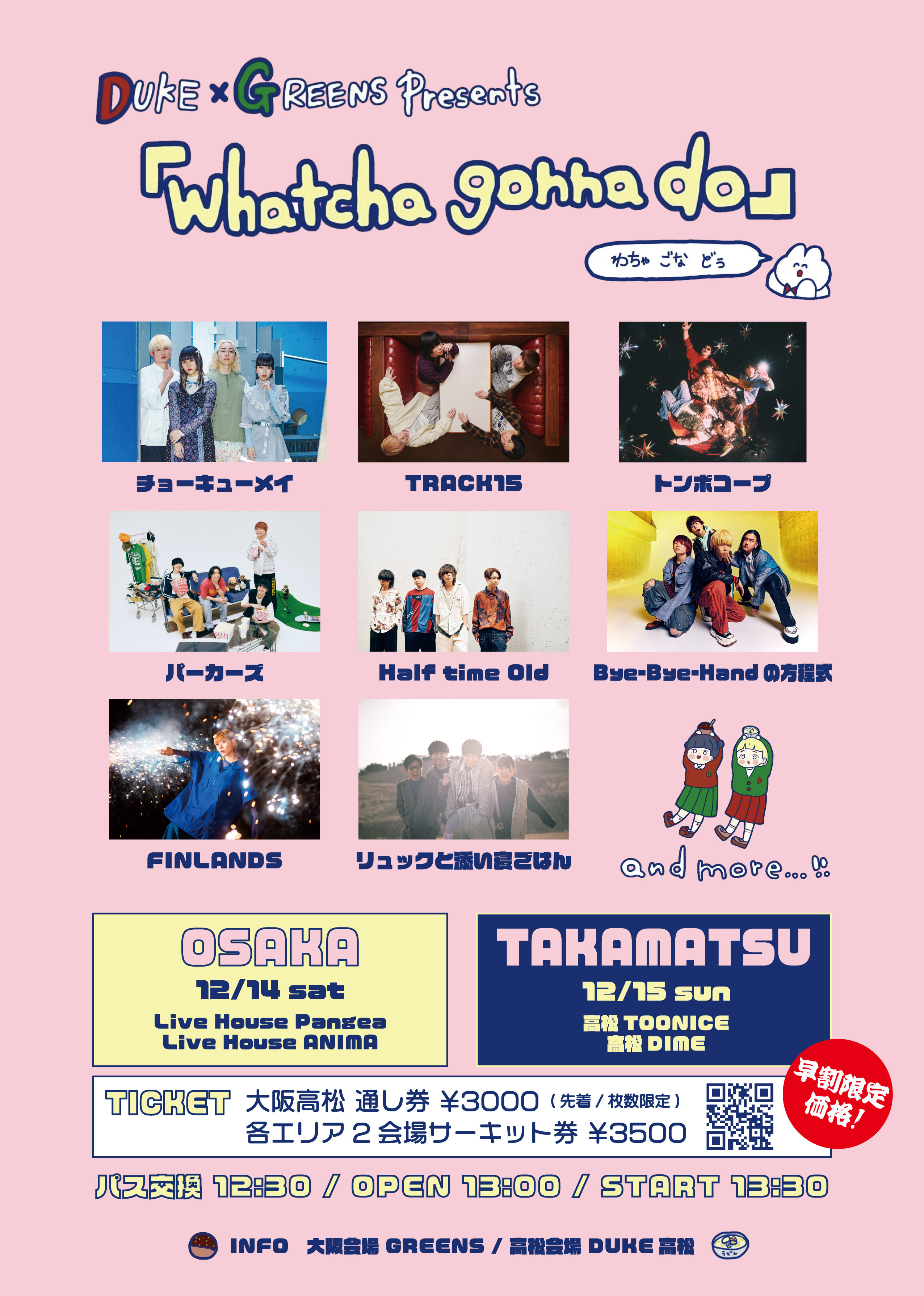 関西のイベンター・GREENSと、四国のイベンター・DUKEの共同イベント『whatcha gonna do』が、12月14日(土)に大阪のライブハウス2会場、12月15日(日)香川・高松のライブハウス2会場でのサーキットイベントとして開催される。