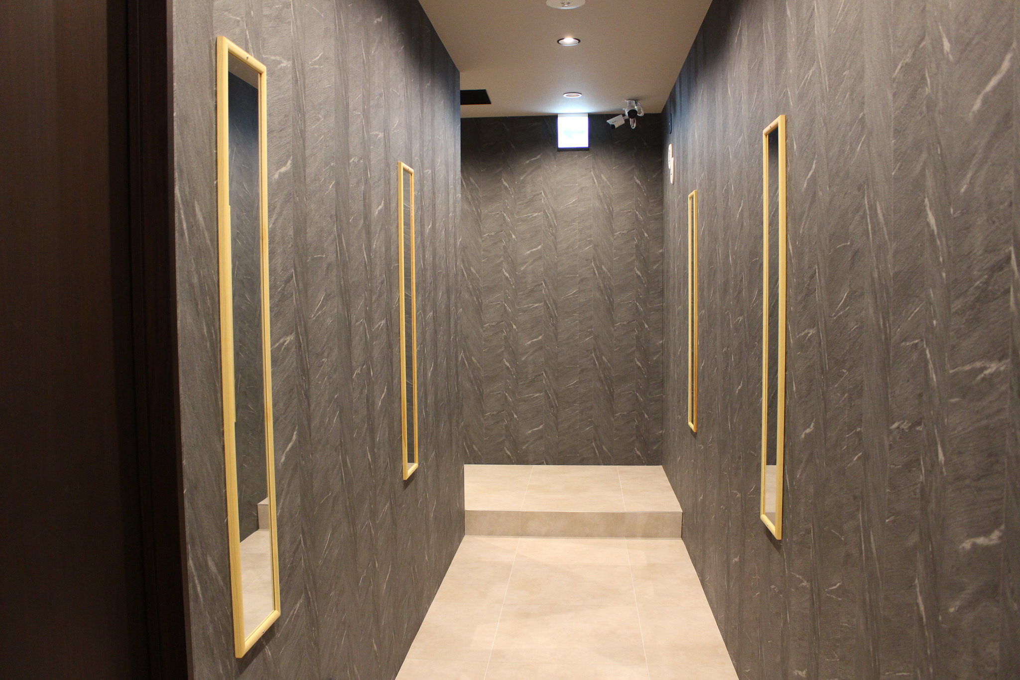 トイレや喫煙所は、フロア上手後方の扉を抜けた先に。ドアを開けると眼前に広がる通路の奥に位置している。ちなみに、グレーを基調としたスタイリッシュなムードの同通路は、物販や休憩エリアとしての活用を予定。松藤氏は、壁面に設置されたモニターについて「いずれ、ライブの様子も観れるようにしたい」と語ってくれた。また、トイレの外に鏡が設けられているのも嬉しいポイントとなっている。