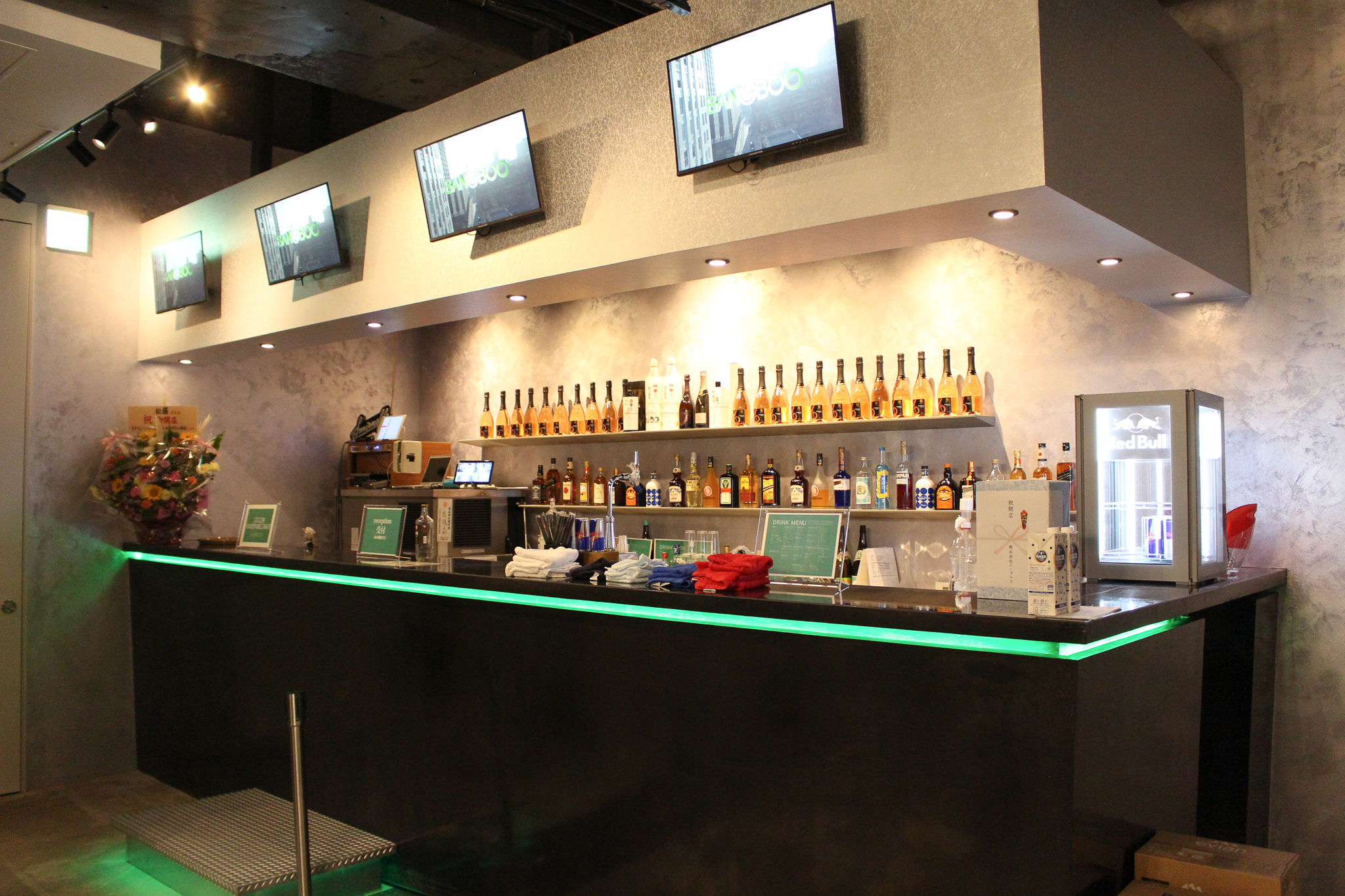 そして、ステージ背面とホールの各面に設置された大型のLEDパネルは、「BANGBOO」の大きな特徴だ。オーナーの松藤光軌氏が「ベースオントップが運営する他会場との1番の違い」と語る、オーディエンスをぐるりと囲むLEDパネルは圧倒的な存在感を放っており、映像を活用したライブやバンドロゴの投影を予定しているそう。クラブイベントとの連動も含め、活用方法はまだまだ模索中とのことで、無限に広がる可能性にも期待が高まる。