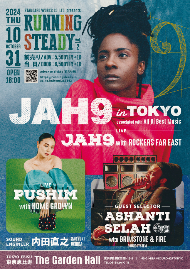 ジャパンツアー初日公演『RUNNING STEADY vol.2 ~JAH9 In TOKYO~』では、Jah9がROCKERS FAR EASTをサポートバンドに出演。日本レゲエ界からは、PUSHIMがHOME GROWNを引き連れて参加する。サウンドエンジニアは、内田直之が担当。UKからは、ミュージシャン/ダブプロデューサーのASHANTI SELAHも初来日し、BRIMSTONE&FIREのサウンドシステムでフロアに登場する。